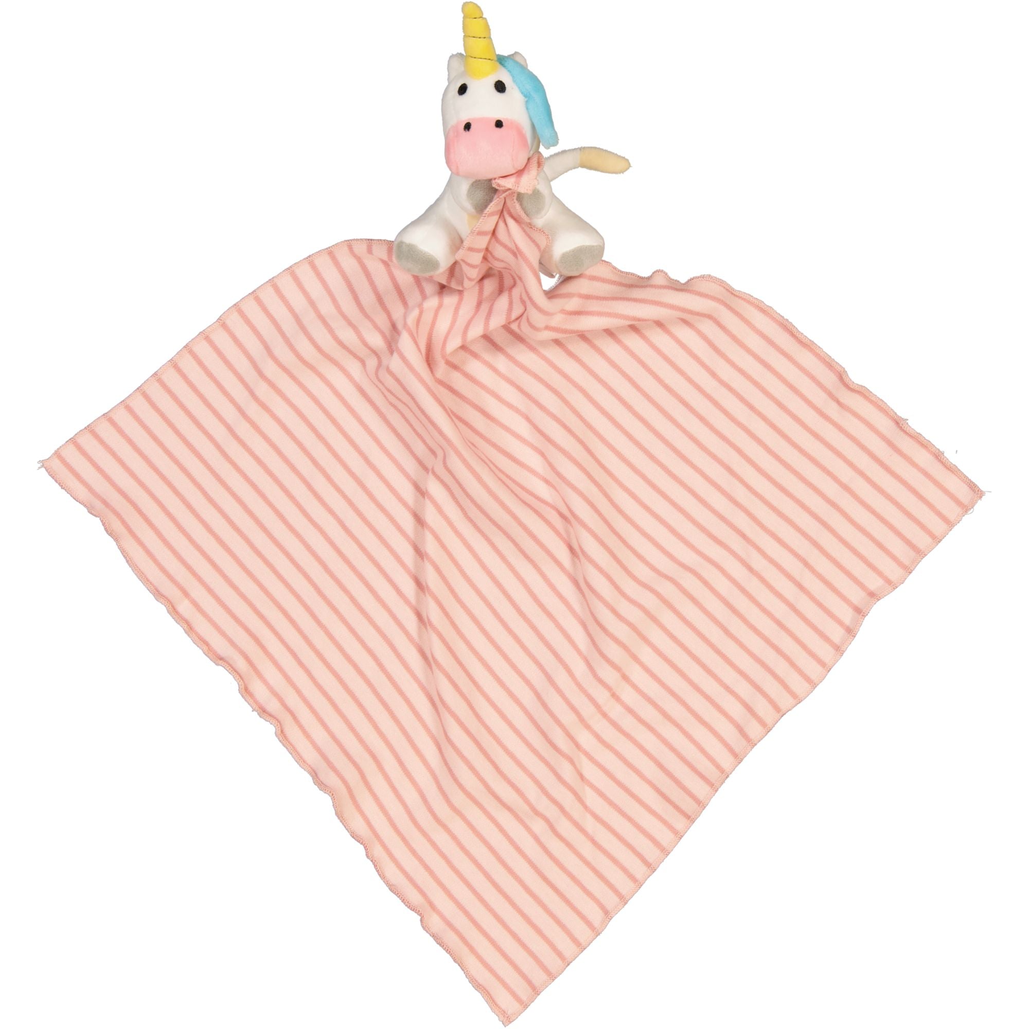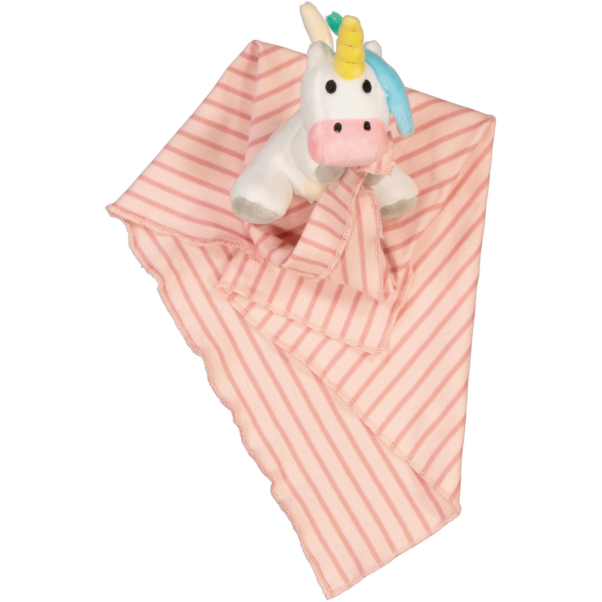 Snuttefilt i rosarandig bomullstrikå med enhörningshuvud. Mjuk och härlig som lätt blir en favorit. Filten är 40x40 cm.