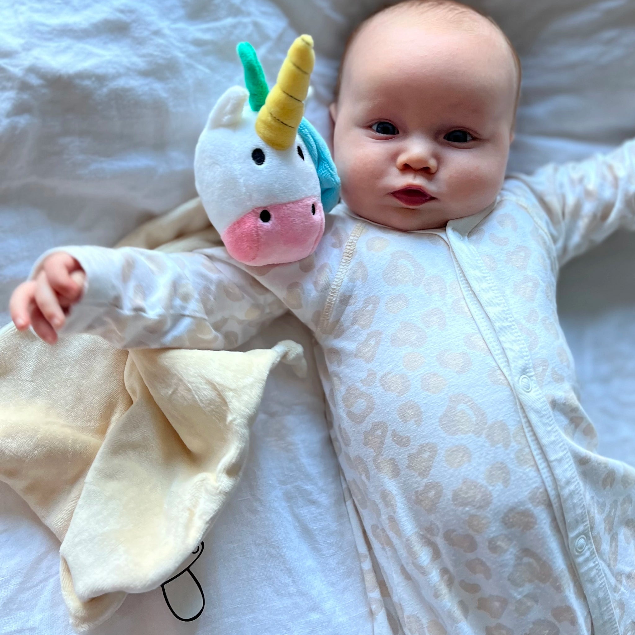 Snuttefilt i beige velour med enhörningshuvud. Mjuk och härlig som lätt blir en favorit. Snutten har en napphållare i ena hörnet. Filten är 25x25 cm.