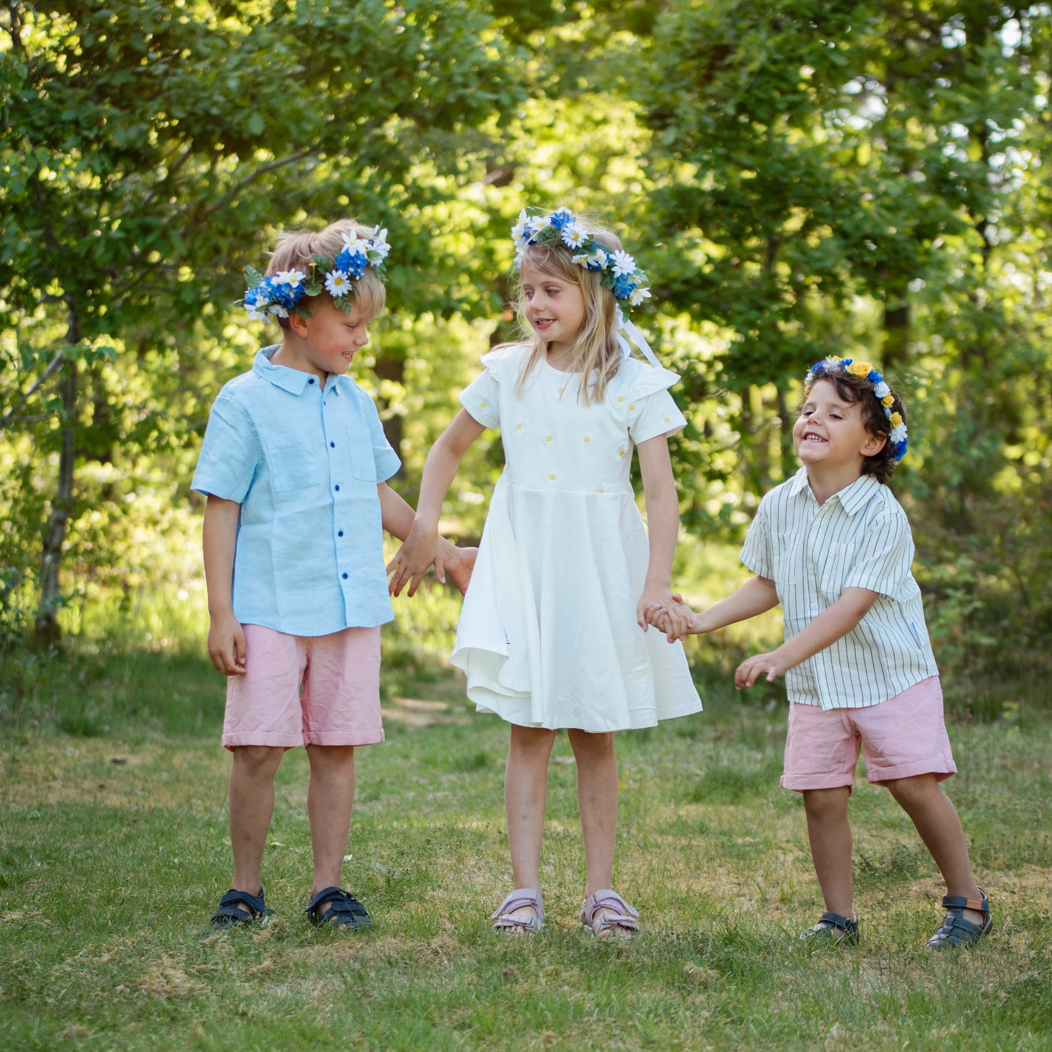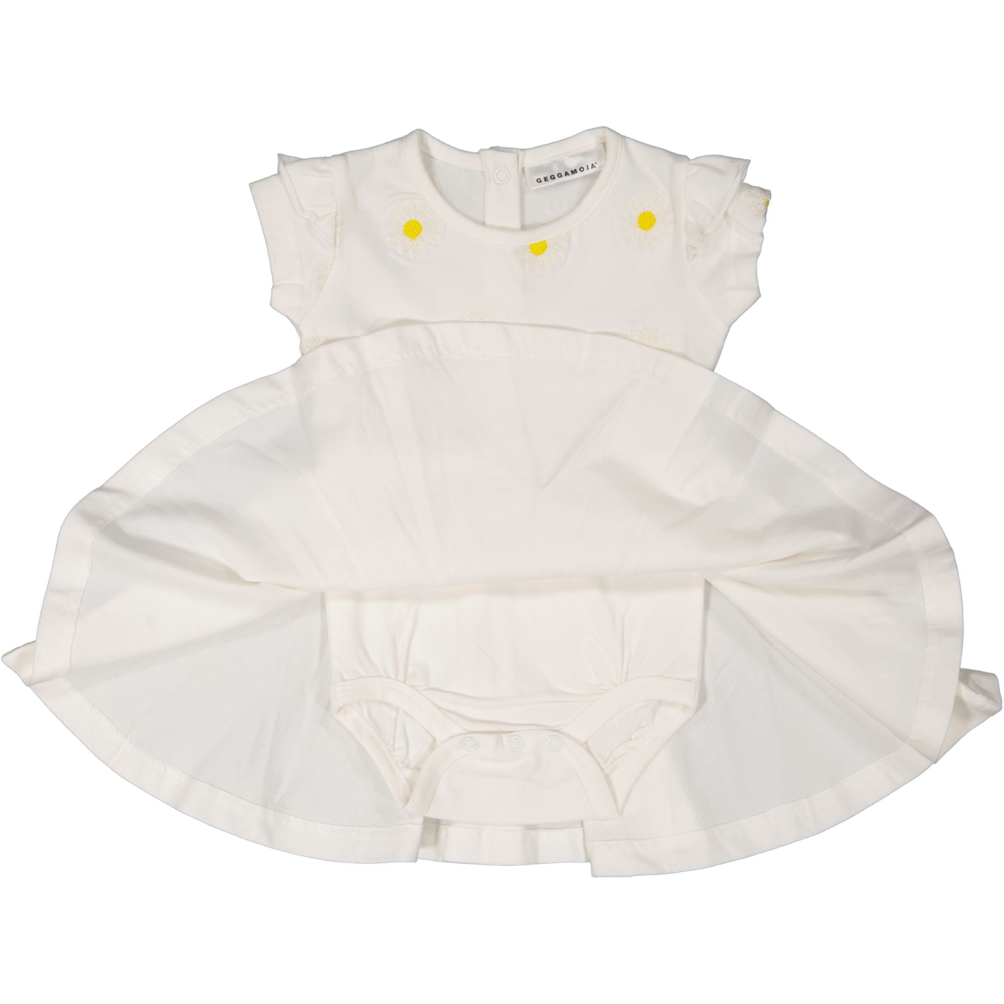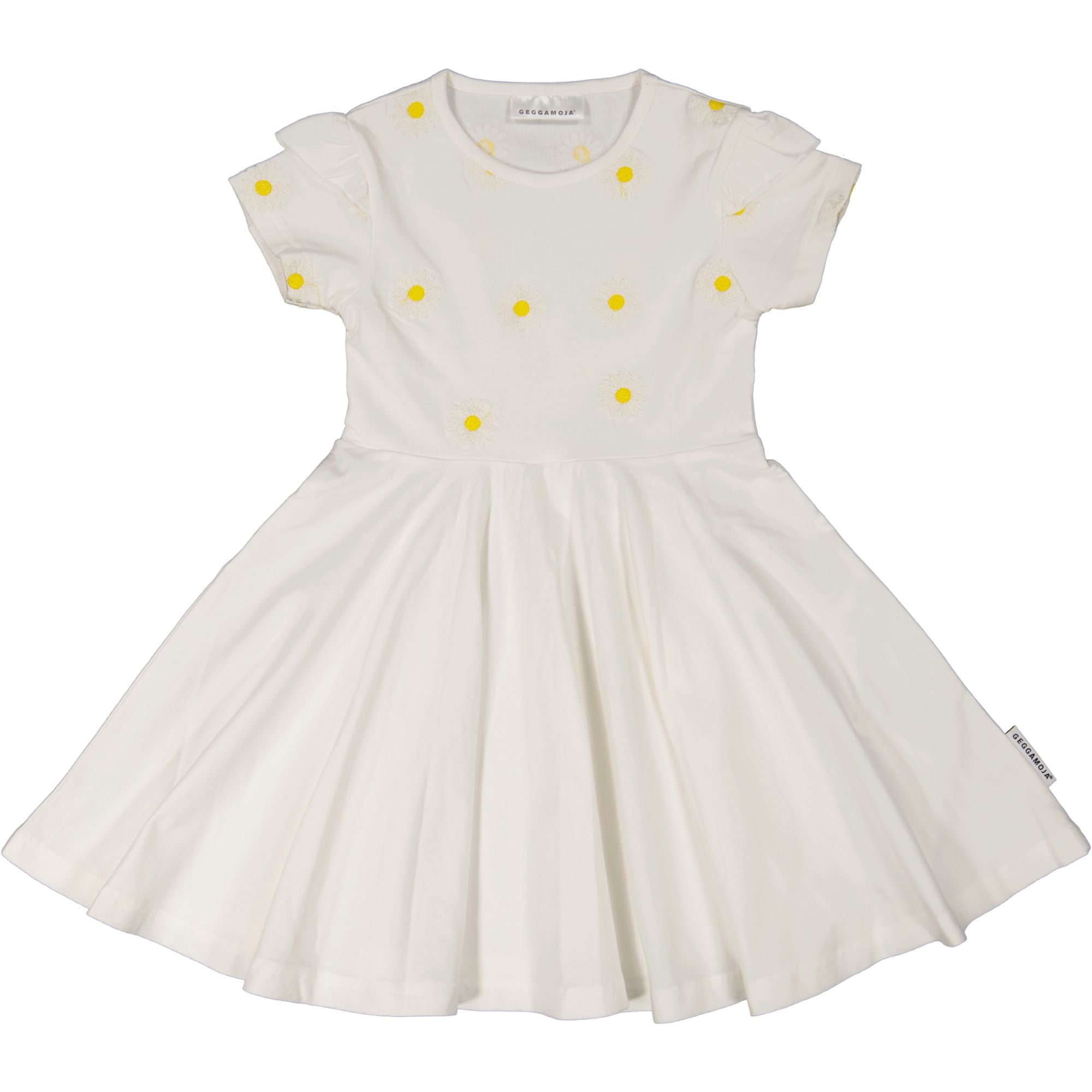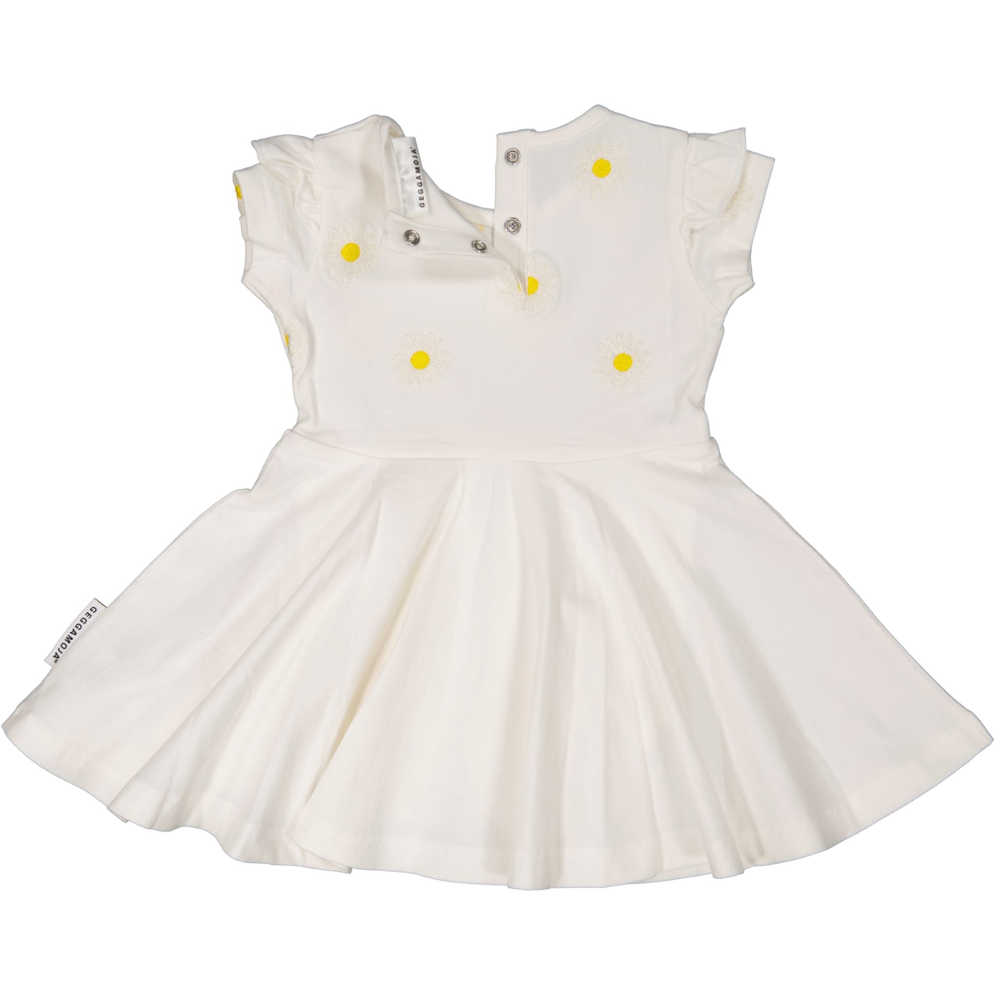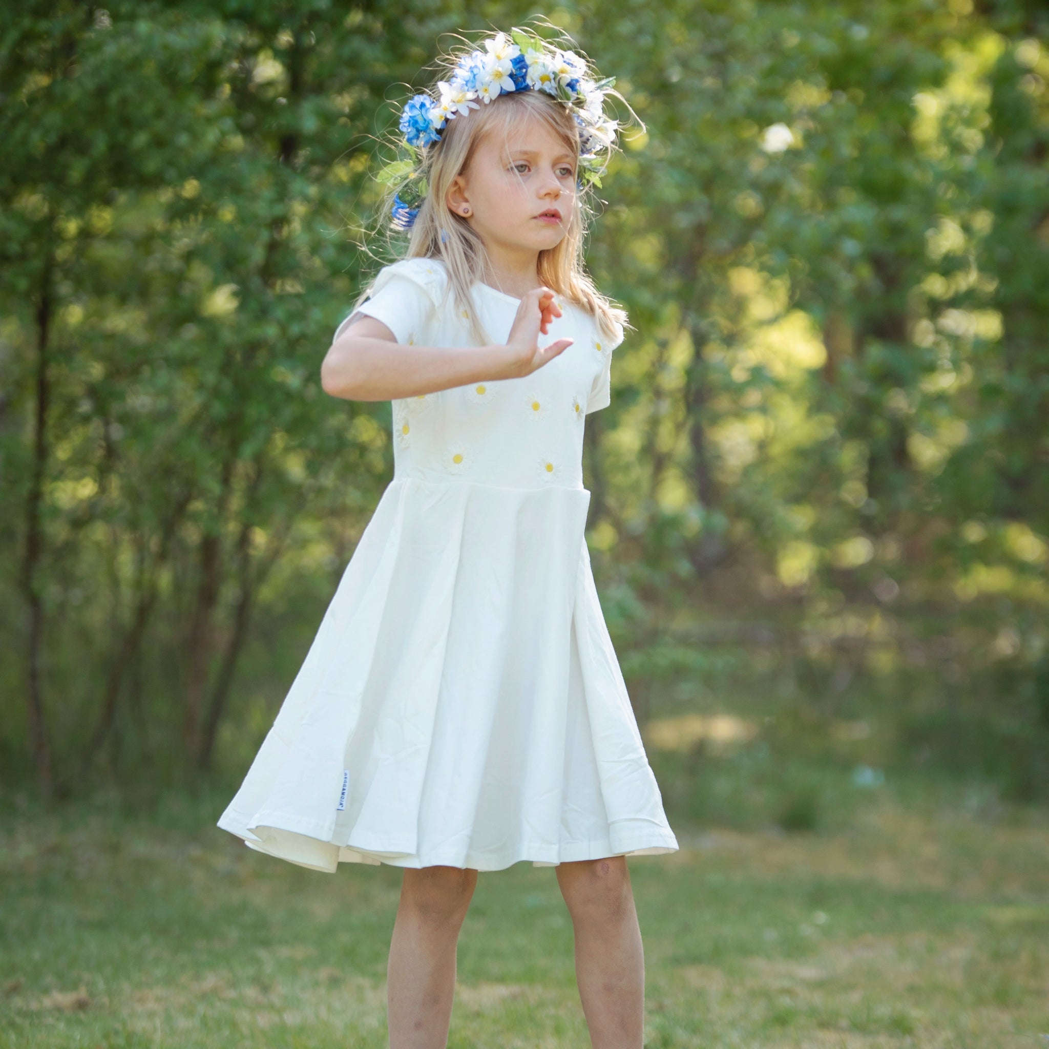 Kortärmad klänning med utsvängd cirkelskuren kjol från midjan. Klänningen har fina prästkragebroderier upptill. Från Storlek 50/56- 62/68 finns en insydd body som gör att blöjan sitter på plats. En perfekt sommarklänning för både små och stora barn.