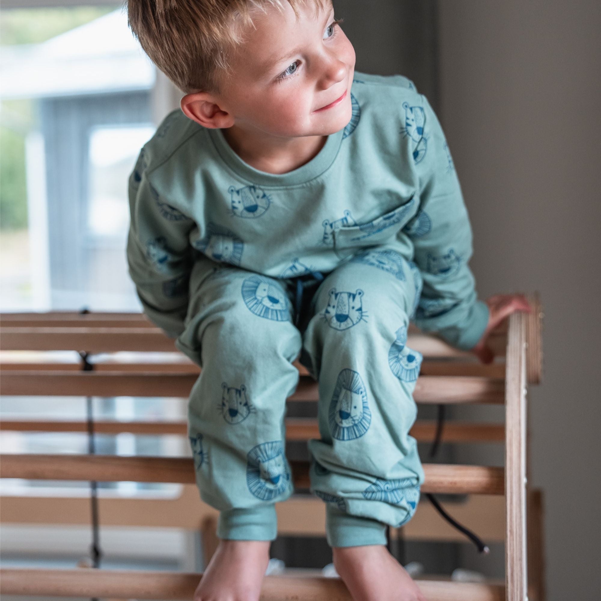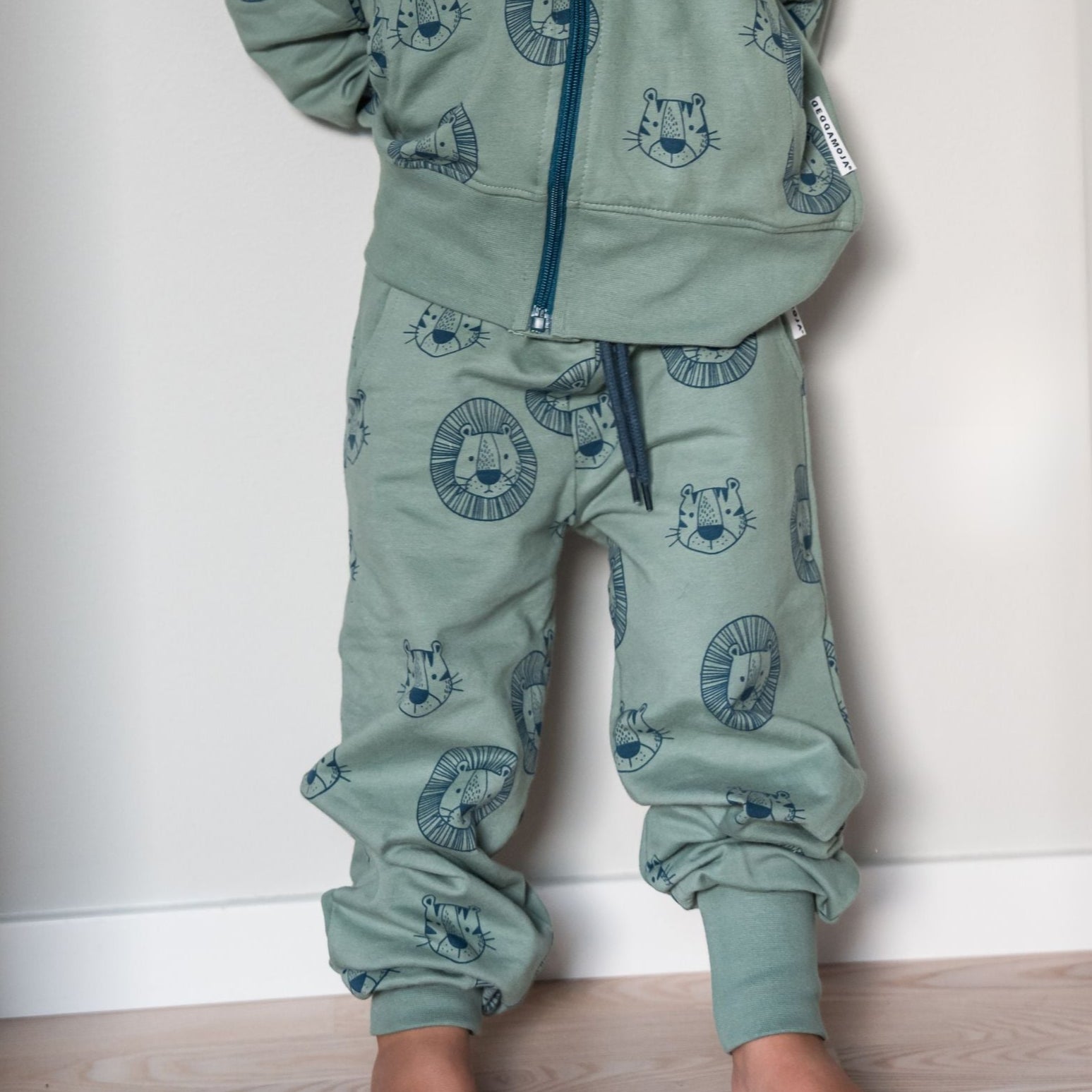 Collegebyxa med breda muddar i midja och benslut. Reglerbar resår i midjan. Mjuk borstad baksida.