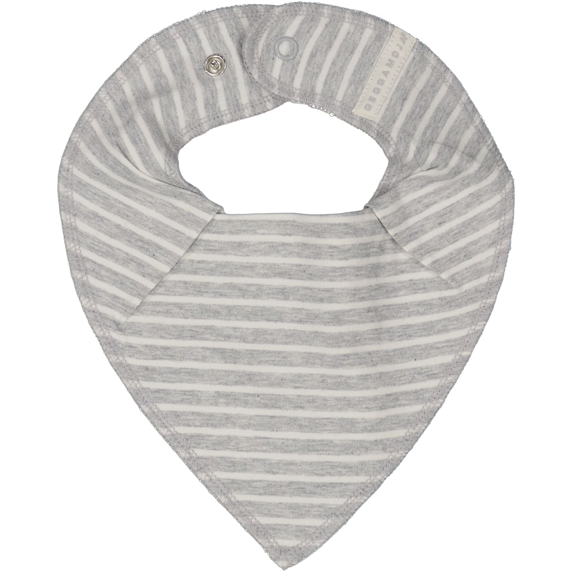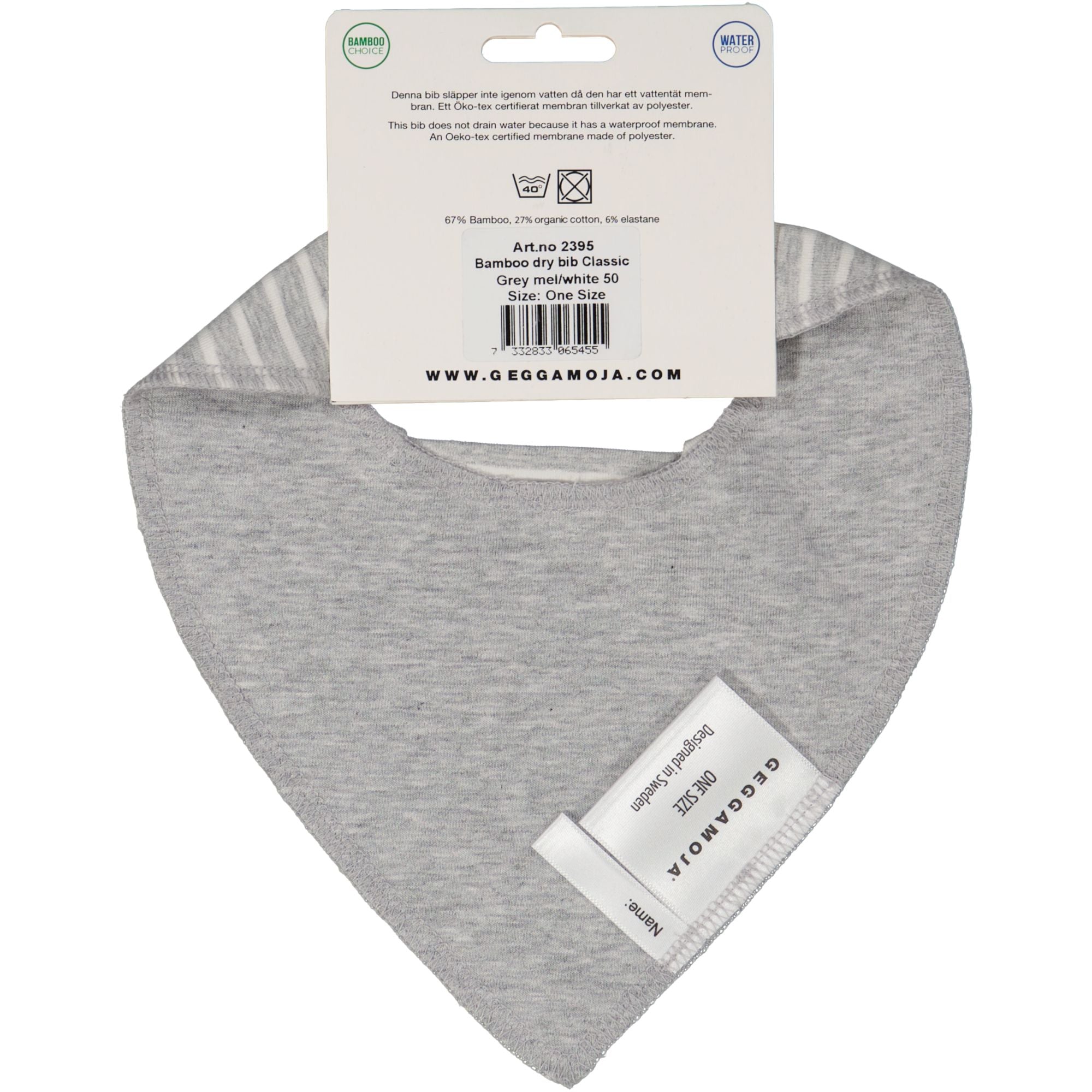 Bib/dregellapp i Geggamojas klassiska ränder gråmelerad och vit. Tillverkad i ett vattentätt öko-tex-certifierat polyestermembran. Tryckknappar som knäppning och reglering bak.