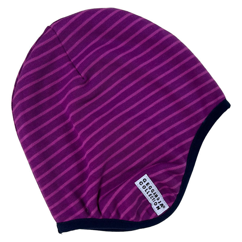 Äntligen tilllbaka! Den populära hjälmmössan som är fodrad med skön fleece. Den är i Geggamojas klassiska ränder i mörklila och lila. Öronlapparna värmer extra gott.