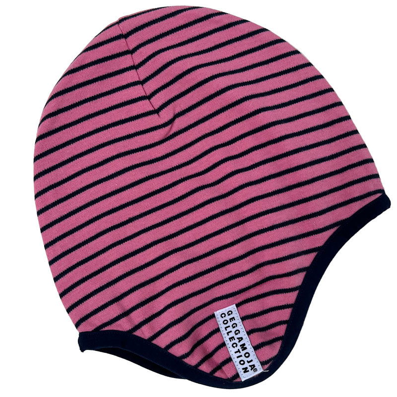 Äntligen tilllbaka! Den populära hjälmmössan som är fodrad med skön fleece. Den är i Geggamojas klassiska ränder i rosa och marinblå. Öronlapparna värmer extra gott.