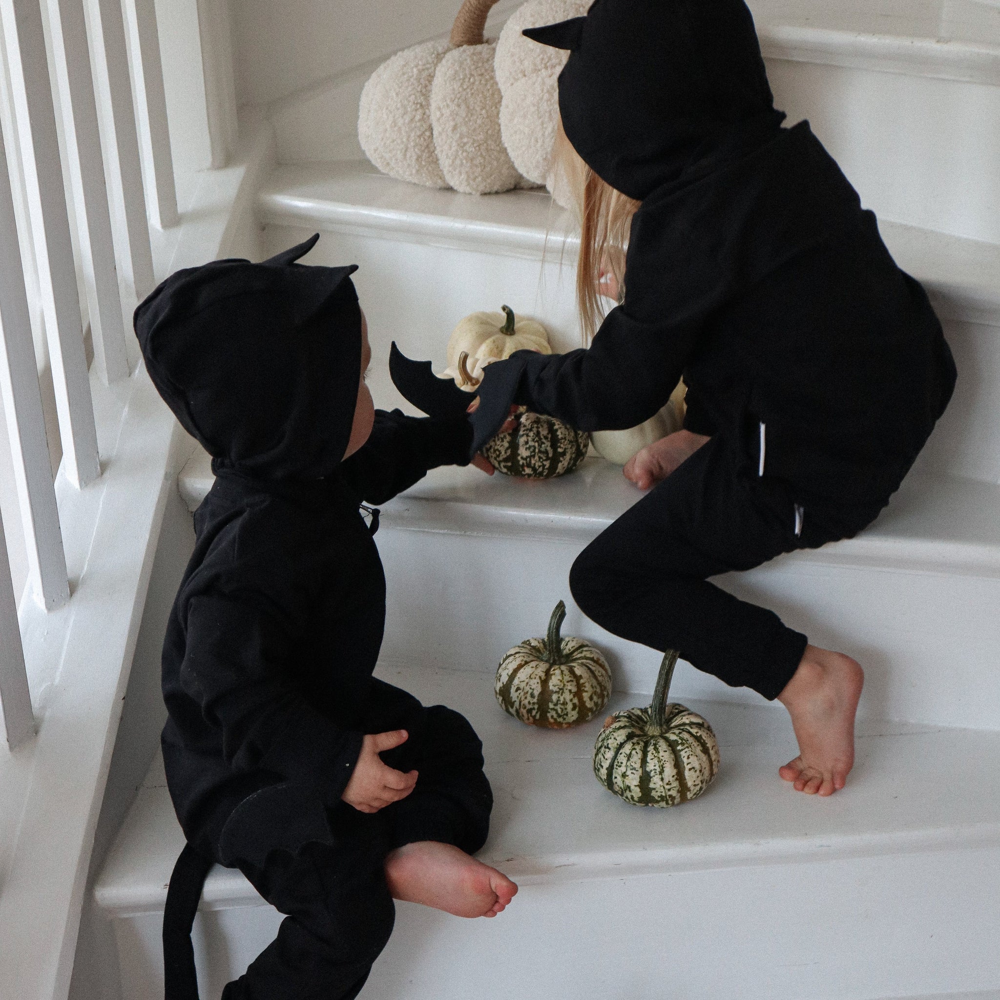 Jumpsuit i collegetyg med en gullig svans baktill. Avtagbar luva med kattöron.