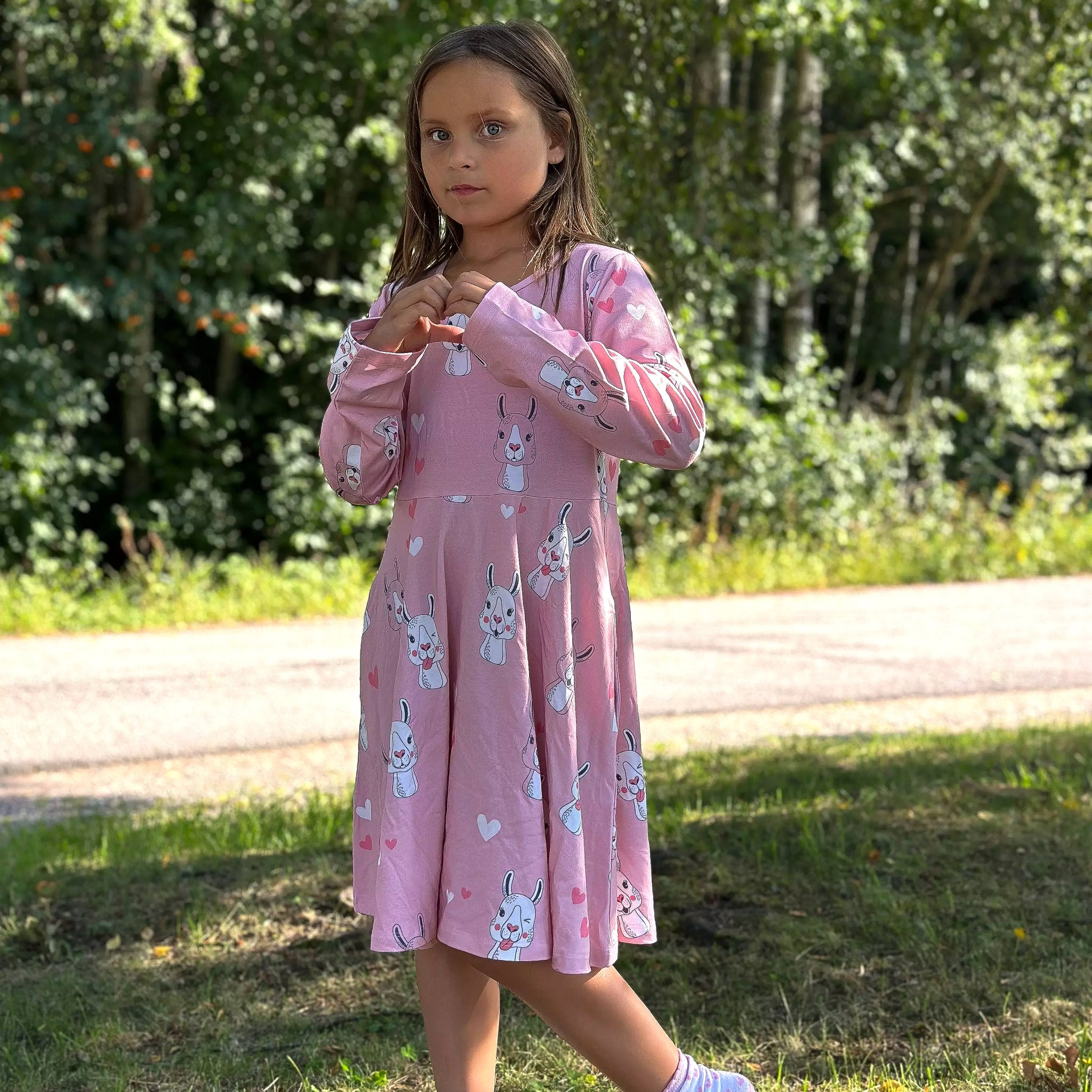 Klänning i vår populära bambu- och ekologiska bomullsblandning. Klänningen har vid kjol och resår i midjan.