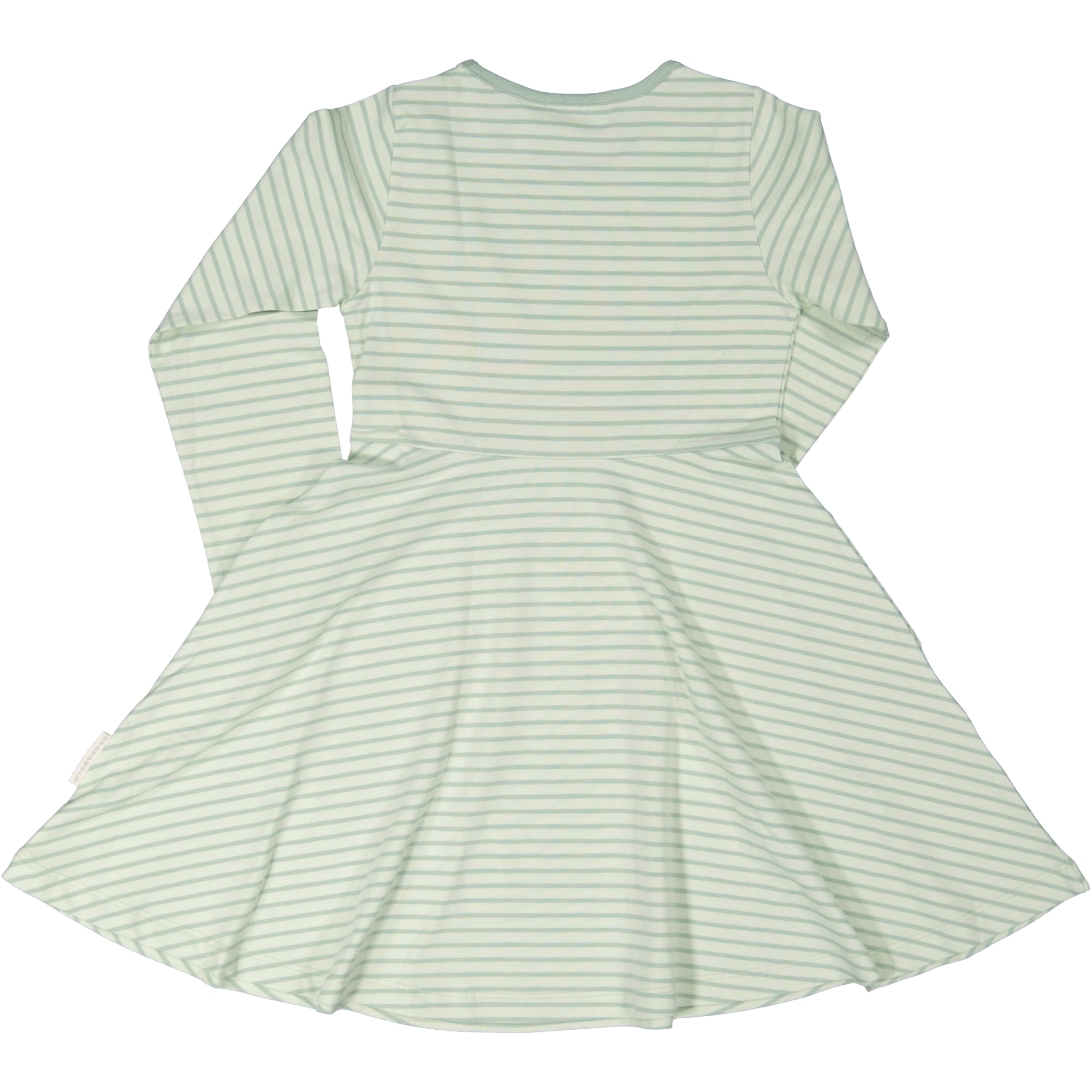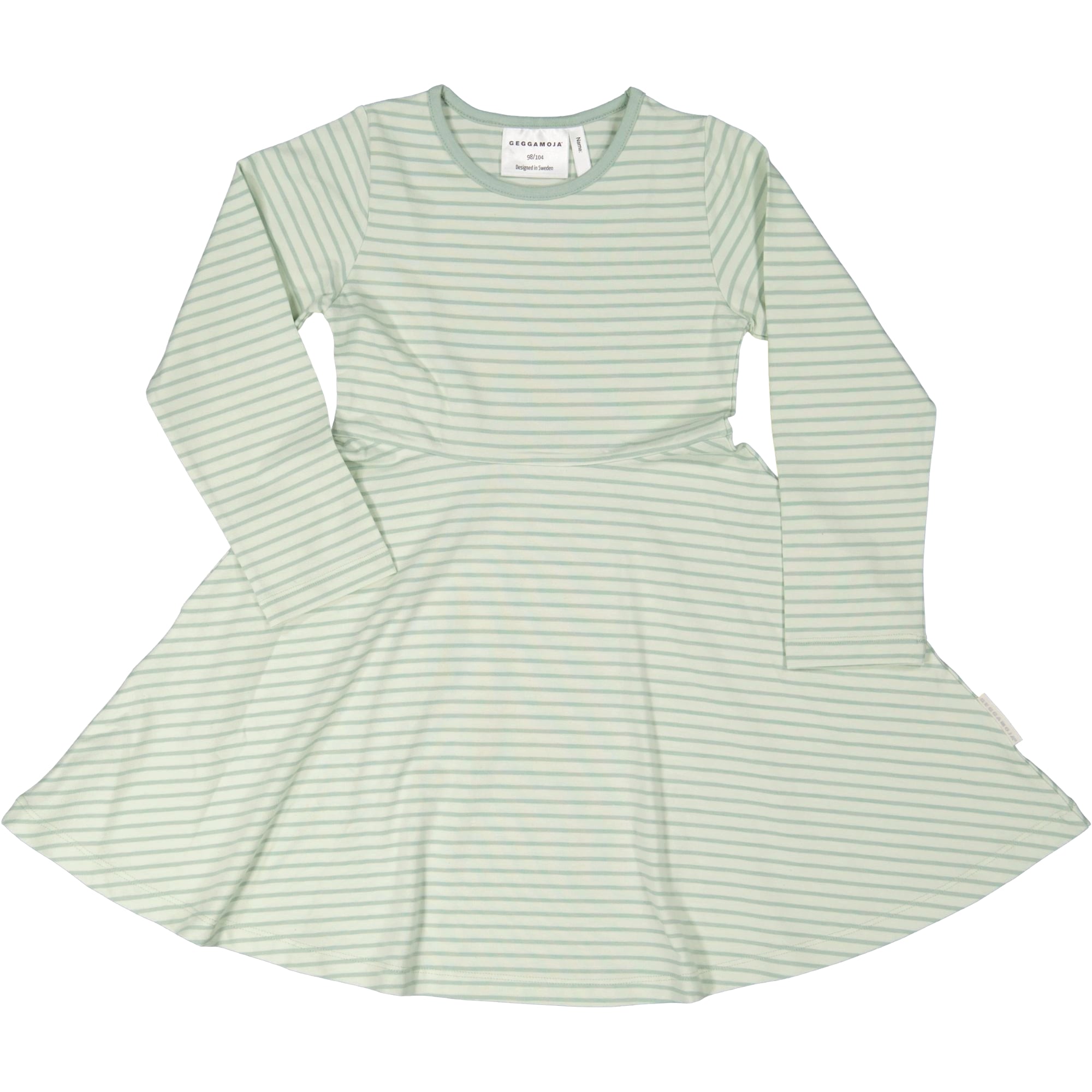 Långärmad snurrklänning i gröna ränder. En klassisk favorit i garderoben hos många Geggamojakunder. I de två minsta storlekarna 50/56 och 62/68 har den en insydd body.