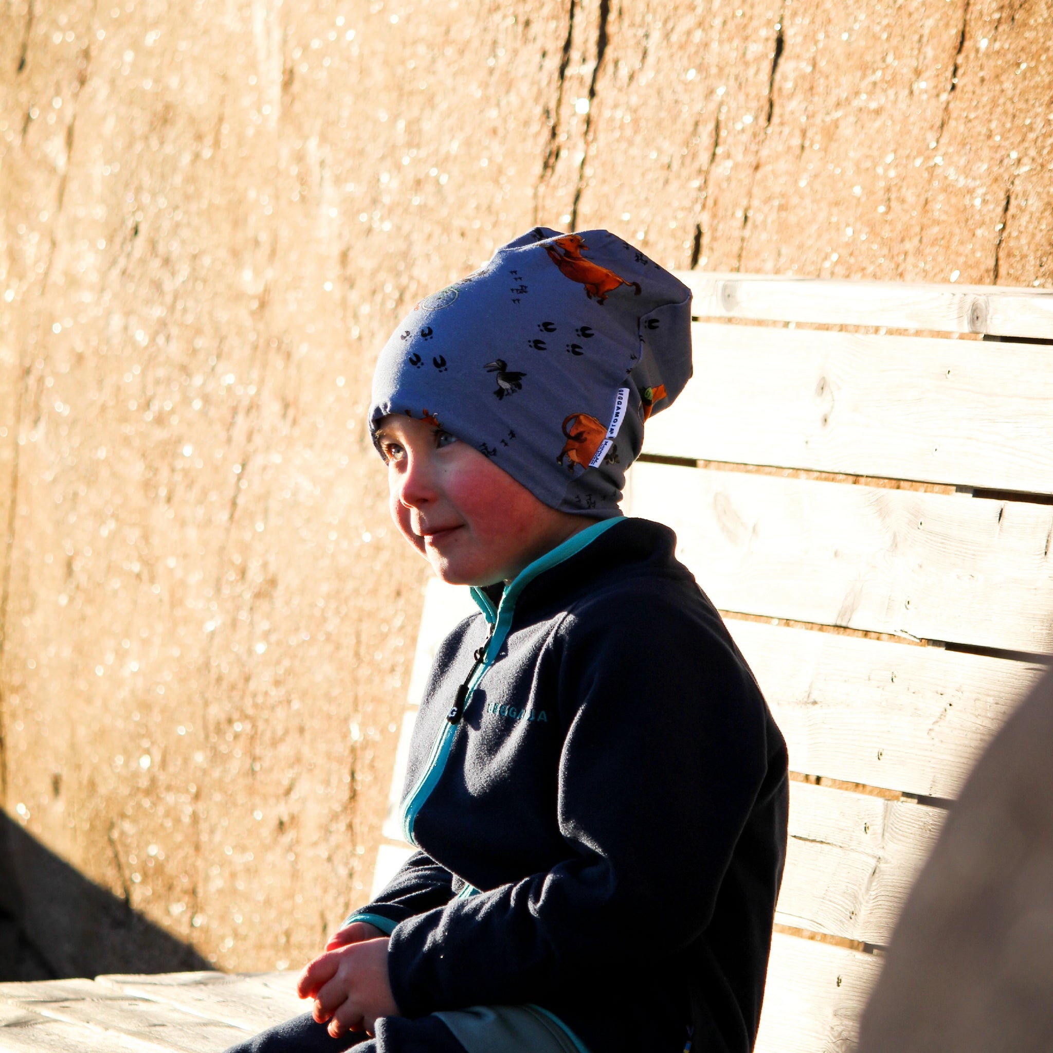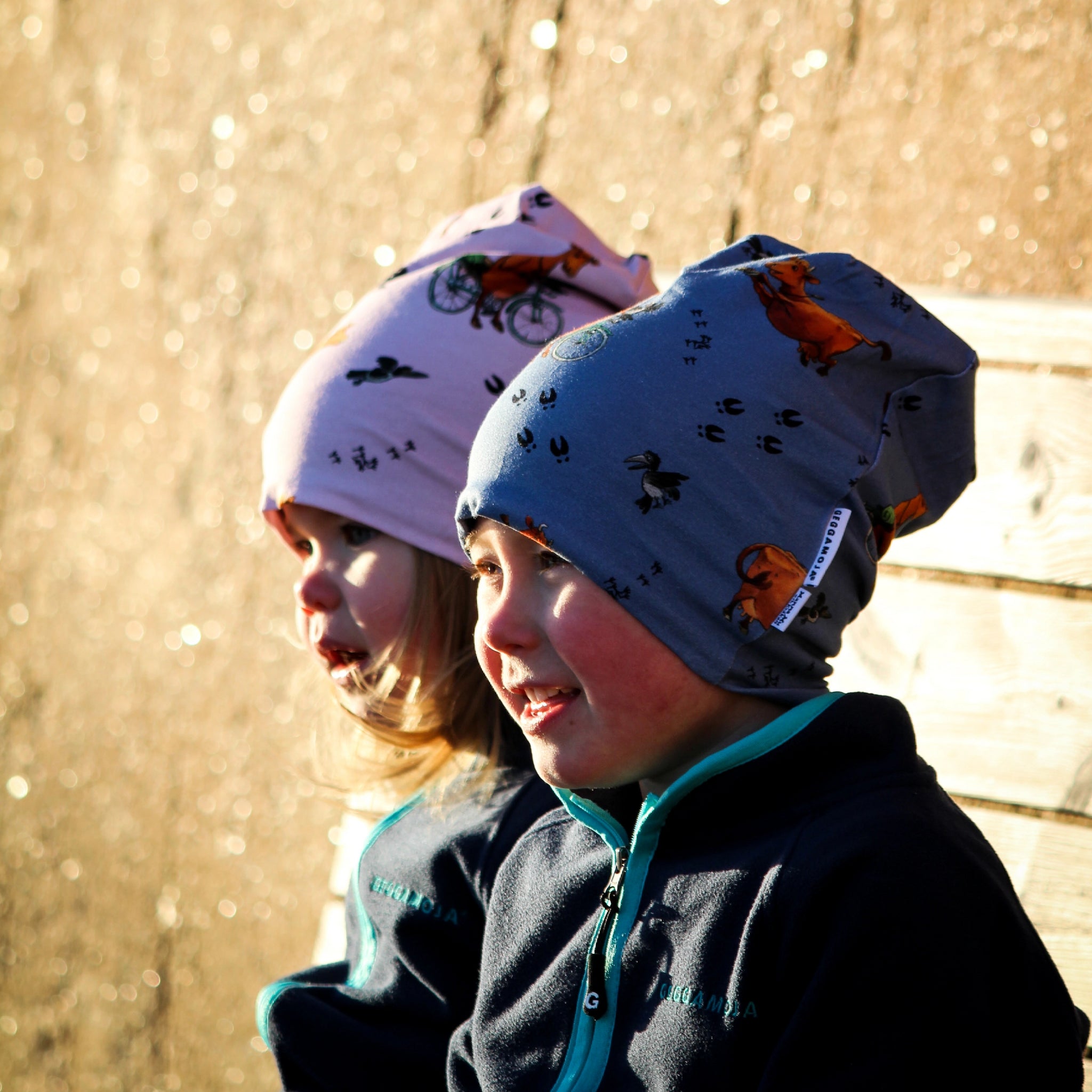 Mössa med Mamma Mu och kråkan print. Mössan är i Ekologisk bomull och har Geggamojas härliga passform som passar alla, liten som stor.