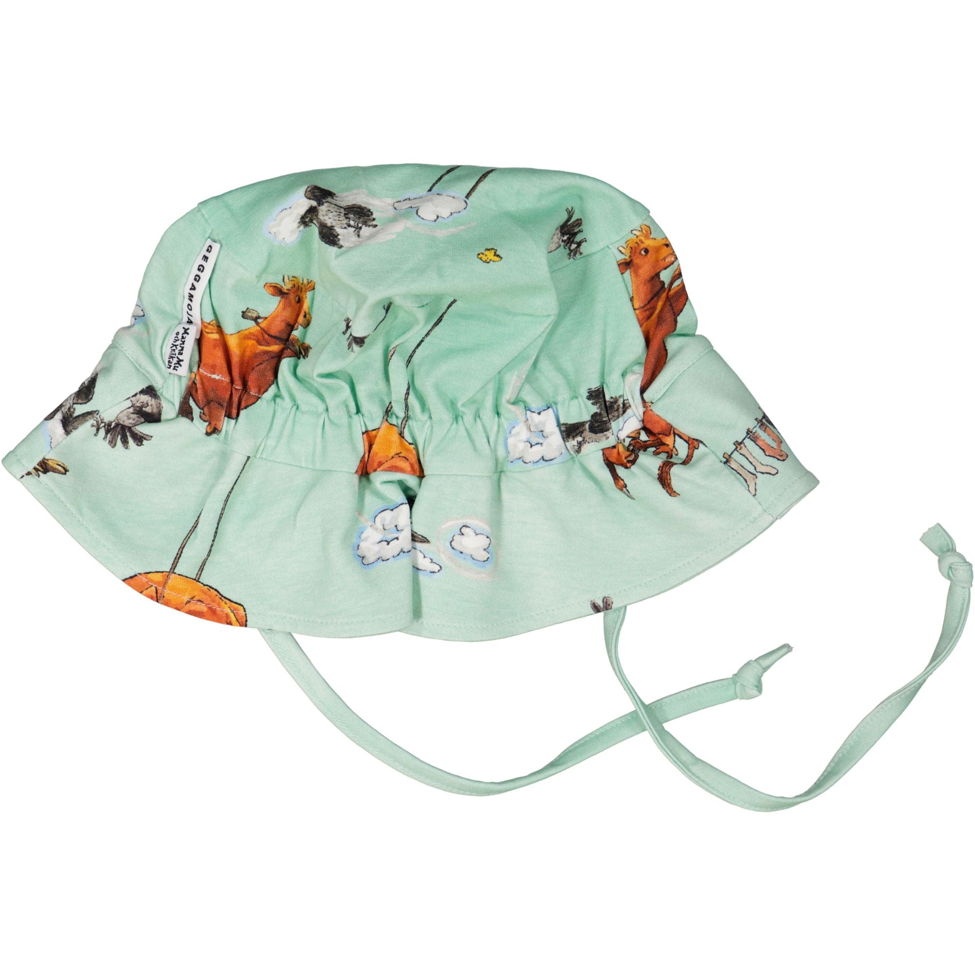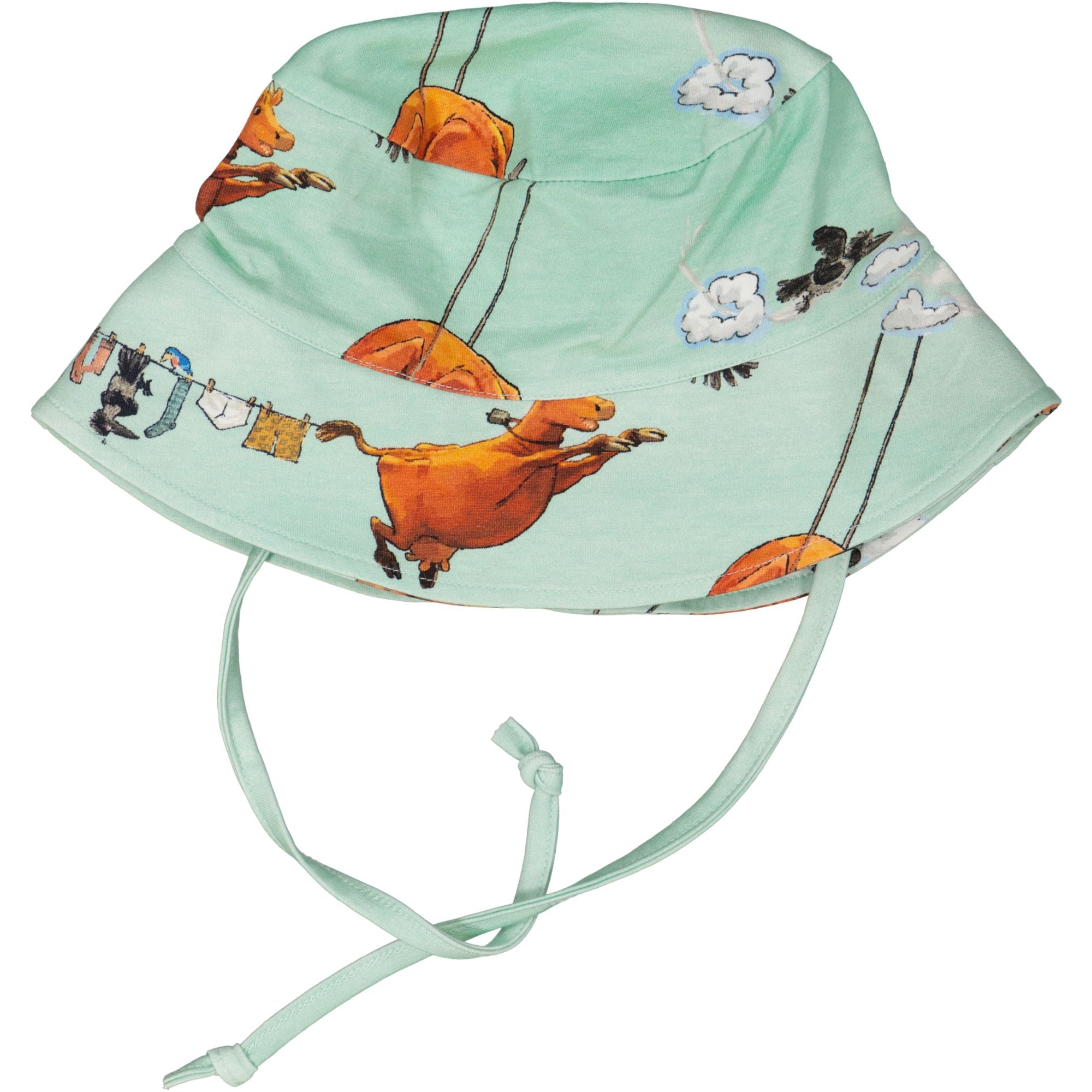 En solhatt i mjuk sval bomull i Mamma Mu print. Solhatten har snören för knyt under hakan och resår baktill för bästa passformen.
