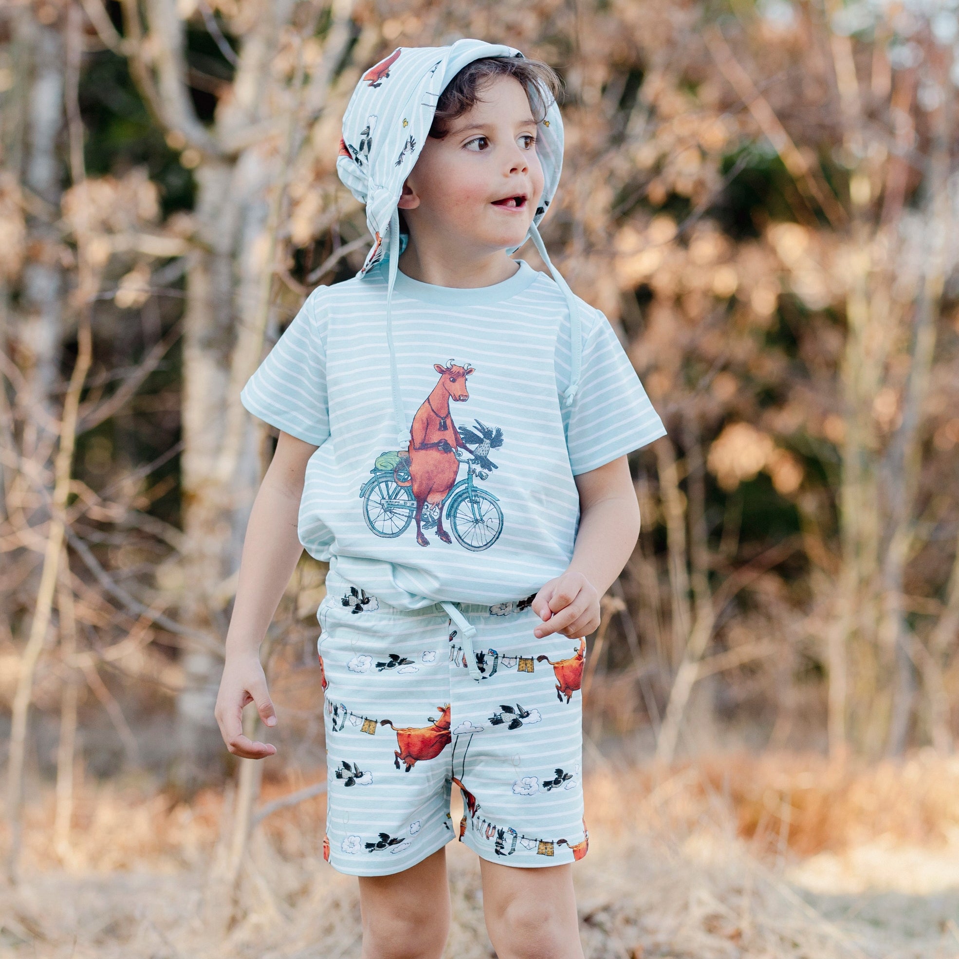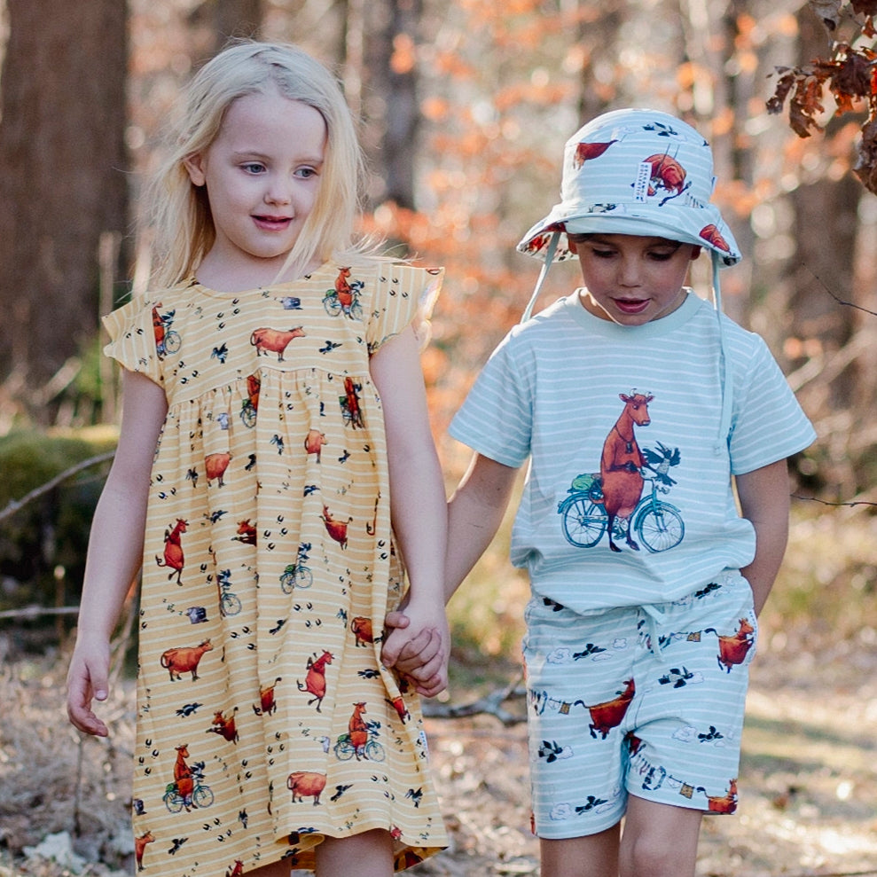 En solhatt i mjuk sval bomull i Mamma Mu print. Solhatten har snören för knyt under hakan och resår baktill för bästa passformen.