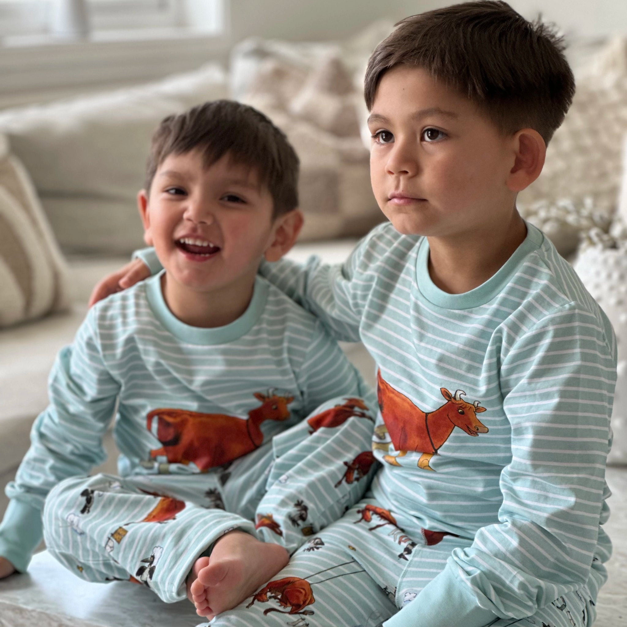 Tvådelad pyjamas i mjuk och skön Ekologisk bomull. Pyjamasen består av ett par byxor med resår i midjan och breda muddar och en långärmad tröja även den med muddar.