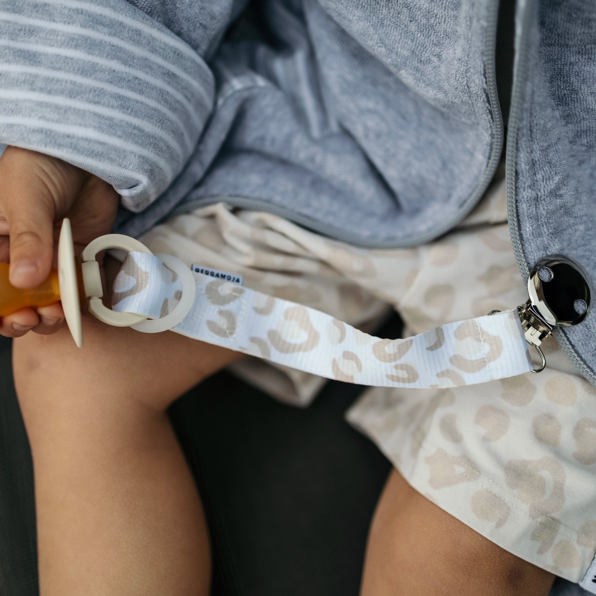 Napphållaren passar de flesta nappar på marknaden. Napphållaren är tillverkad av polyester med nickelfritt metallspänne och en elastisk ring av silikon.