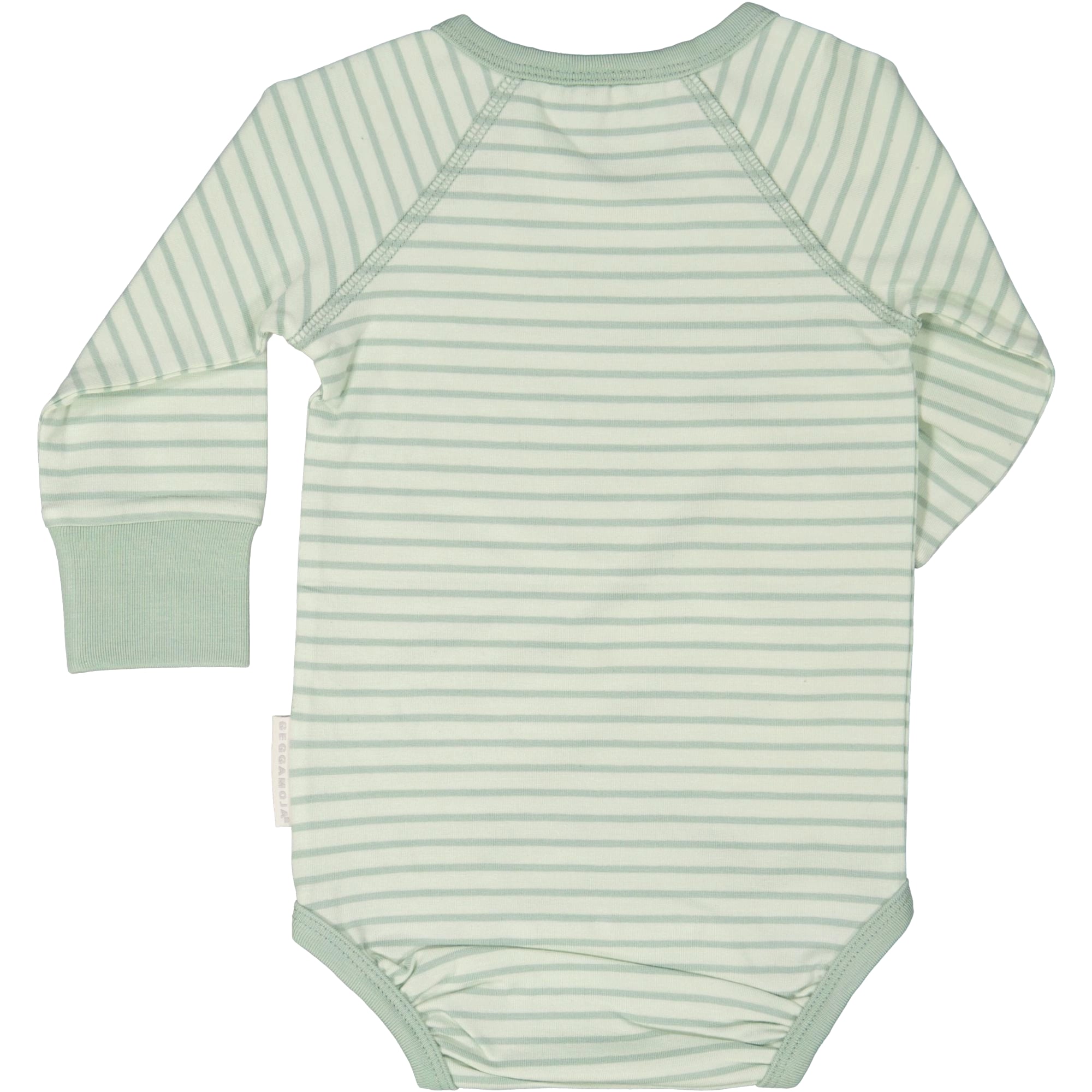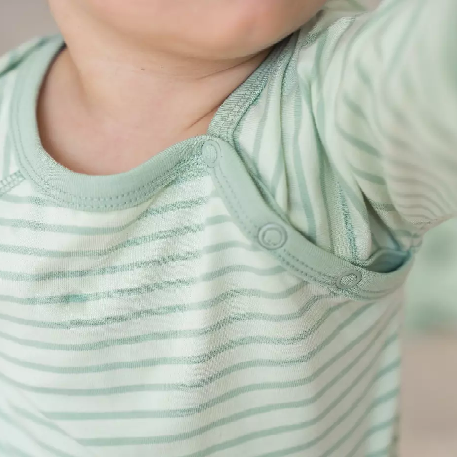 En ljusgrön och grön randig body i vår populära bambu/bomull. Tre tryckknappar fram vid vänster axel för att enkelt trä över huvudet och tre tryckknappar i grenen. Bodyn är utrustad med vår Extended size vilket innebär dubbla knapprader i grenen så du kan anpassa passformen samt mjuk mudd i ärmslutet som går att vika upp. Detta gör att bodyn passar mycket längre.