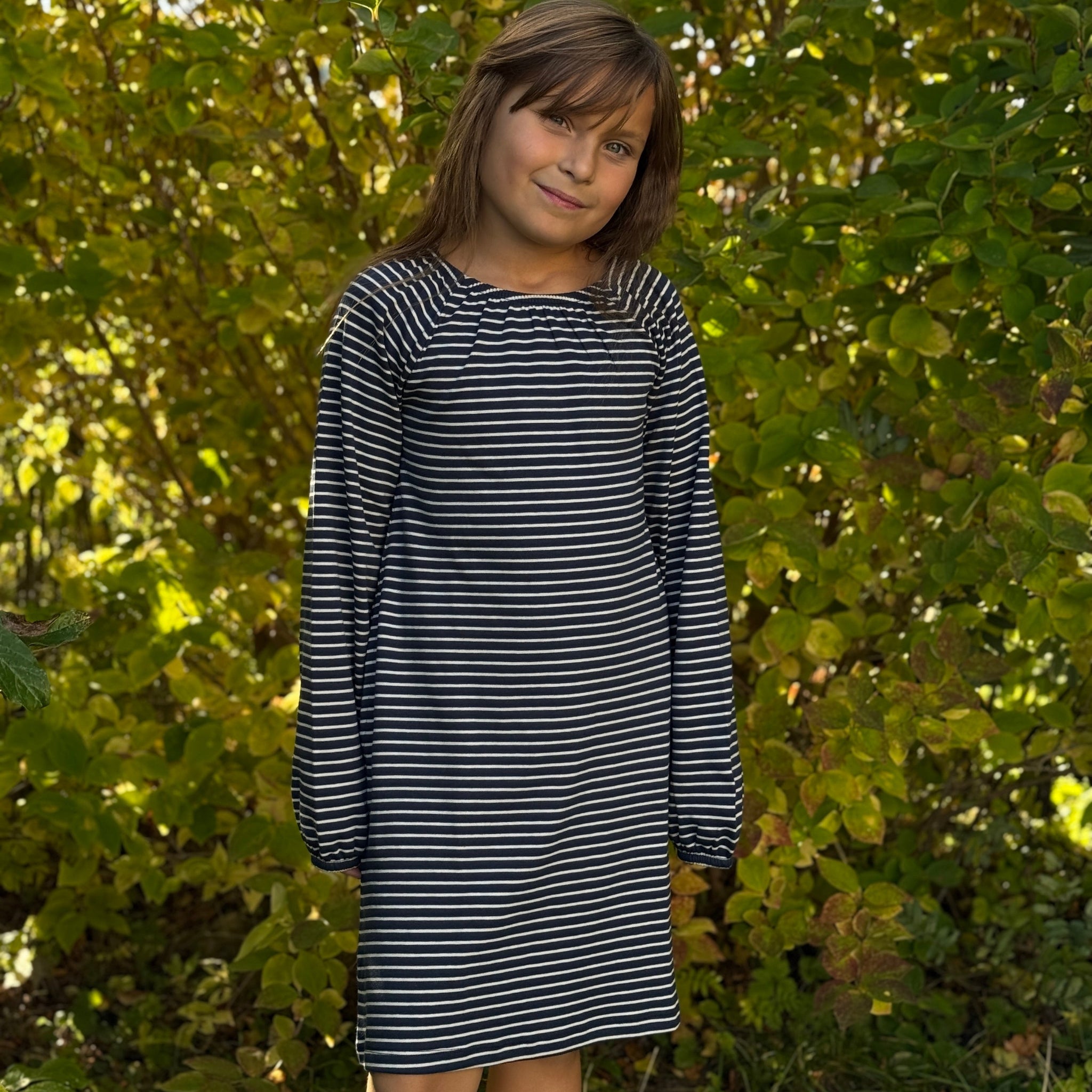 Långärmad klänning med singoalla -ärm i ekologisk bomull. En klassisk favorit i garderoben hos många Geggamojakunder. Singoallaklänningen är praktisk året runt och har en insydd body i storlekarna 50/56 och 62/68.