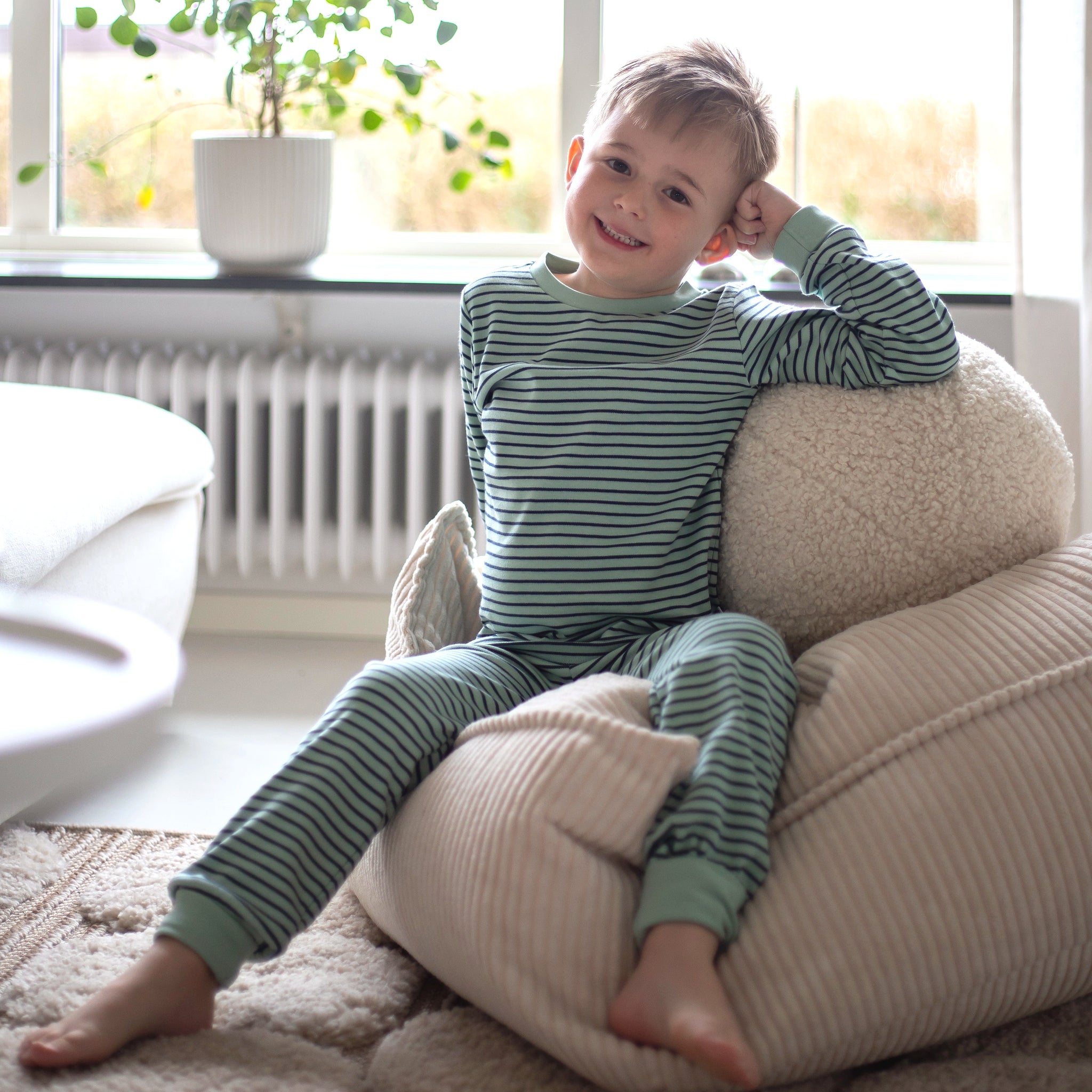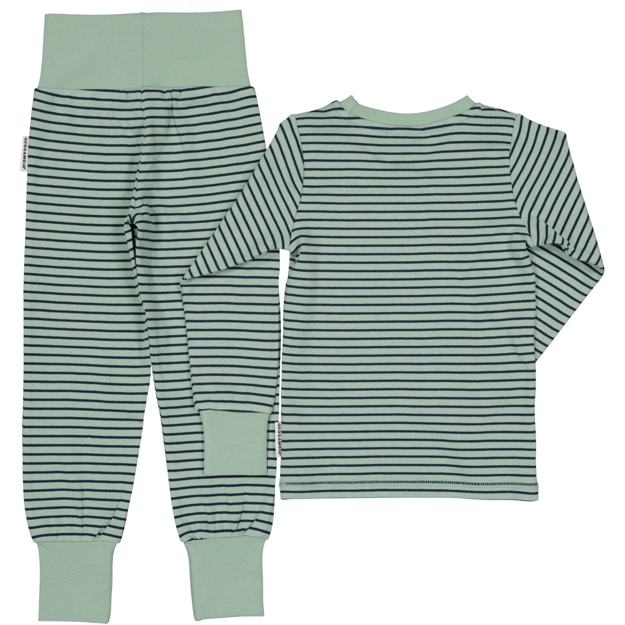 Tvådelad pyjamas i mjuk och skön 100% Ekologisk -bomull. Pyjamasen består av ett par byxor med resår i midjan och breda muddar och en långärmad tröja även den med muddar.