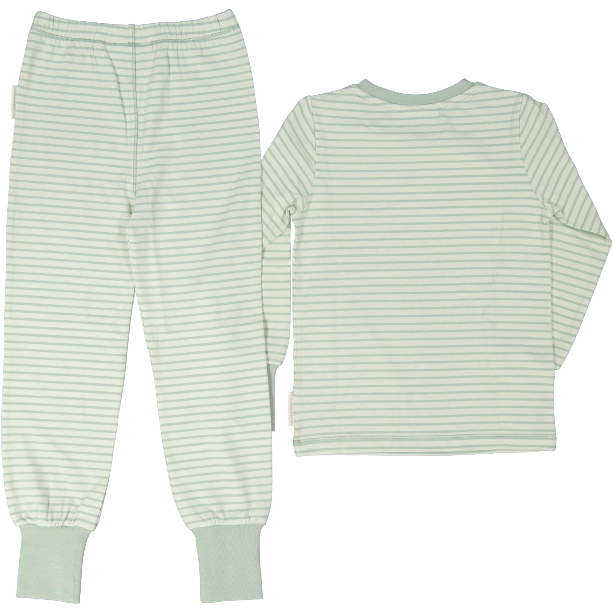 Tvådelad pyjamas i mjuk och skön i bambu. Pyjamasen består av ett par byxor med resår i midjan och breda muddar och en långärmad tröja även den med muddar. Bambu är ett miljövänligt materialval, det odlas helt organiskt utan bekämpningsmedel och är 100 % biologiskt nedbrytbart. Bambu är lent och bekvämt mot huden och tillåter huden att andas. Dess termiska egenskaper är detsamma som ull och silke, gör att materialet känns varmt när det är kallt och svalt när det är varmt- ett perfekt material för barnkläder.