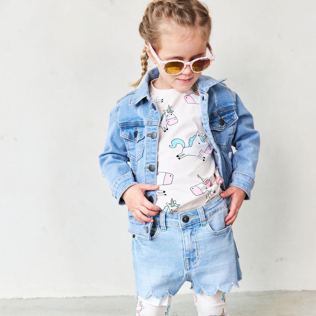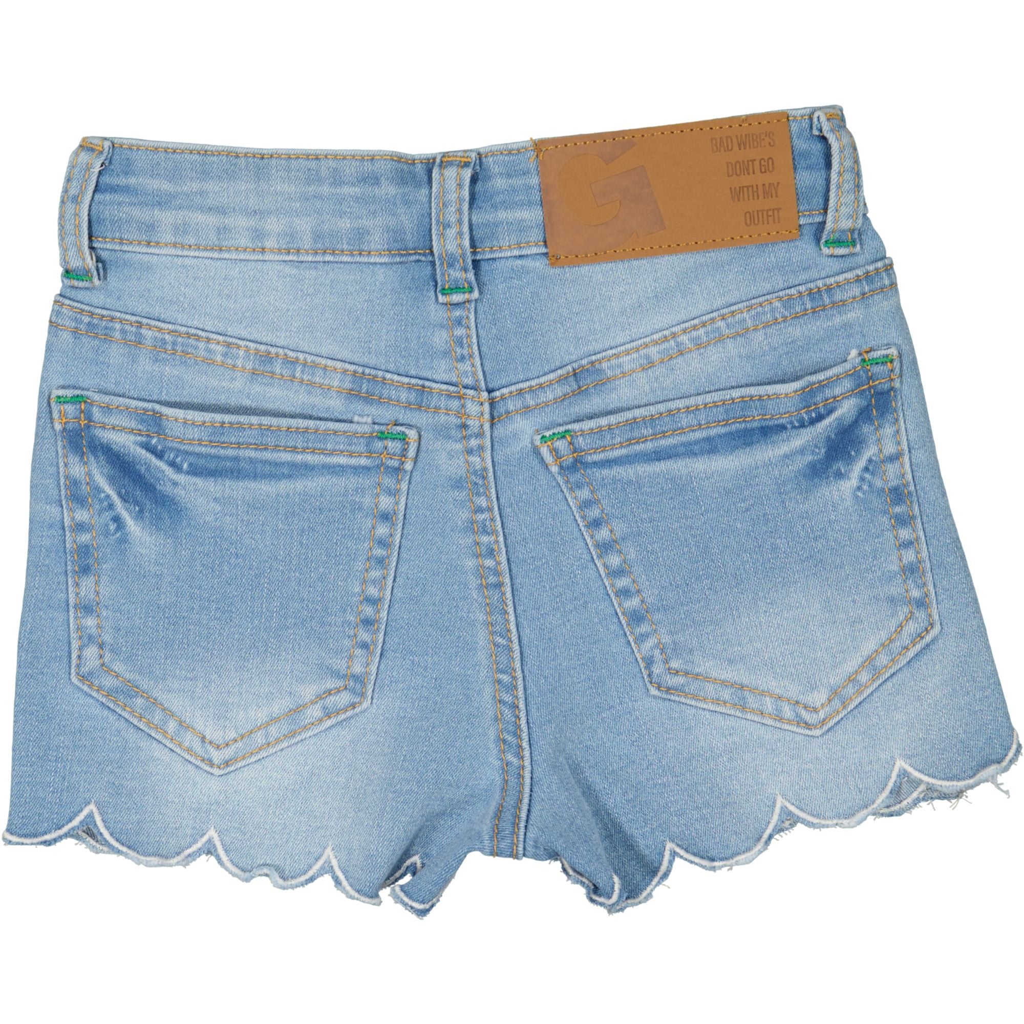 Jeans shorts i lite högre modell. Benslut har en rundad design. Shorten har fickor bak och i sidan. Tryckknapp och blixtlås samt gröna detaljer.