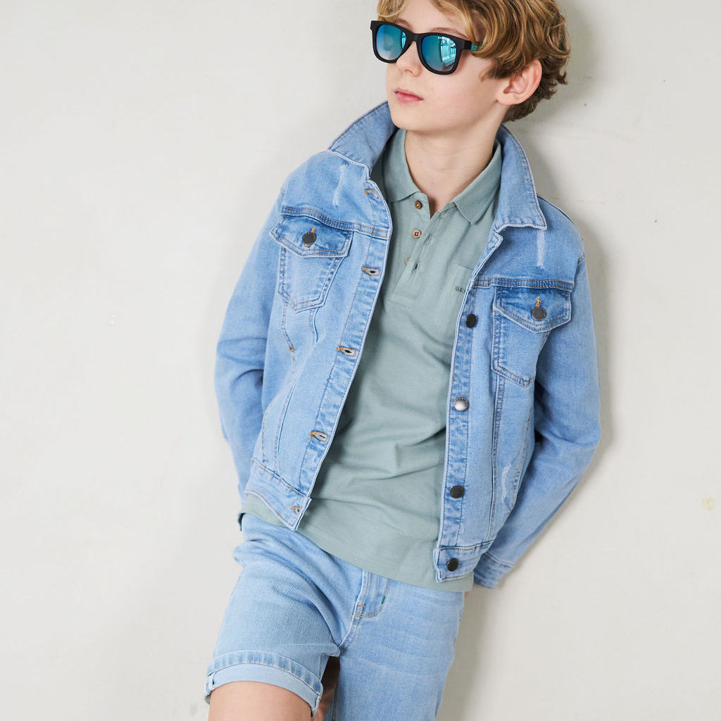 Jeansshorts for sommarens varma dagar. Ett par 5-ficks jeansshorts i mjuk och stretchigt material för ditt barn i en unisex-modell. Klassisk ljusblå, med slitningar. Mjuka och skön och följsam i materialet. Shortsen har en hålelastik så de enkelt kan regleras i midjan.