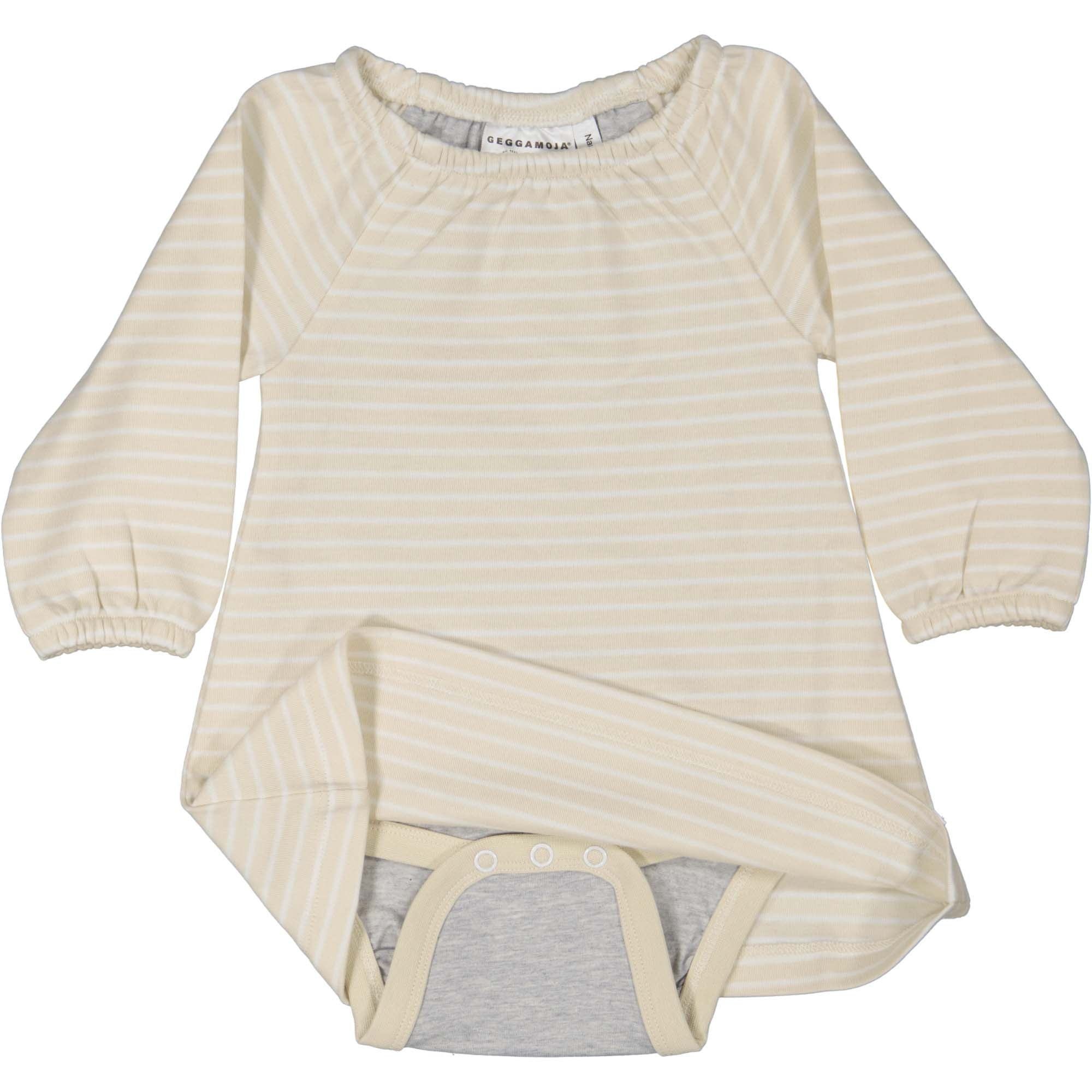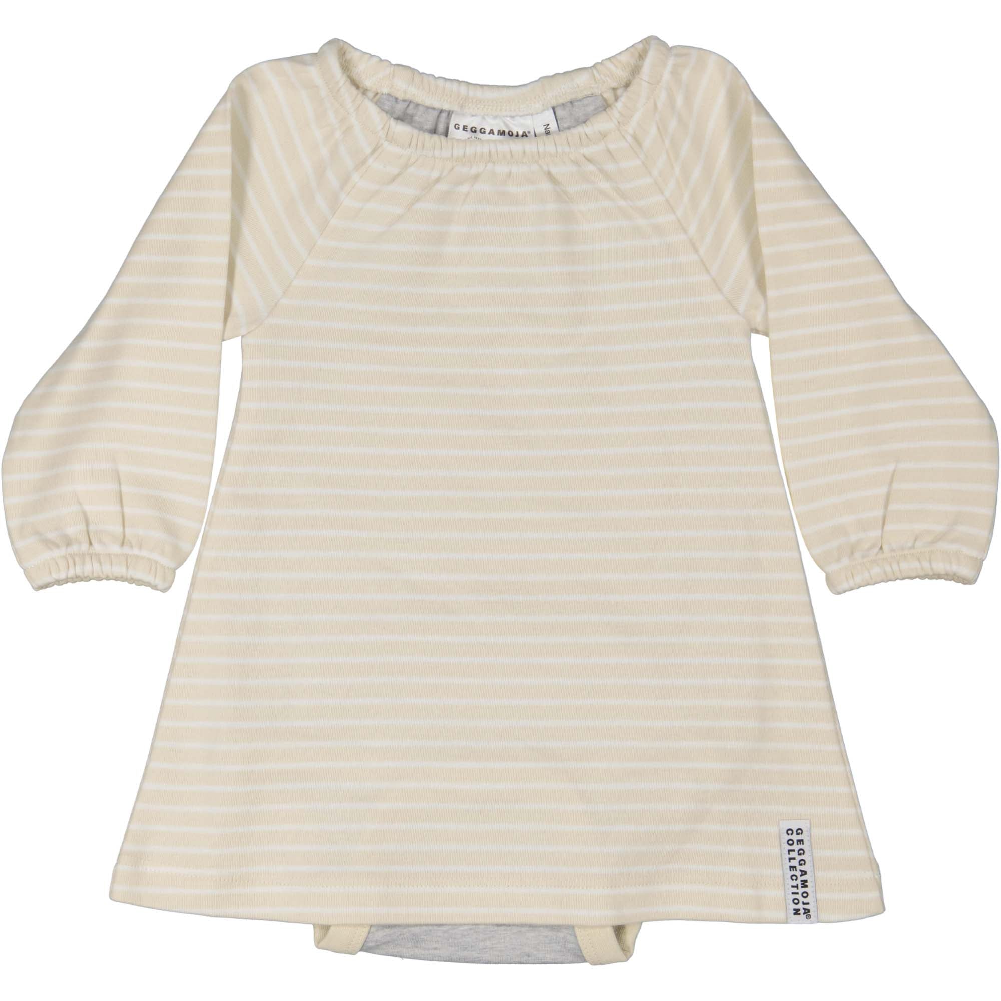Långärmad klänning med singoalla -ärm i beige och vitrandig bomull. En klassisk favorit i garderoben hos många Geggamojakunder. Singoallaklänningen är praktisk året runt och har en insydd body i storlekarna 50/56 och 62/68.