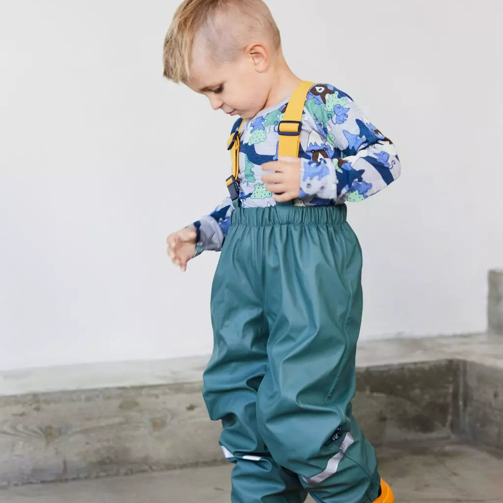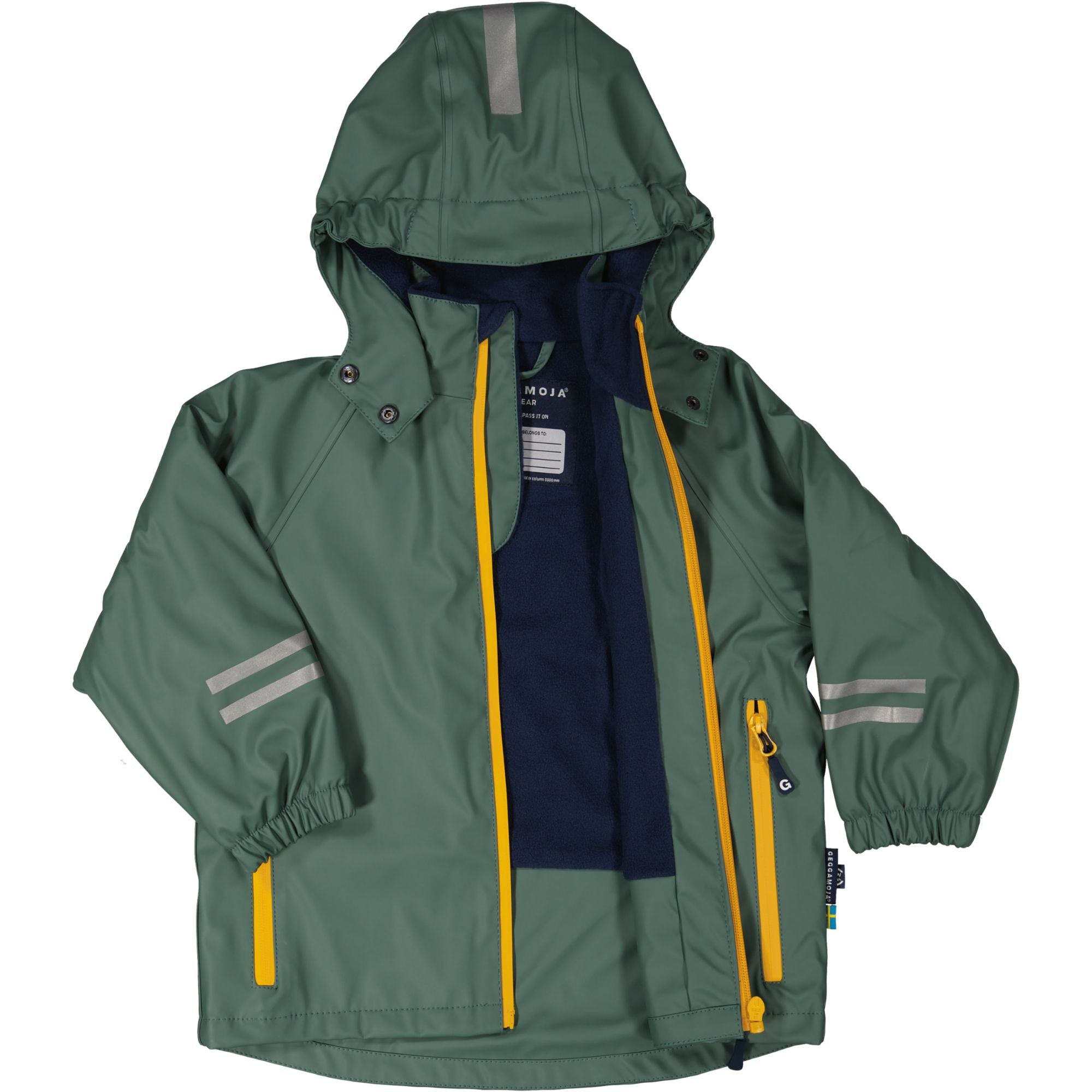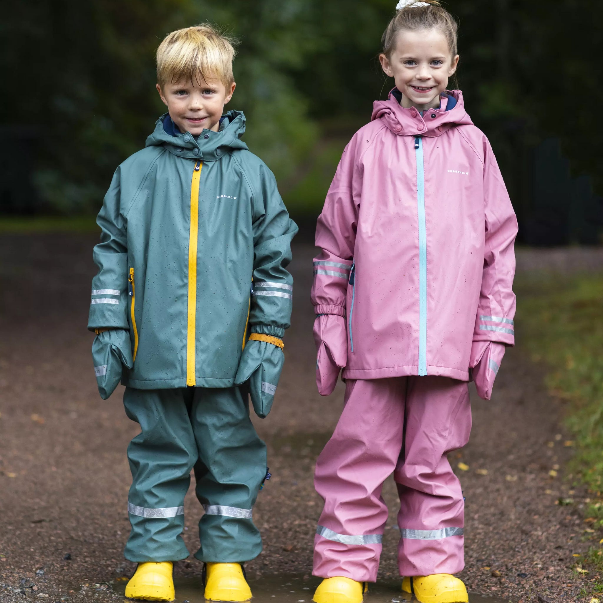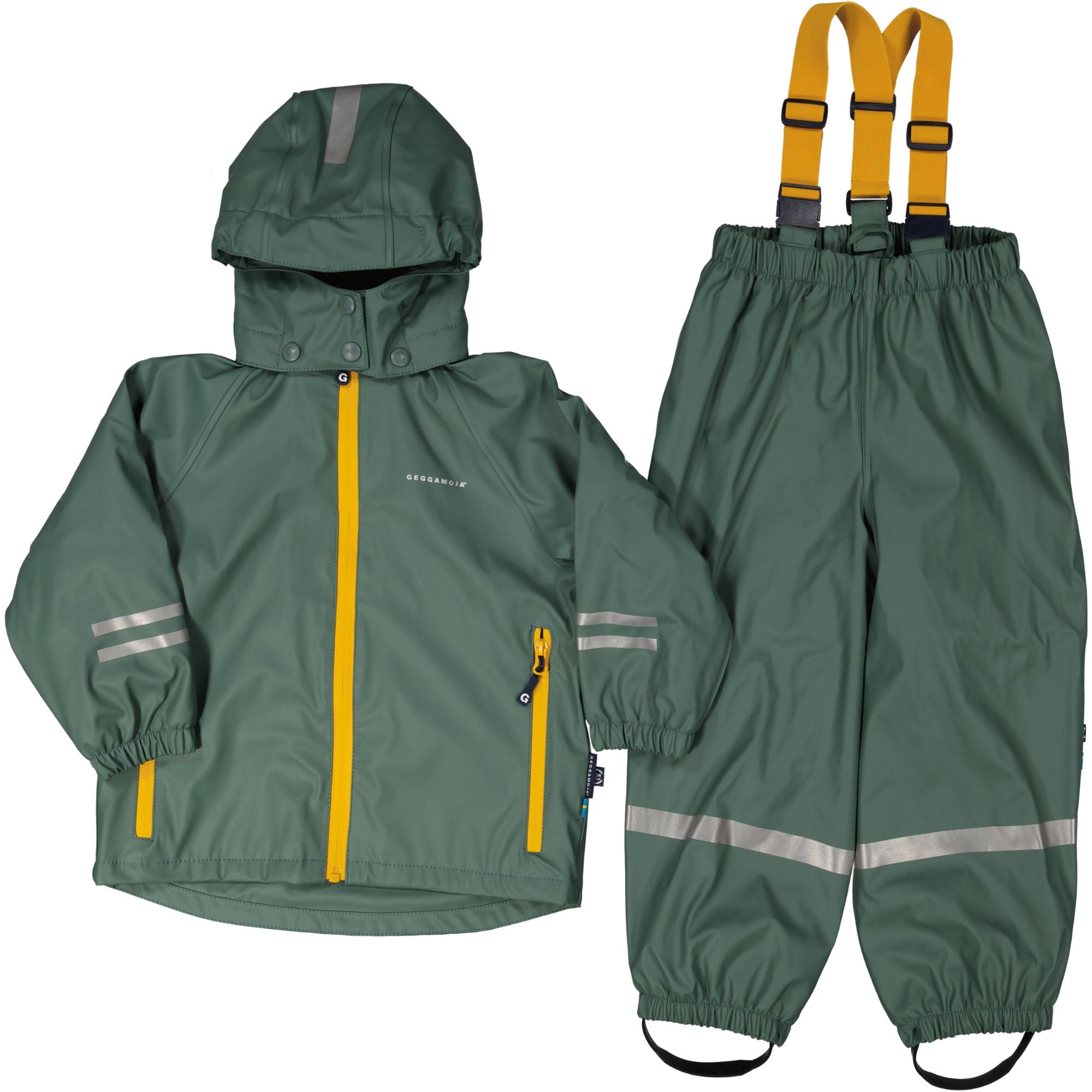 Håll barnet torrt i ett regnställ från geggamoja. Regn och rusk? Inga problem med detta funktionella regnställ som är fodrat med fleece. Håller barnet torrt och bekvämt, vare sig det är regnlek, skogsutflykt eller en riktigt blöt promenad till förskolan. Reflexdetaljer på både jacka och byxa ser till att barnet syns även när ljuset är svagt. Byxan i midjemodell med avtagbara och. justerbara hänglsen är bekväm och enkel att ta på. Justerbar midja med hålresår,  för optimal passform och rörelsefrihet.