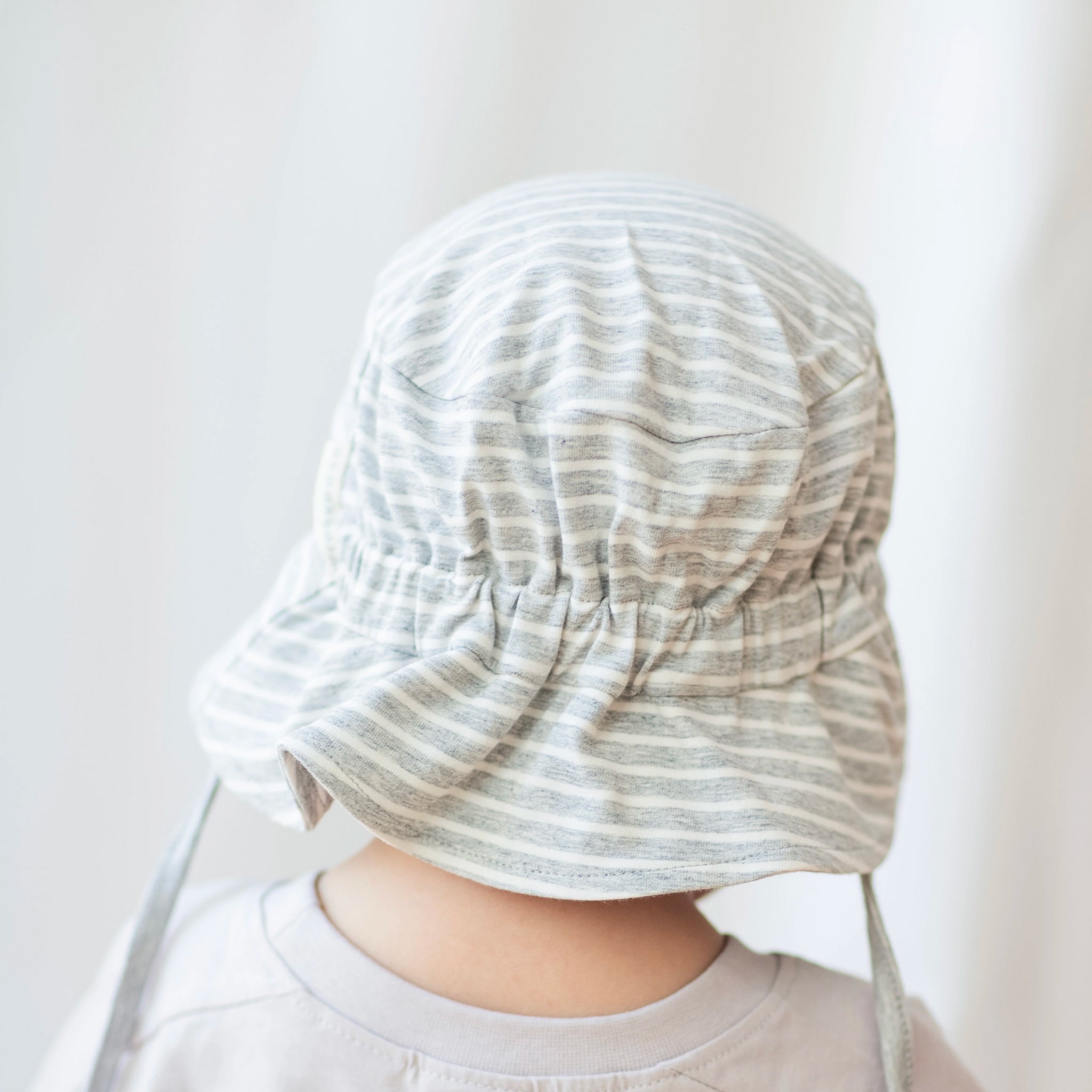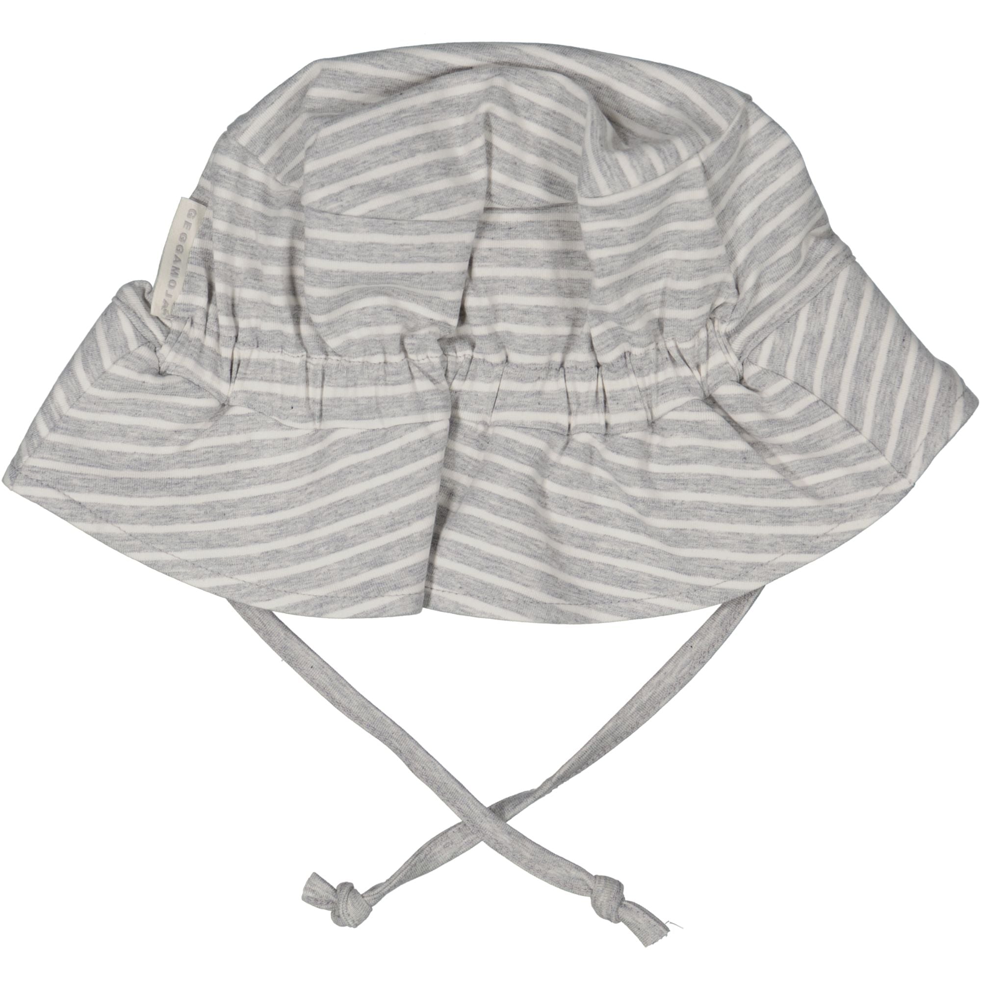 Skydda ditt barns huvud med en UV-Solhatt i gråmelerade och vita ränder, resår i bak och knytsnören som håller den på plats. Solhatten är tillverkad i en sval bambu/bomull. För bästa passformen har solhatten snören för knyt under hakan samt resår på baksidan.