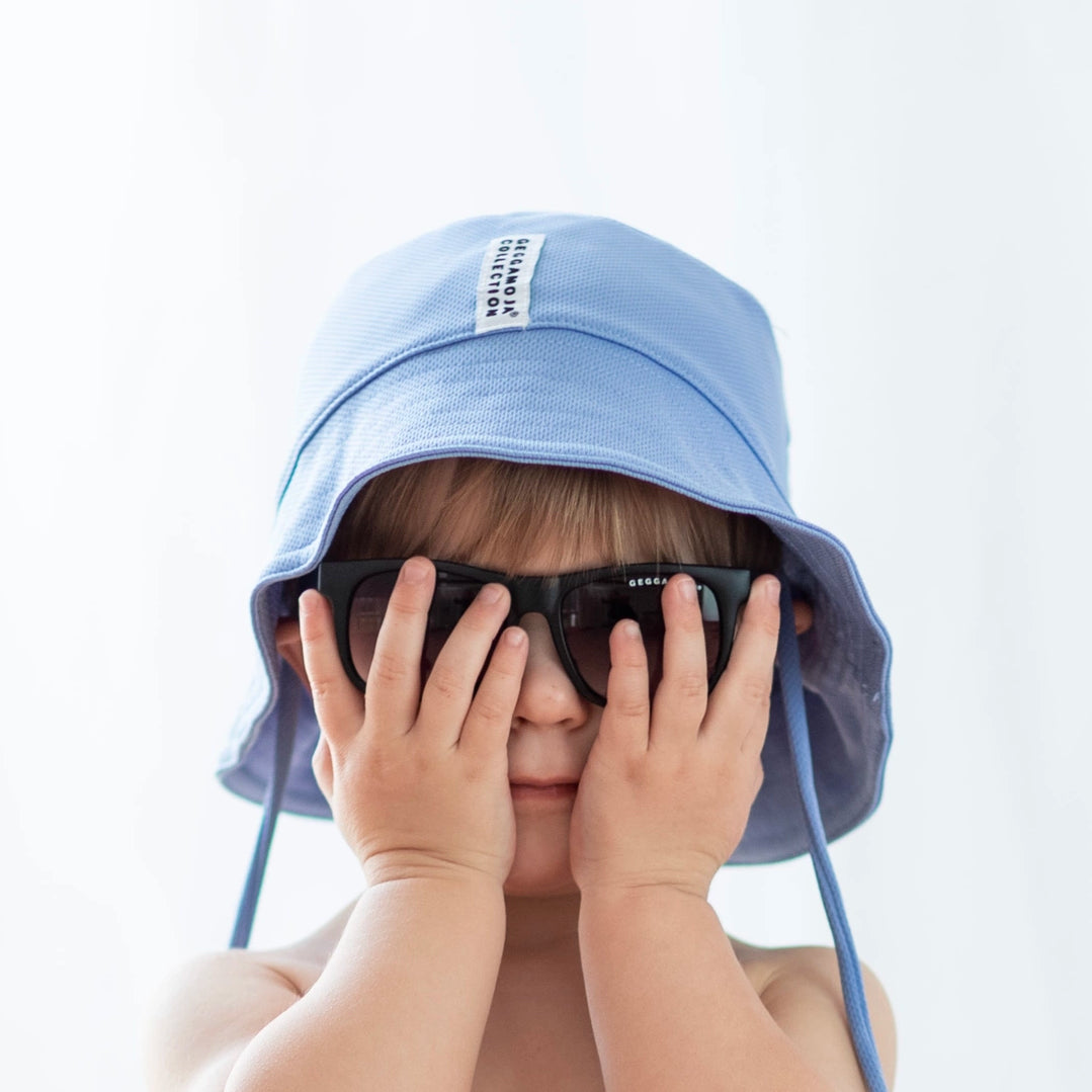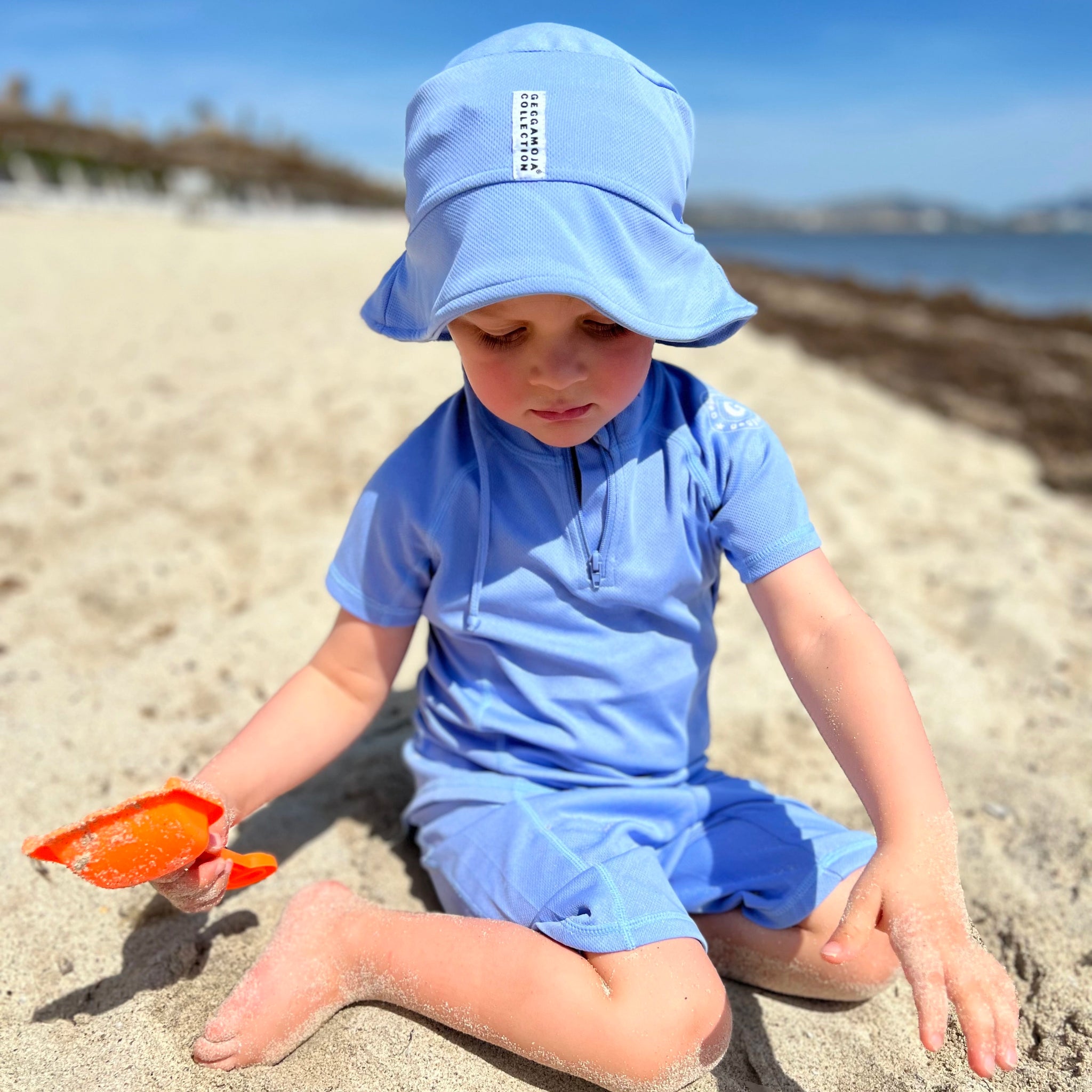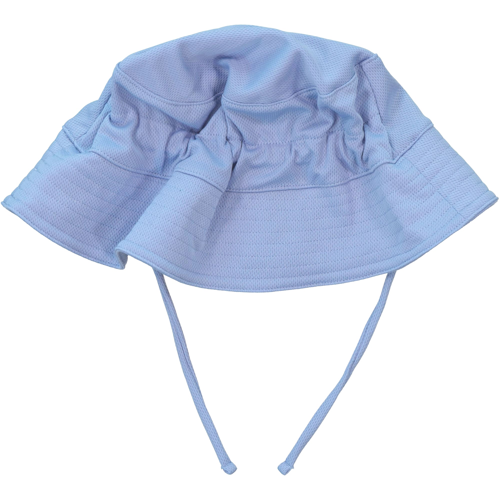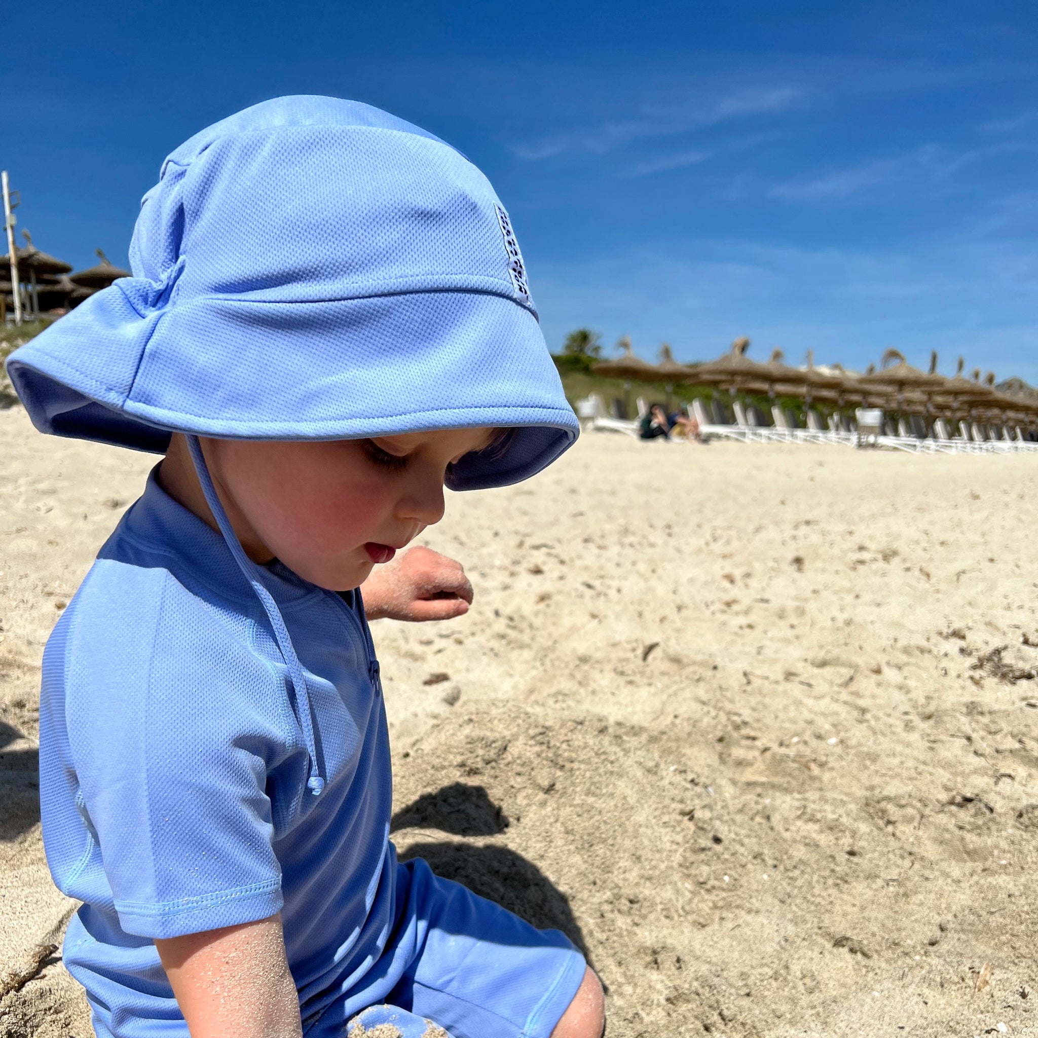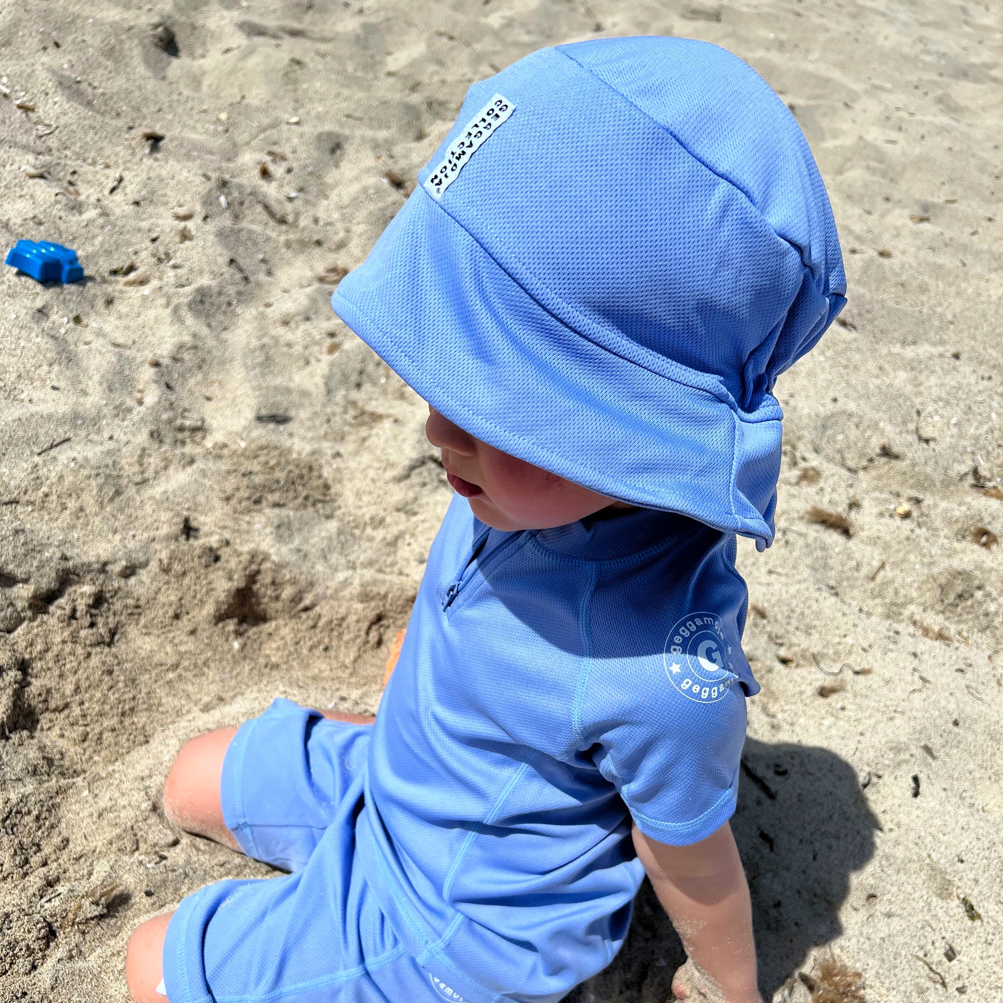En solhatt i blått. Solhatten som funkar lika bra på stranden som på förskolan en varm dag. Tillverkad i ett återvunnet material som andas. Med UV50+ blockeras 98% av solens skadliga UVA- och UVB-strålar.