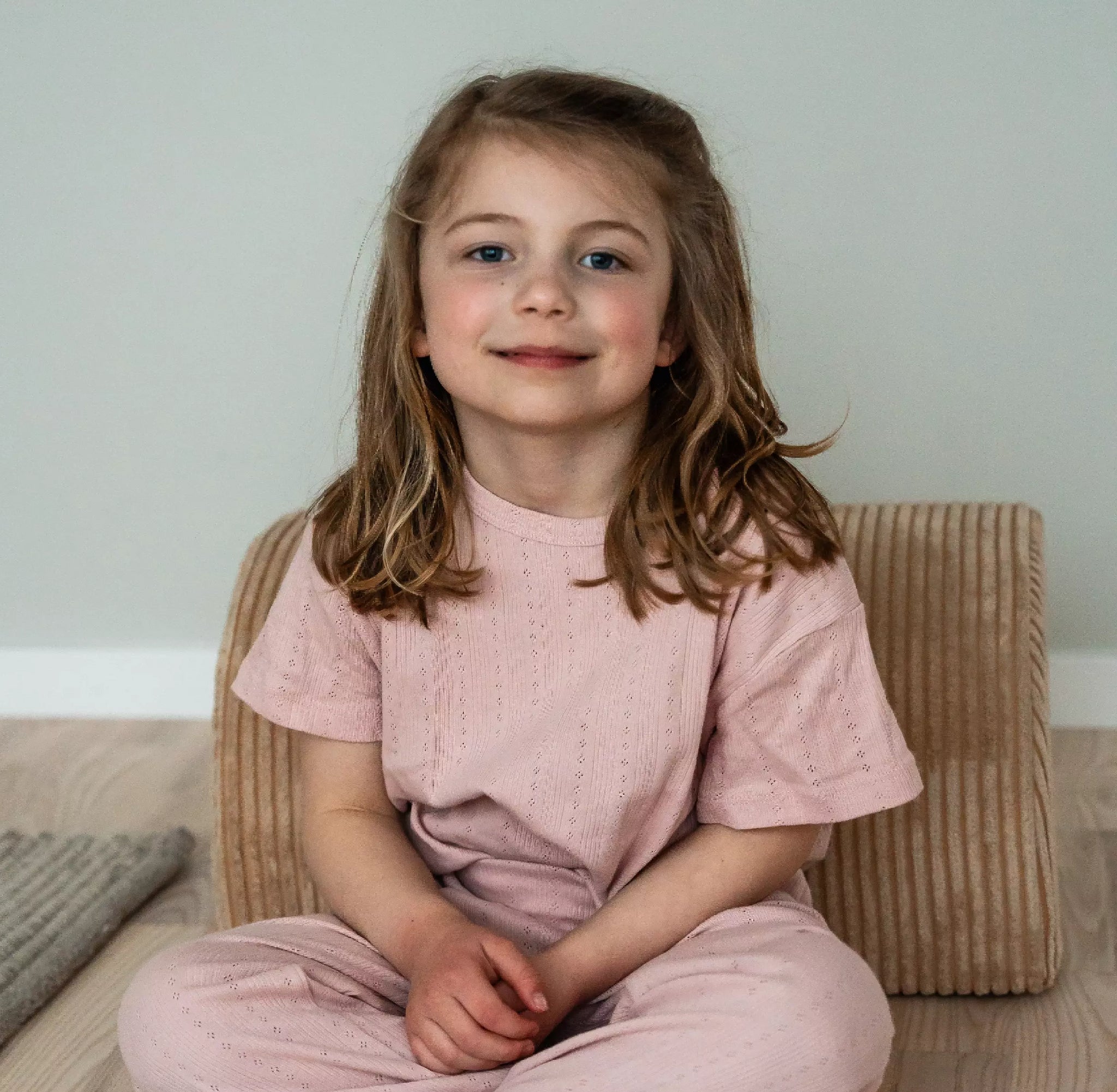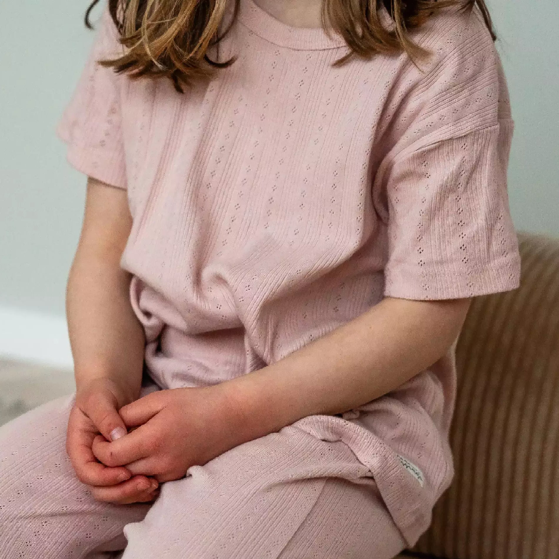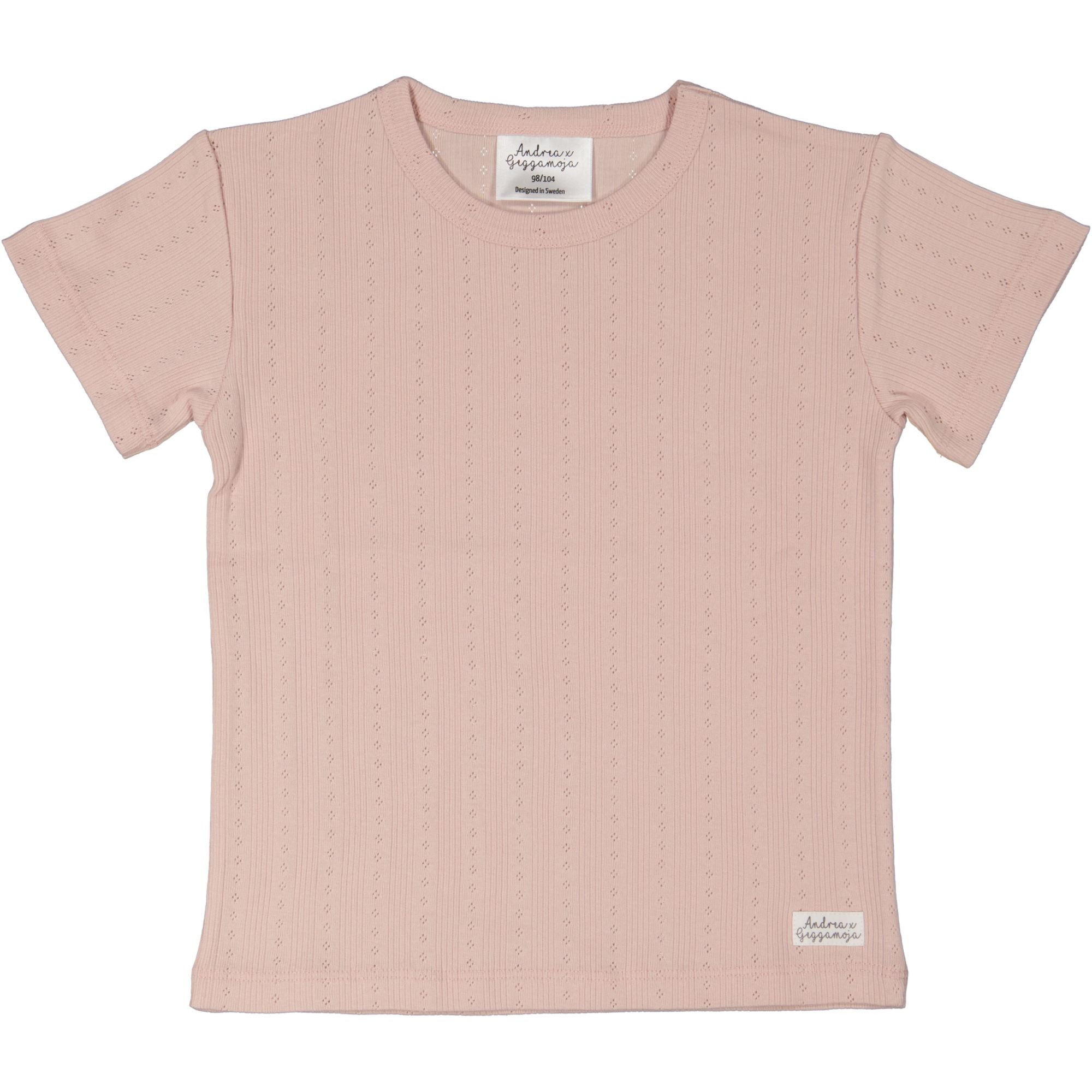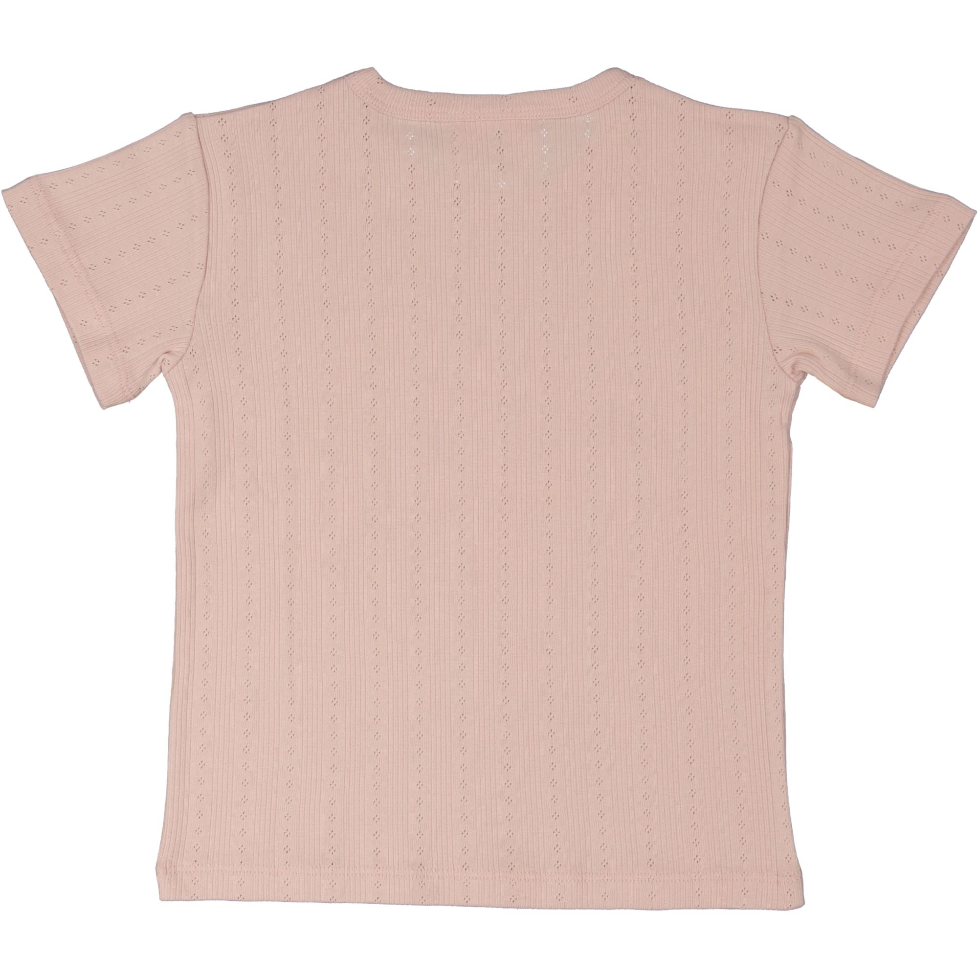 Söt rosa t-shirt i pointelle. Pointelle är ett stickat tygmönster som kan liknas vid spets. Tyget blir lätt och luftigt och dekorativt.
