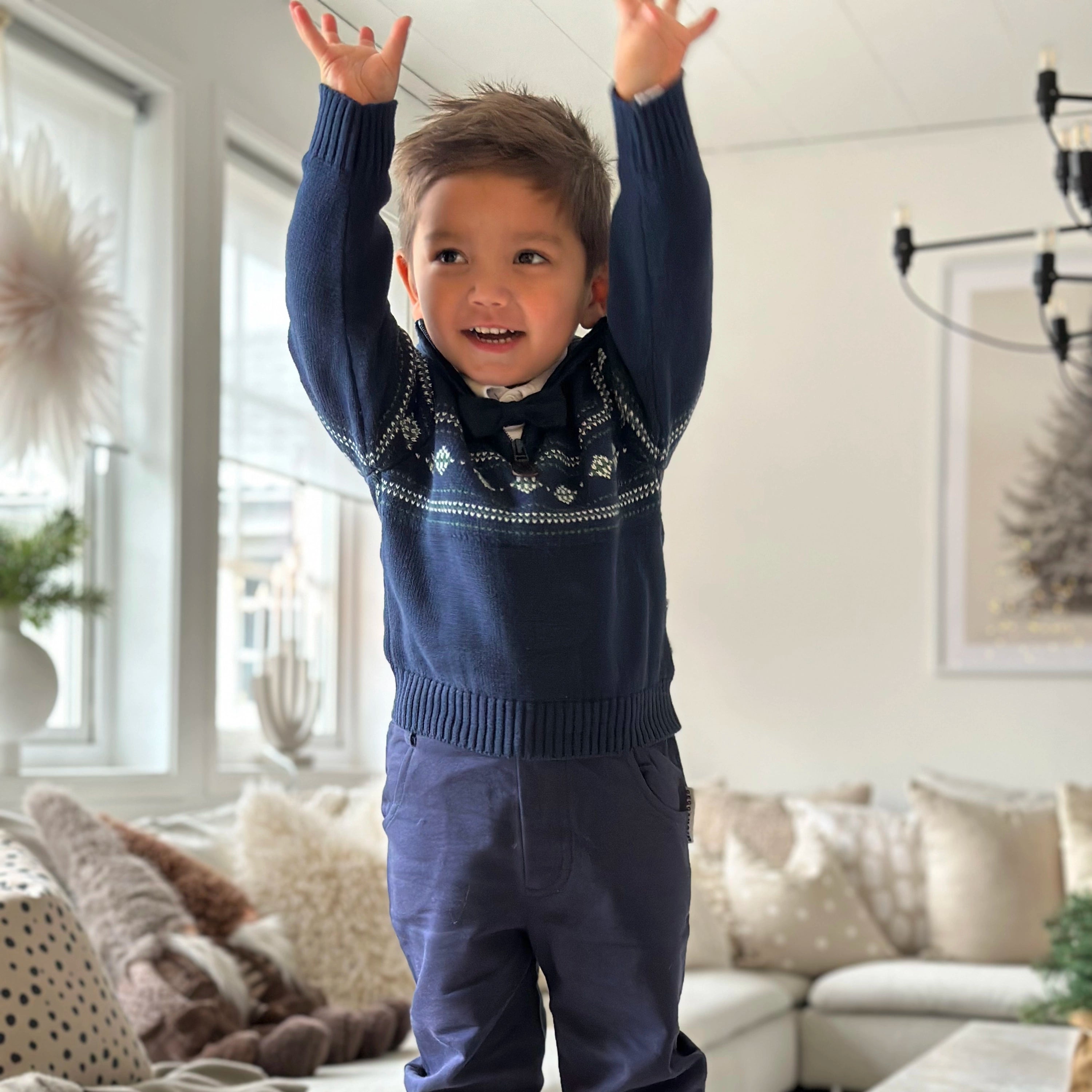 Mjuk och mysig och värmande stickad tröja i bomull med halv-zip. Marinblå med gröna och grå detaljer. Matha med chinos för en perfekt jullook.