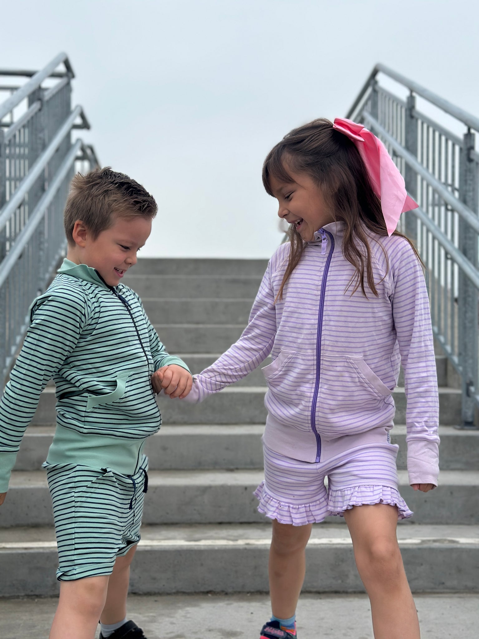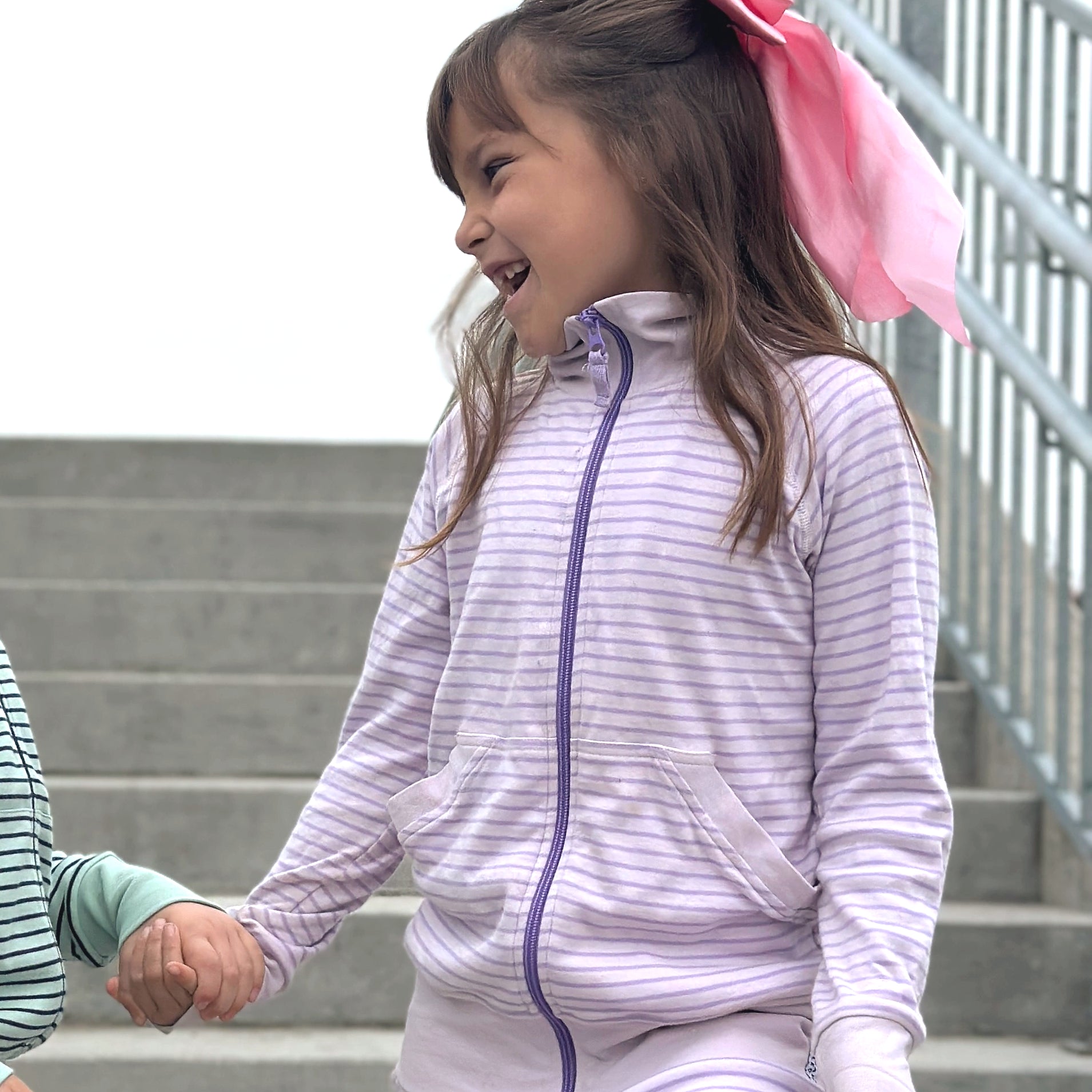 Zipjacka i härliga ränder. Bästa jackan som hängt med sen Geggamojas begynnelse, och som fortfarande är lika poppis! Bra som en lättare jacka ute eller som tröja inne över t-shirten. Breda sköna muddar för bästa komfort.