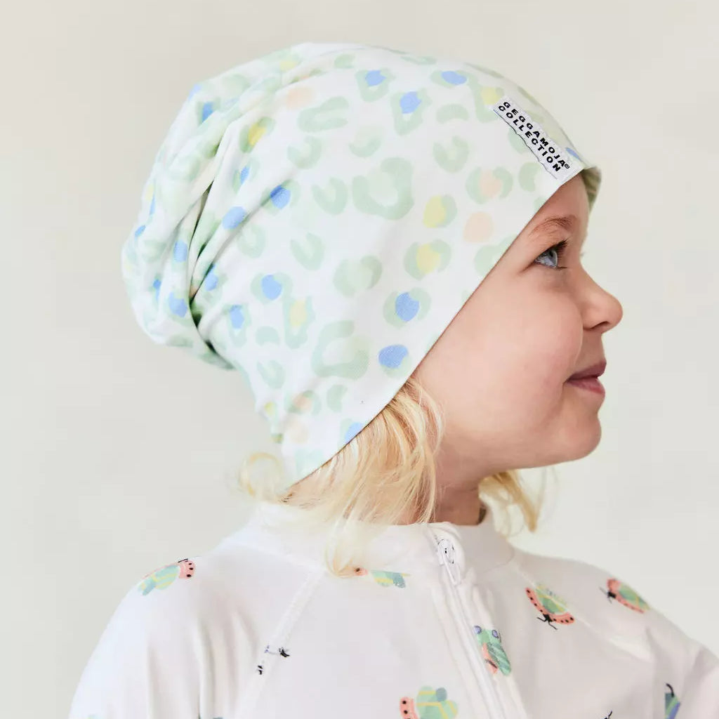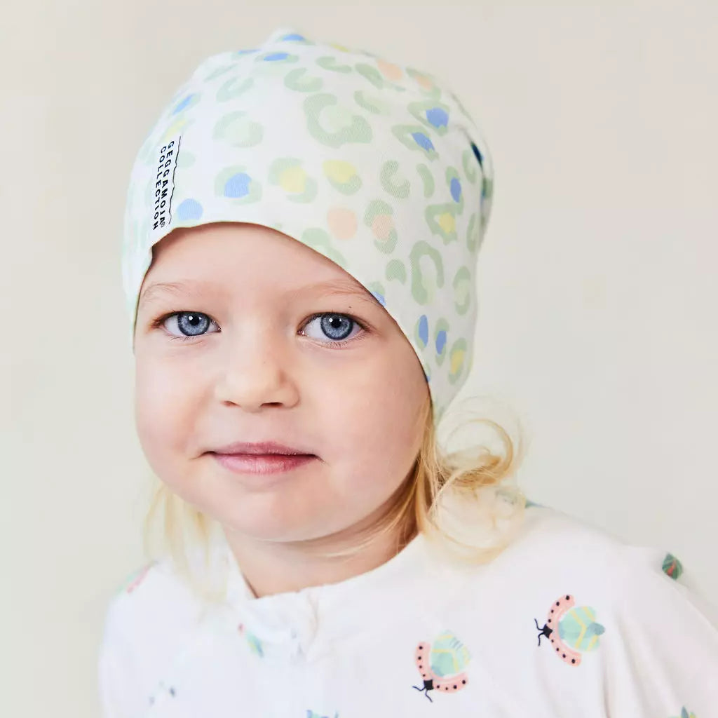 En mössa i mjuk och skön bambu/bomull. Passar vår, sommar och höst. Bambu är ett miljövänligt materialval, det odlas helt organiskt utan bekämpningsmedel och är 100 % biologiskt nedbrytbart. Bambu är lent och bekvämt mot huden och tillåter huden att andas. Dess termiska egenskaper, liksom ull och silke, gör att materialet känns varmt när det är kallt och svalt när det är varmt- ett perfekt material för barnkläder.