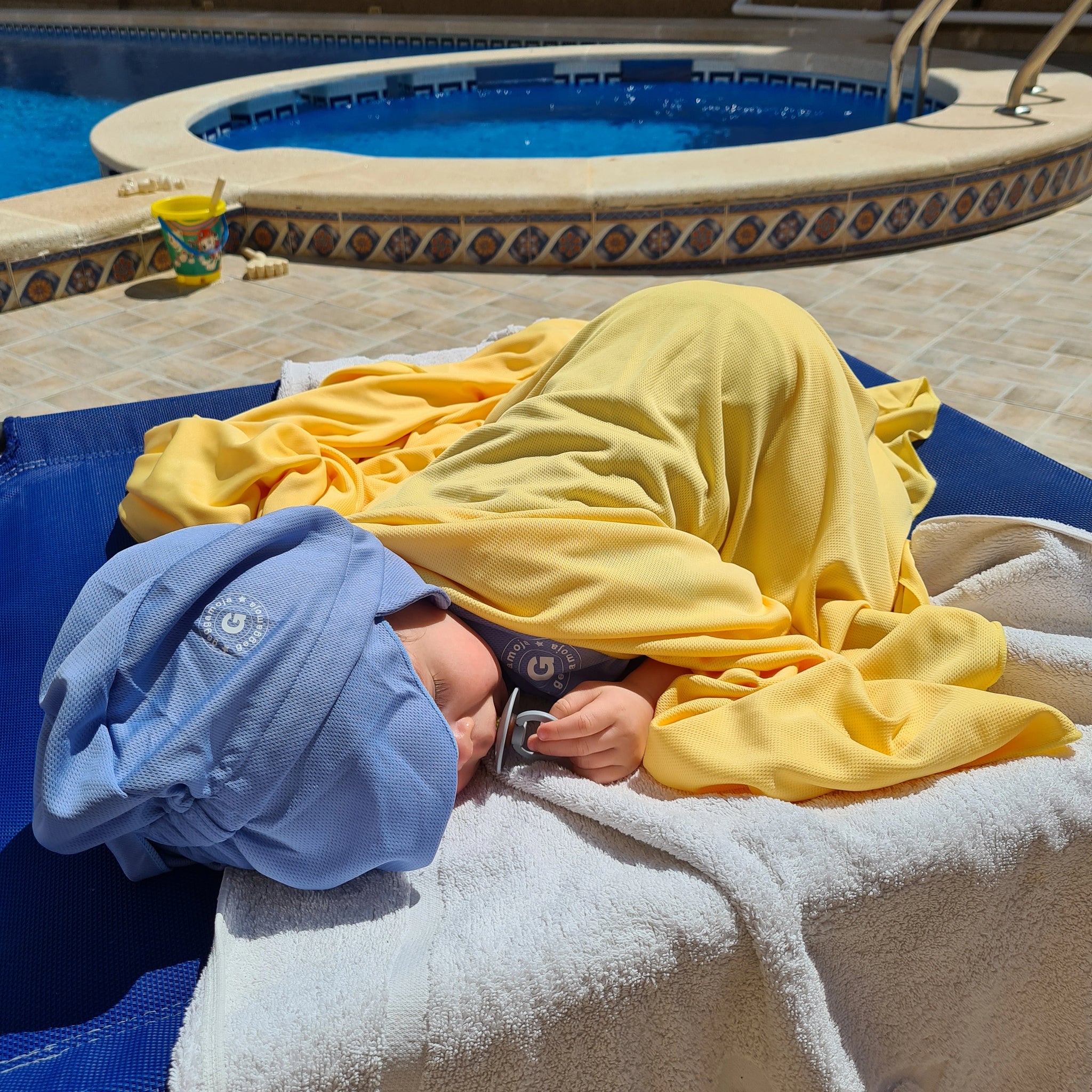 En praktisk UV filt med UV skydd 50+. Filten har många användningsområden. Perfekt att med till stranden, hänga över vagnen, sova under solen eller bara mysa. UV filtens material andas och är tillverkad i ett snabbtorkande material. Storlek 100x150 cm. UV50+ blockerar 98 % av solens skadliga UVA- och UVB-strålar.