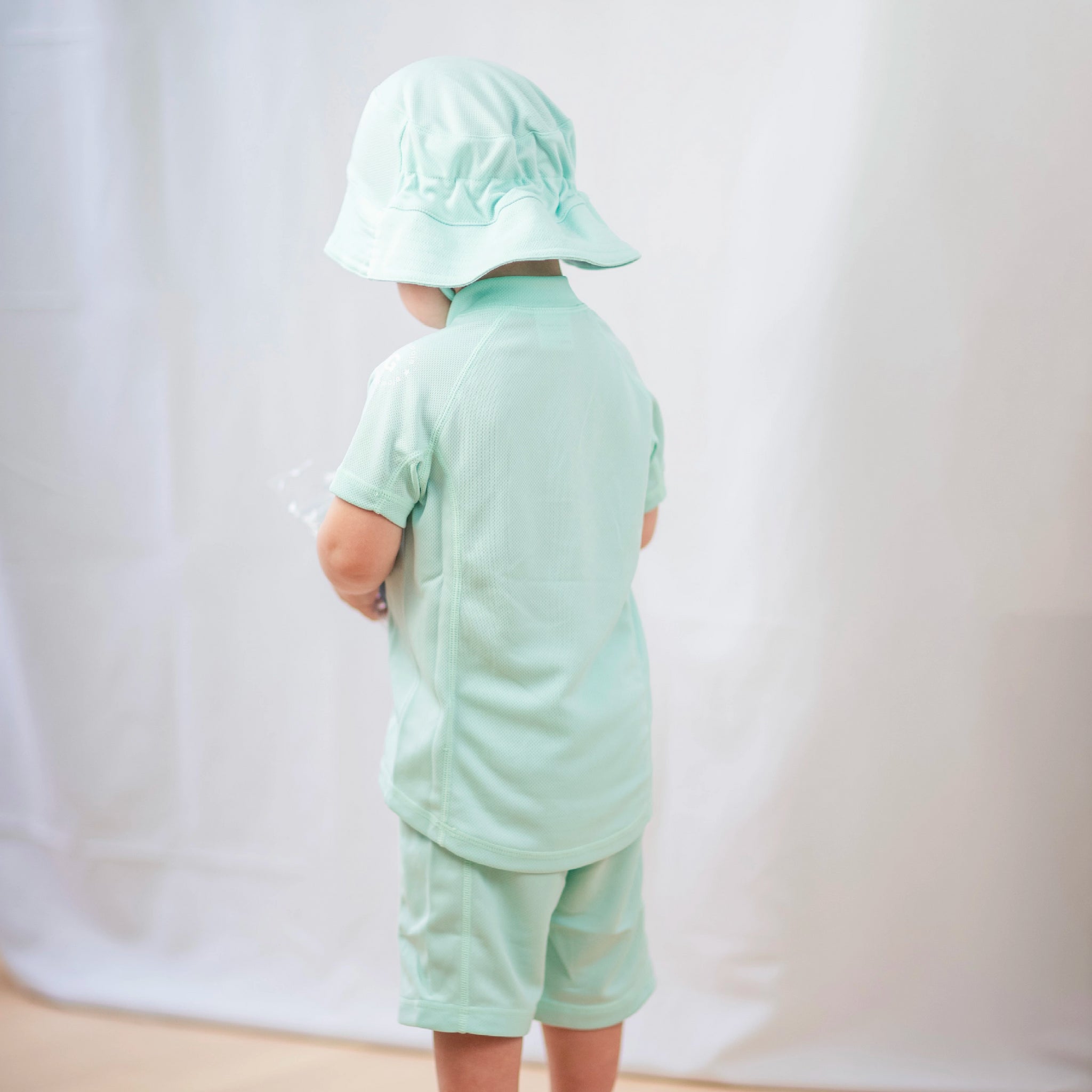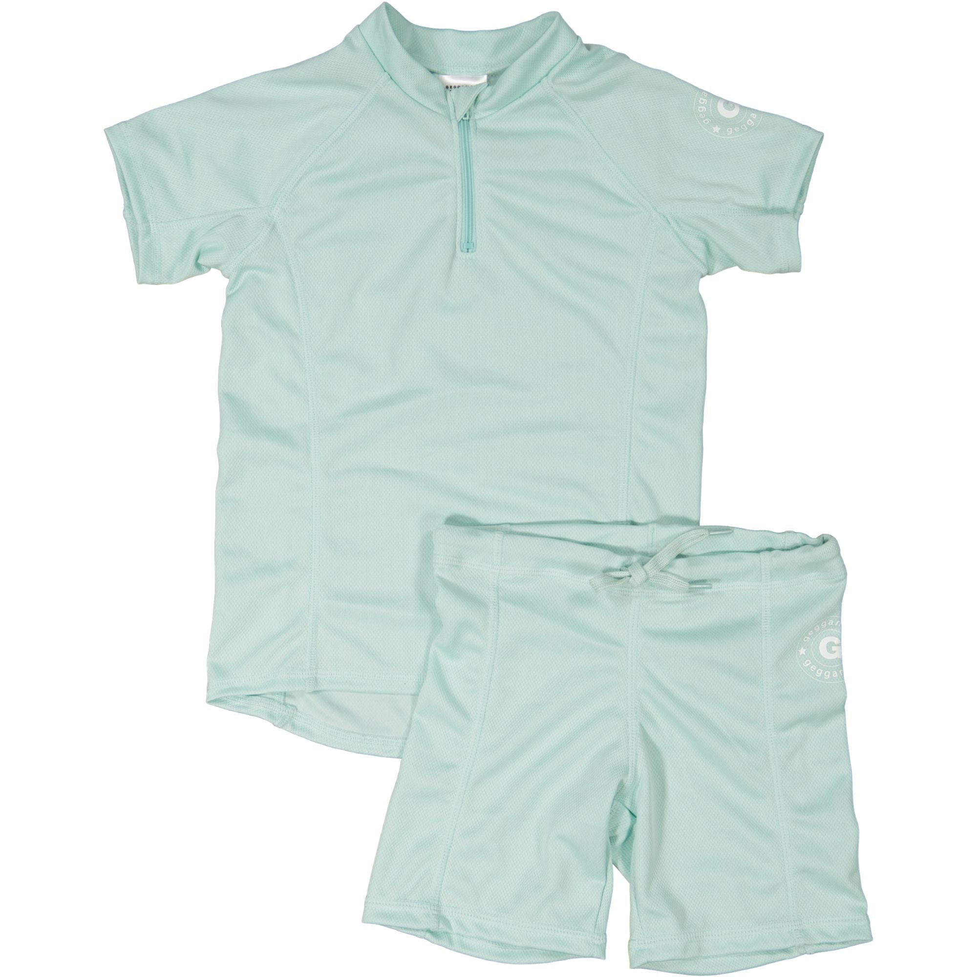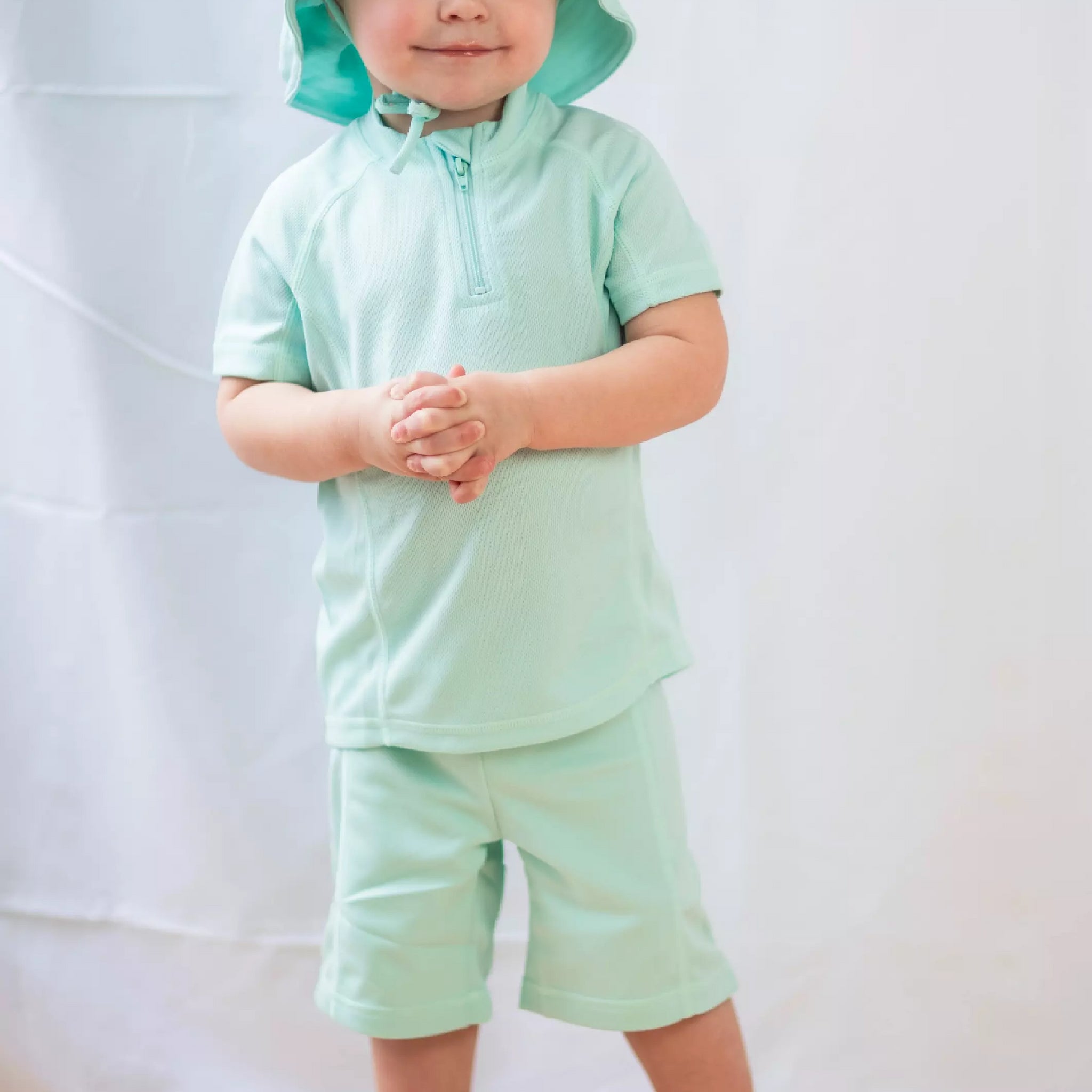 Mintfärgat UV- badset med kortärmad tröja och shorts. Det är tillverkad i ett snabbtorkande material, med UV-50+ som blockerar 98% av solens farliga UVA- och UVB-strålar. En storfavorit hos barnfamiljer. Med ett UV-set skyddar du ditt barn från solen starka stålar både vid poolen eller på stranden. Tröjan har en dragkedja framtill för enkel på och avklädnad.