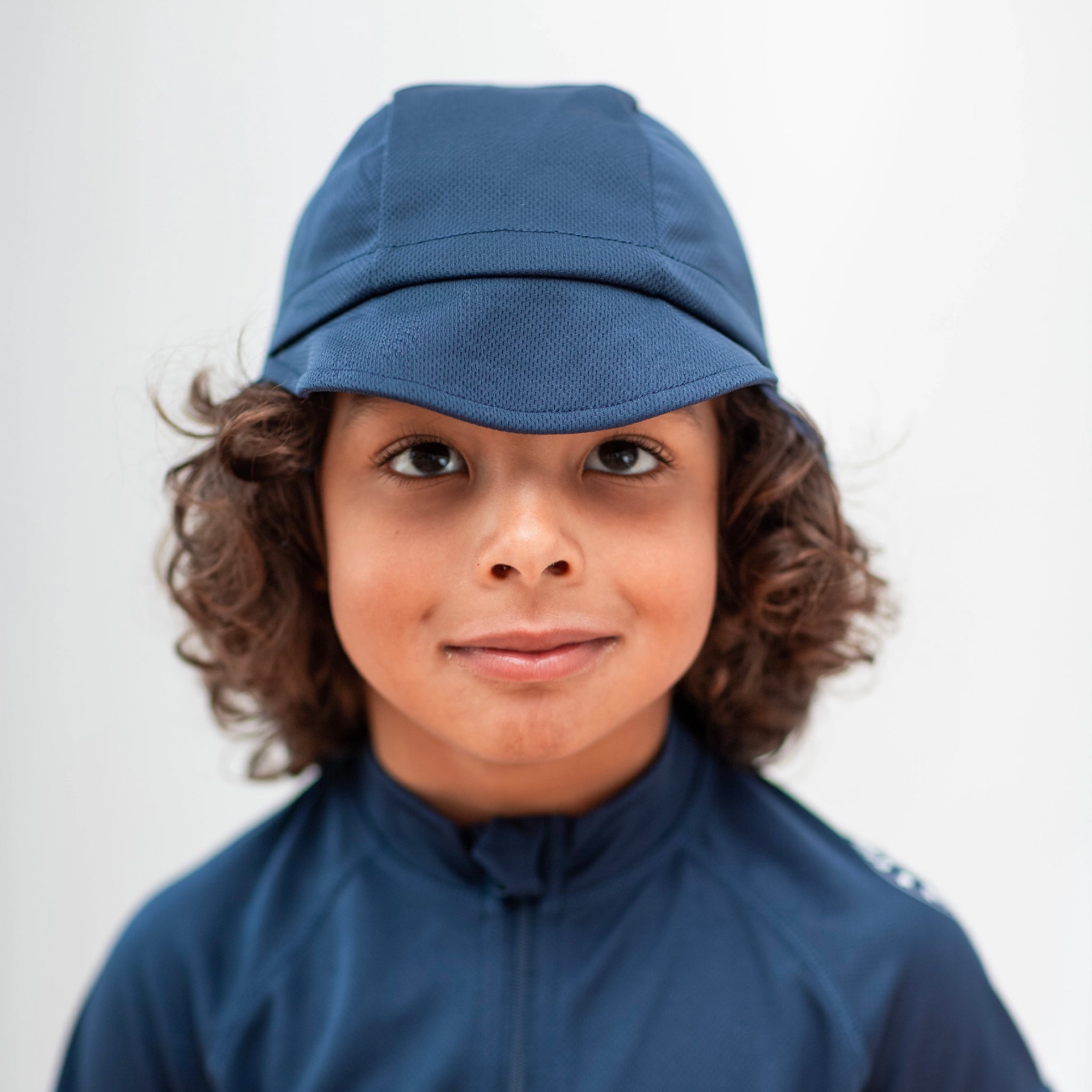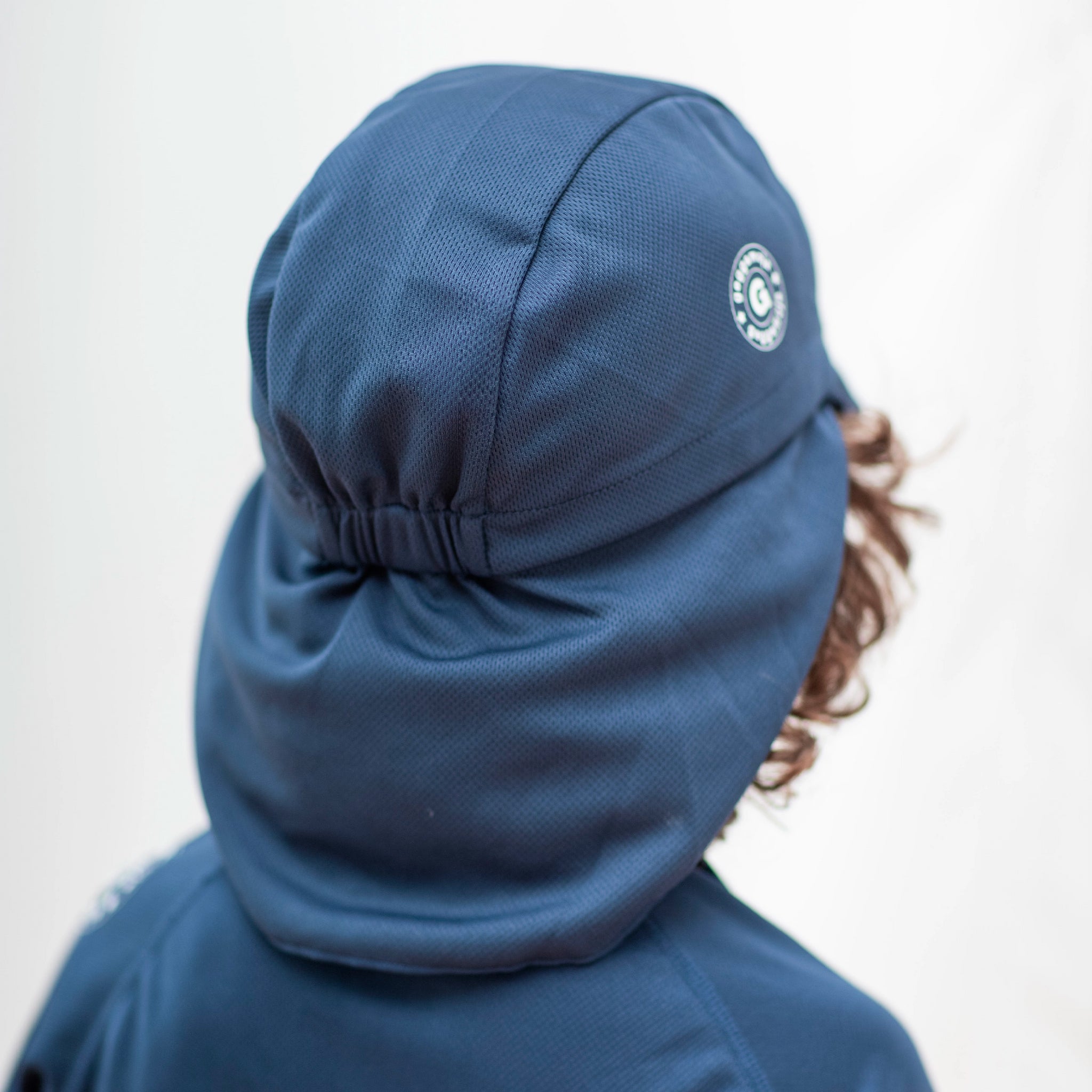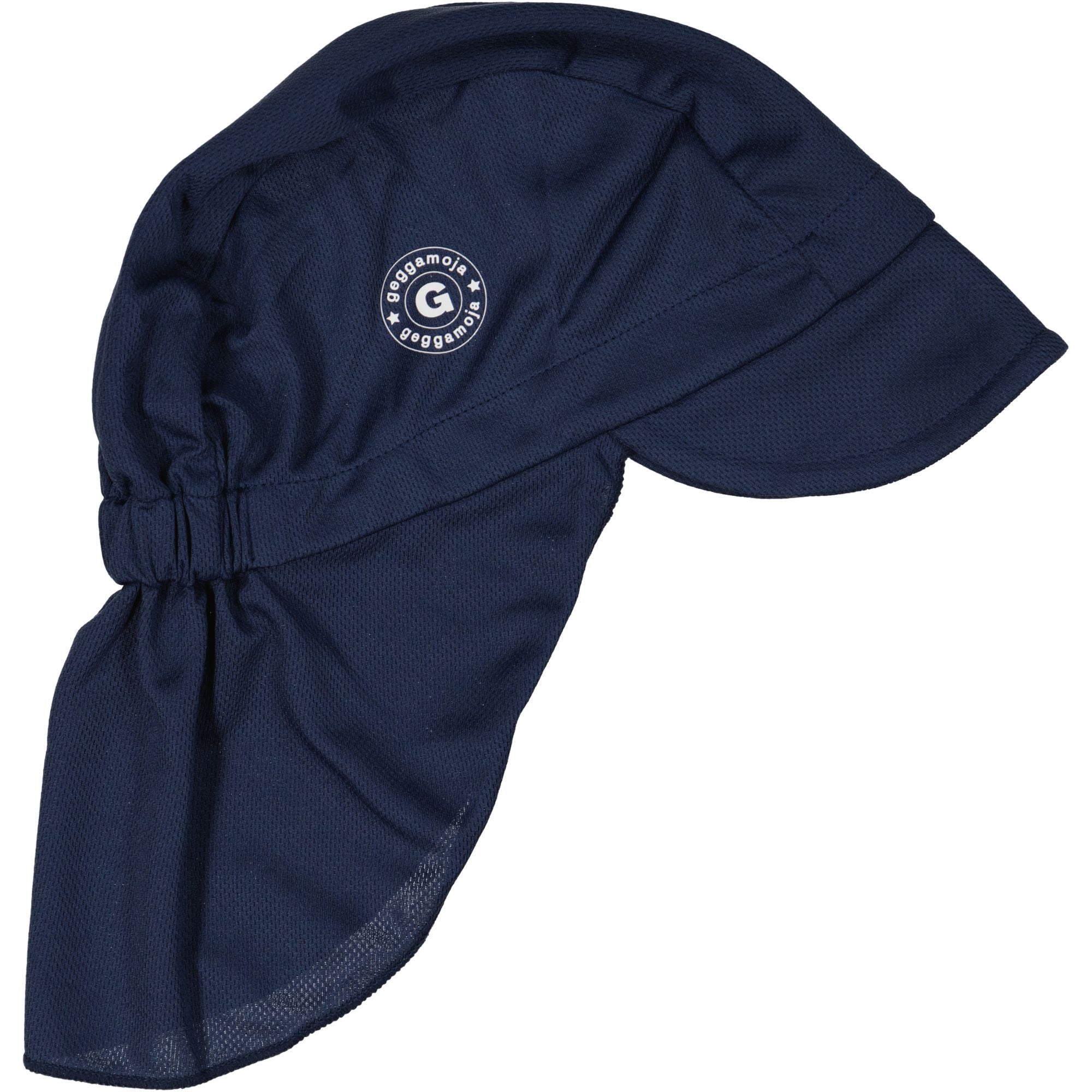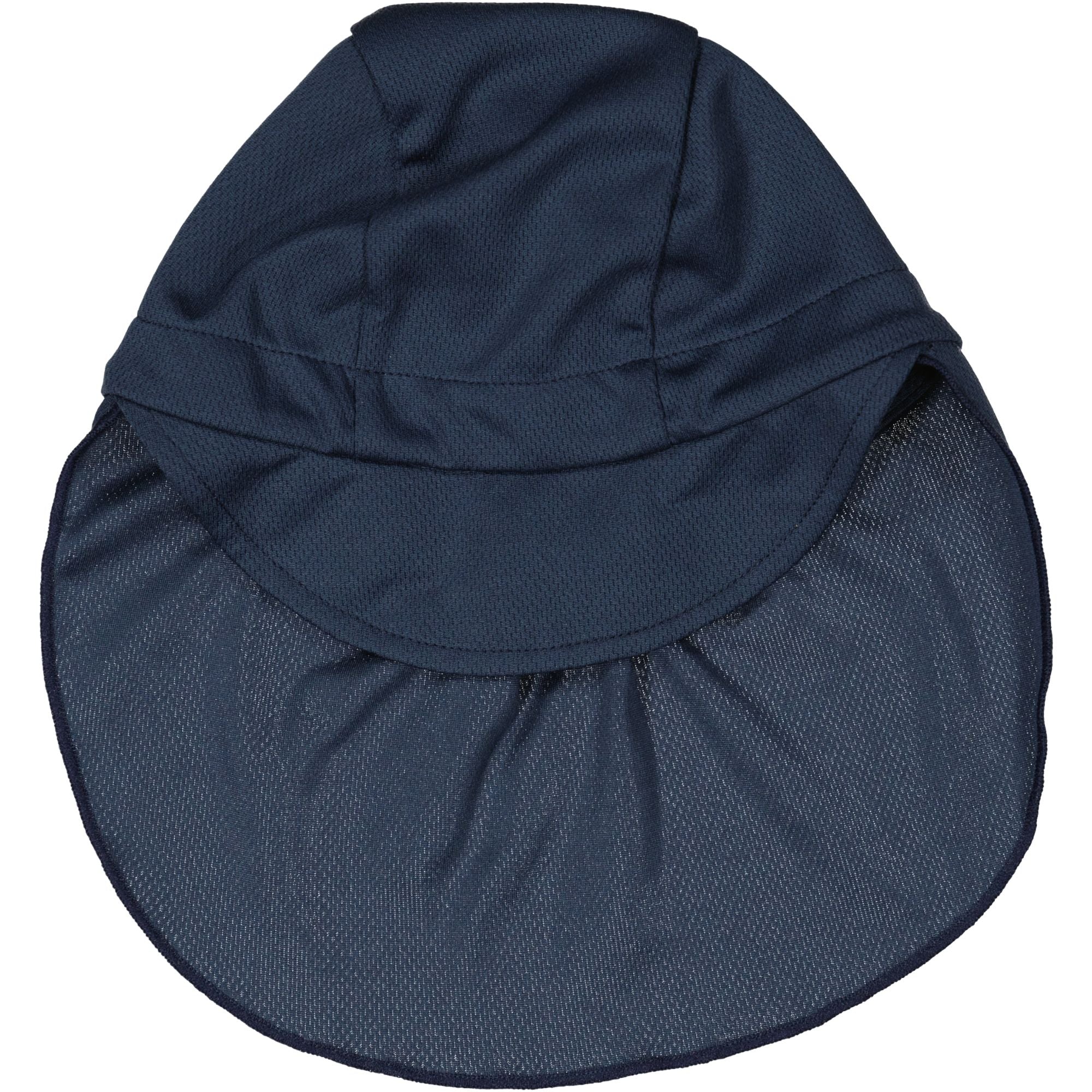Marinblå UV- solhatt med "kappa" och skärm.  Hatten är ett viktigt plagg när solen skiner. Den här tunnare modellen utan foder är tillverkad i elastiskt material med solskyddsfaktor 50+. En skärm skyddar ansiktet och ett brätte baktill skyddar nacken mot solen.