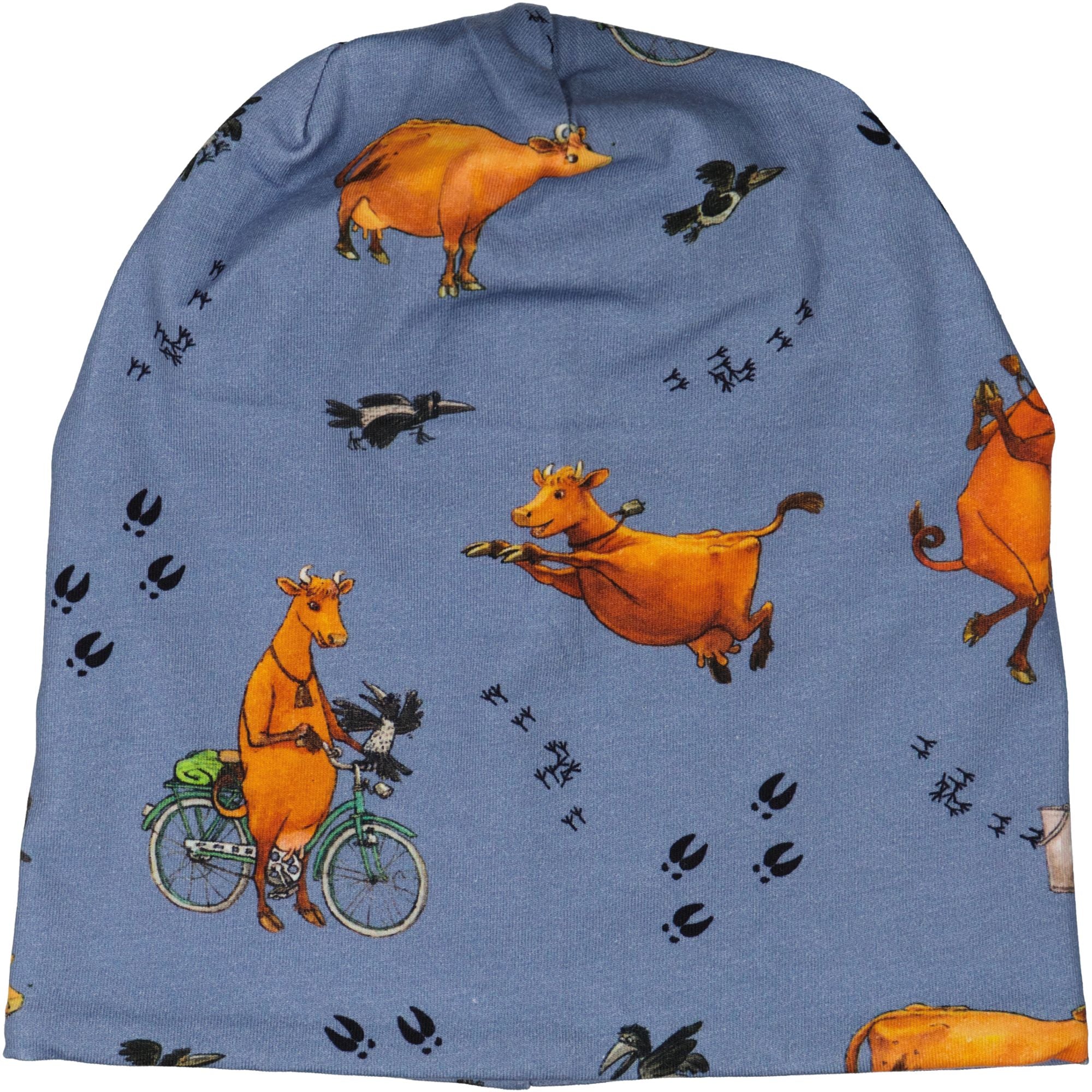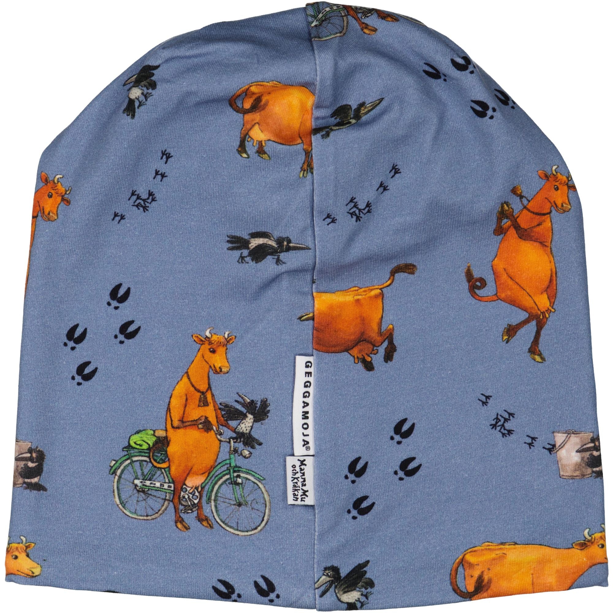Fleecemössa med Mamma Mu och kråkan print. Mössan är i Ekologisk bomull och har ett fleecefoder. Geggamojas härliga passform som passar alla, liten som stor.
