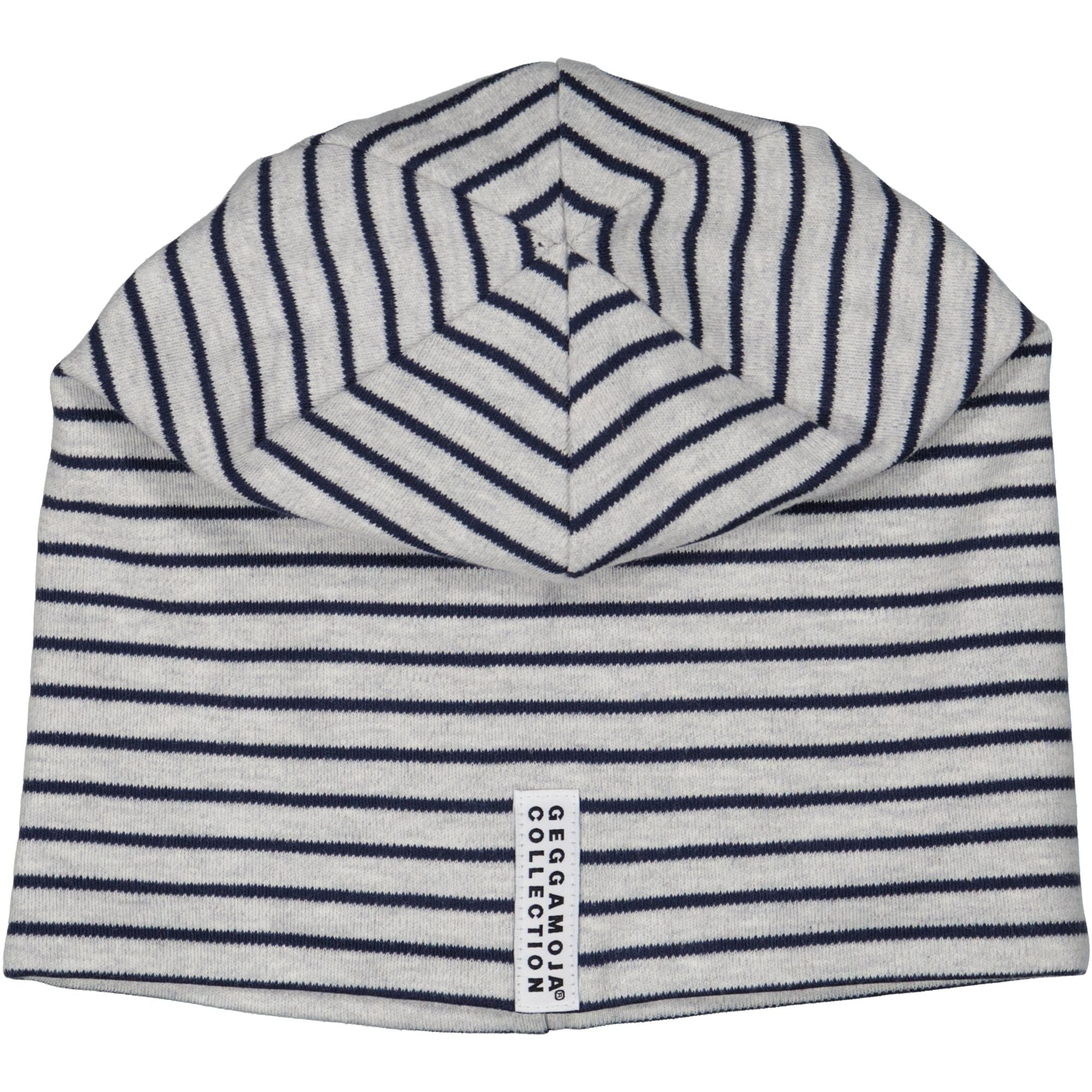 Geggamojas klassiska mössa i grå och marinblårandig -bomull! Denna med mjukt fleecefoder som värmer kalla höst- och vintertider.