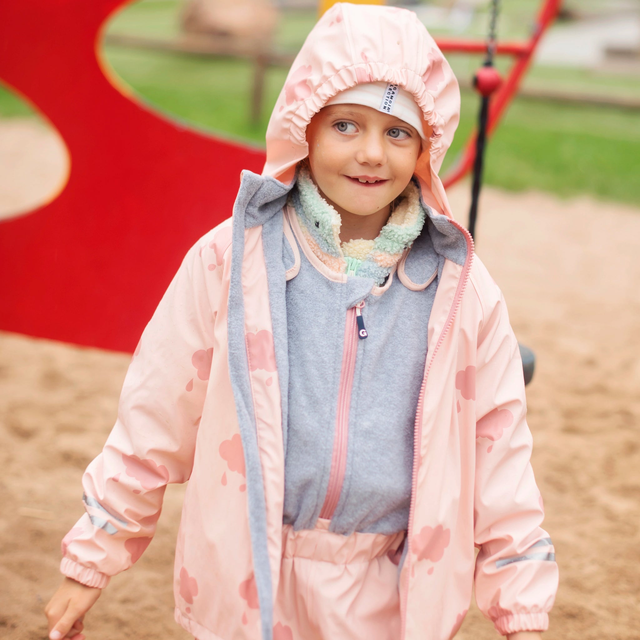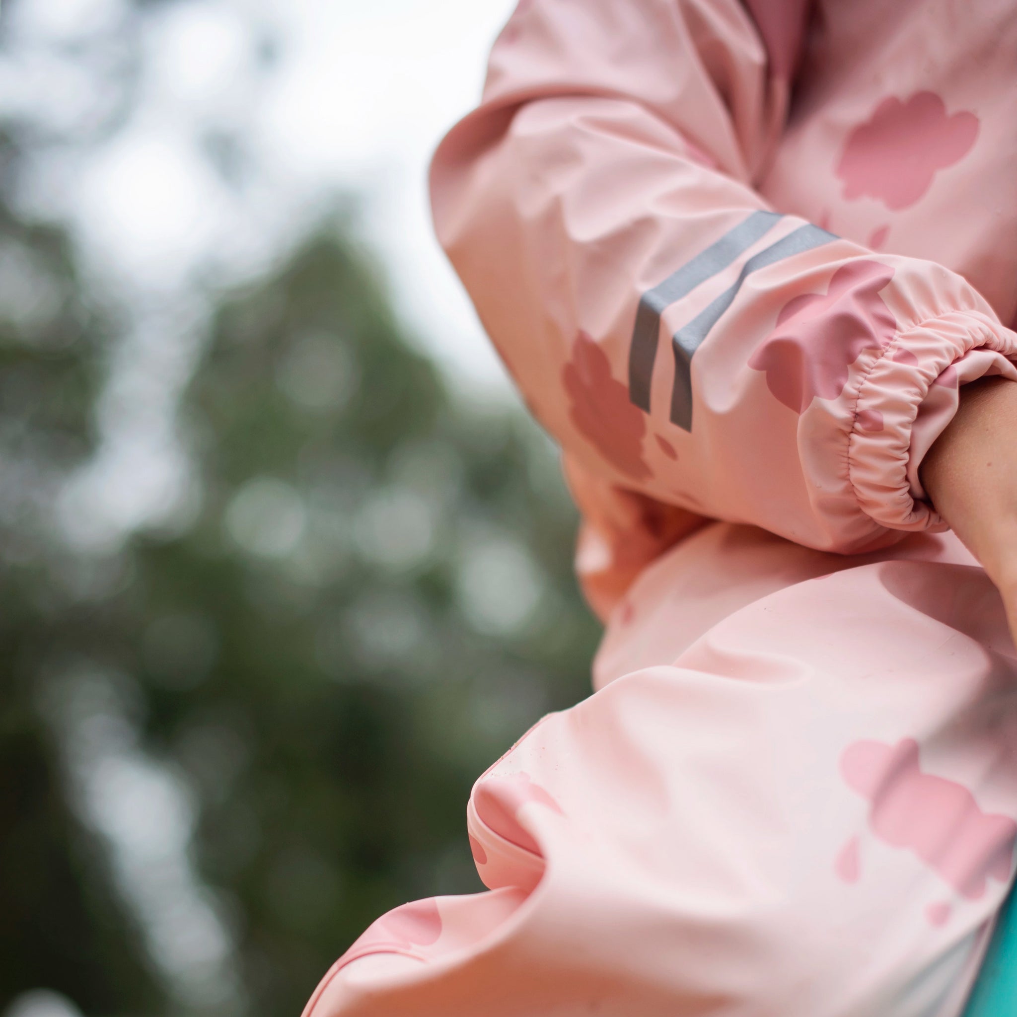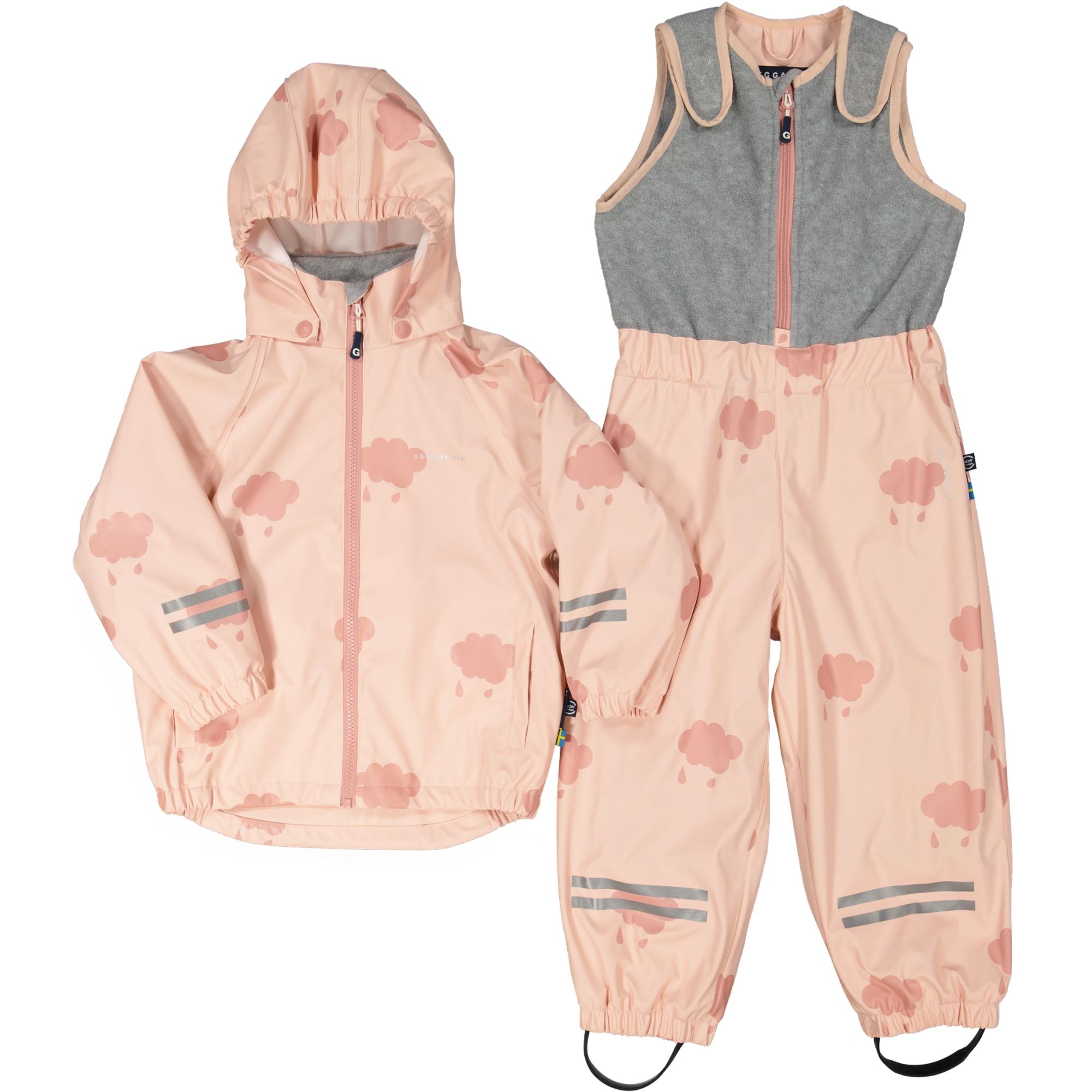 Regn och rusk? Inga problem med detta funktionella fleecefodrade regnställ som håller barnet torrt och bekvämt, vare sig det är regnlek, skogsutflykt eller en riktigt blöt promenad till förskolan. Reflexdetaljer på både jacka och byxa ser till att barnet syns även när ljuset är svagt. Den högre byxmodellen är bekväm och ger skydd mot glipor. Reglerbara hängslen och en justerbar midja med knappar gör att passformen enkelt kan anpassas.