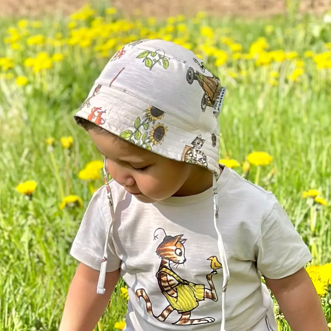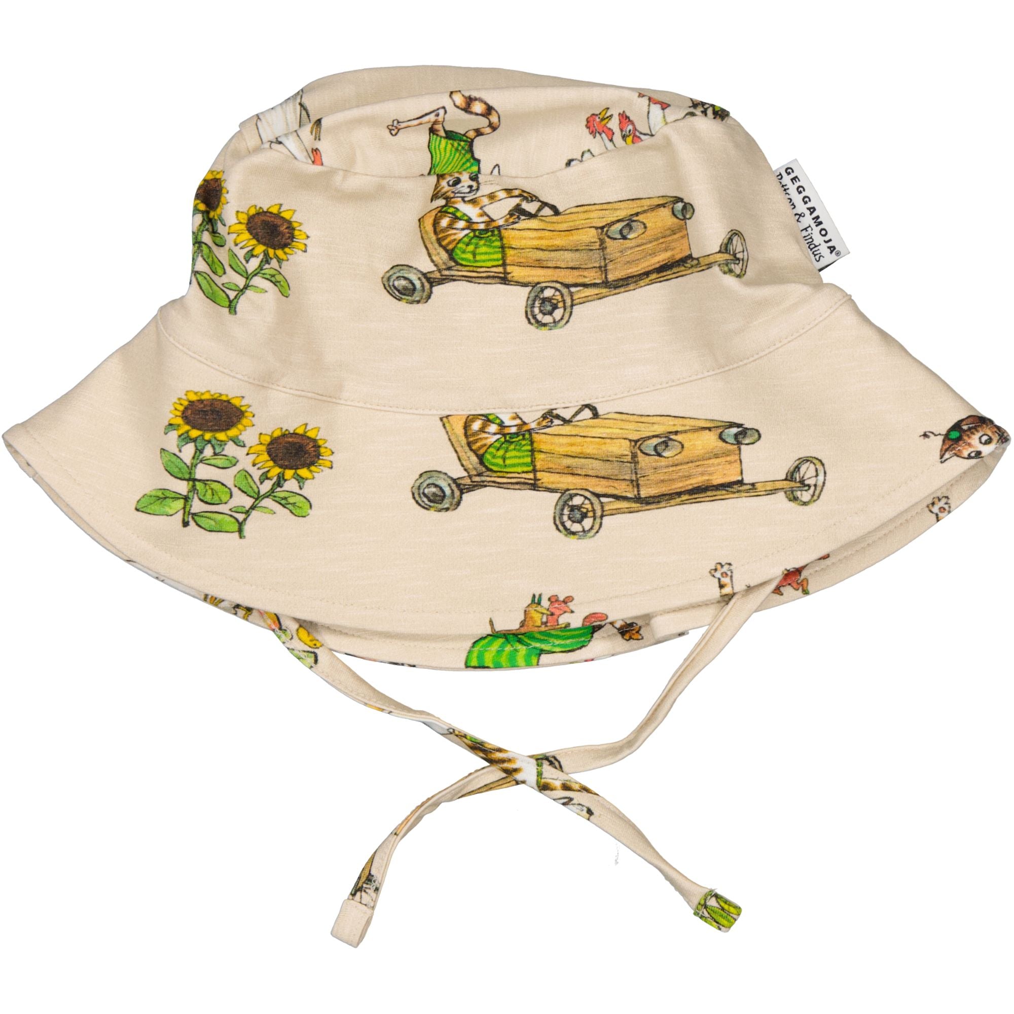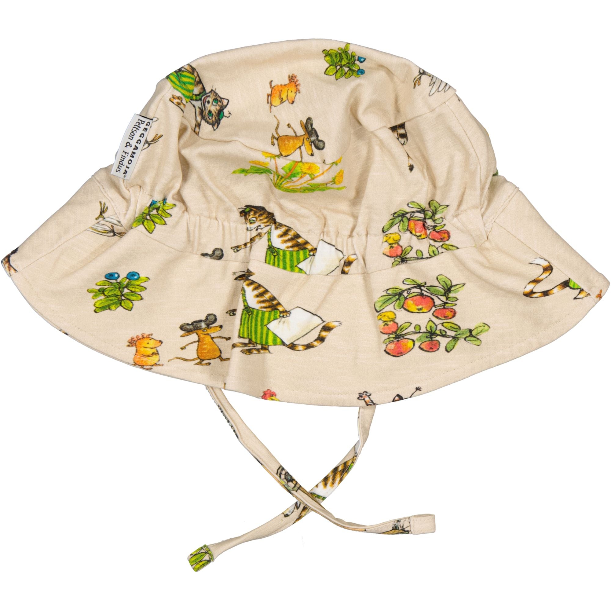 Ein Sonnenhut aus weicher, kühler Baumwolle mit Pettson & Findus-Motiv. Der Sonnenhut hat Bänder zum Binden unter dem Kinn und einen Gummizug hinten für die beste Passform.