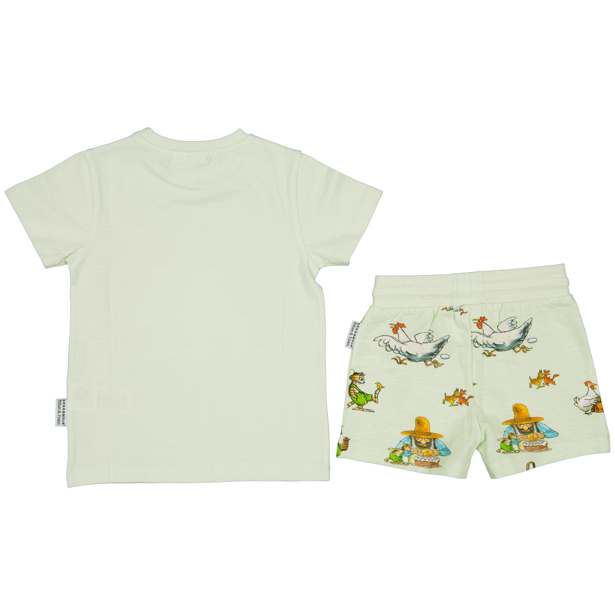 Zweiteiliges Set mit Pettson & Findus aus weichem und angenehmem Bio-Baumwoll-Slub. Das Set besteht aus einer kurzen Hose mit Gummizug in der Taille und einem kurzärmeligen Oberteil. Es kann als Schlafanzug oder als gemütliches Set getragen werden.