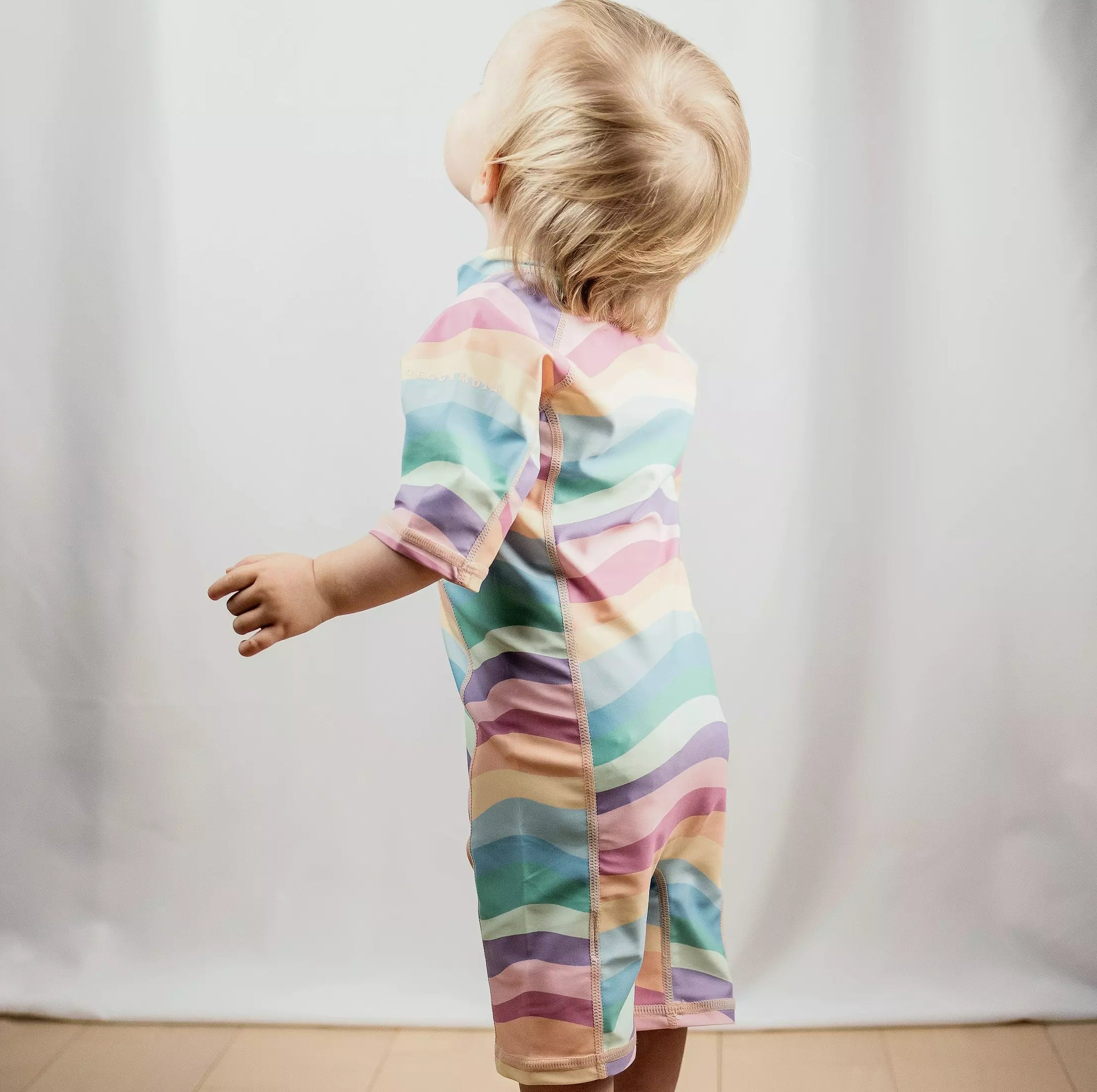 UV-Anzug mit kurzen Beinen und 3/4-Ärmeln, der Ihr Kind vor den Sonnenstrahlen schützt. Er ist praktisch und nützlich mit einem Reißverschluss vorne. Ein großer Favorit bei Familien mit Kindern wegen seiner Einfachheit und dem Sonnenschutz. Der UV-Anzug ist aus schnell trocknendem Material gefertigt, mit UV-50+, das 98 % der gefährlichen UVA- und UVB-Strahlen der Sonne blockiert. Der Anzug hat einen Reißverschluss vorne für einfaches An- und Ausziehen.