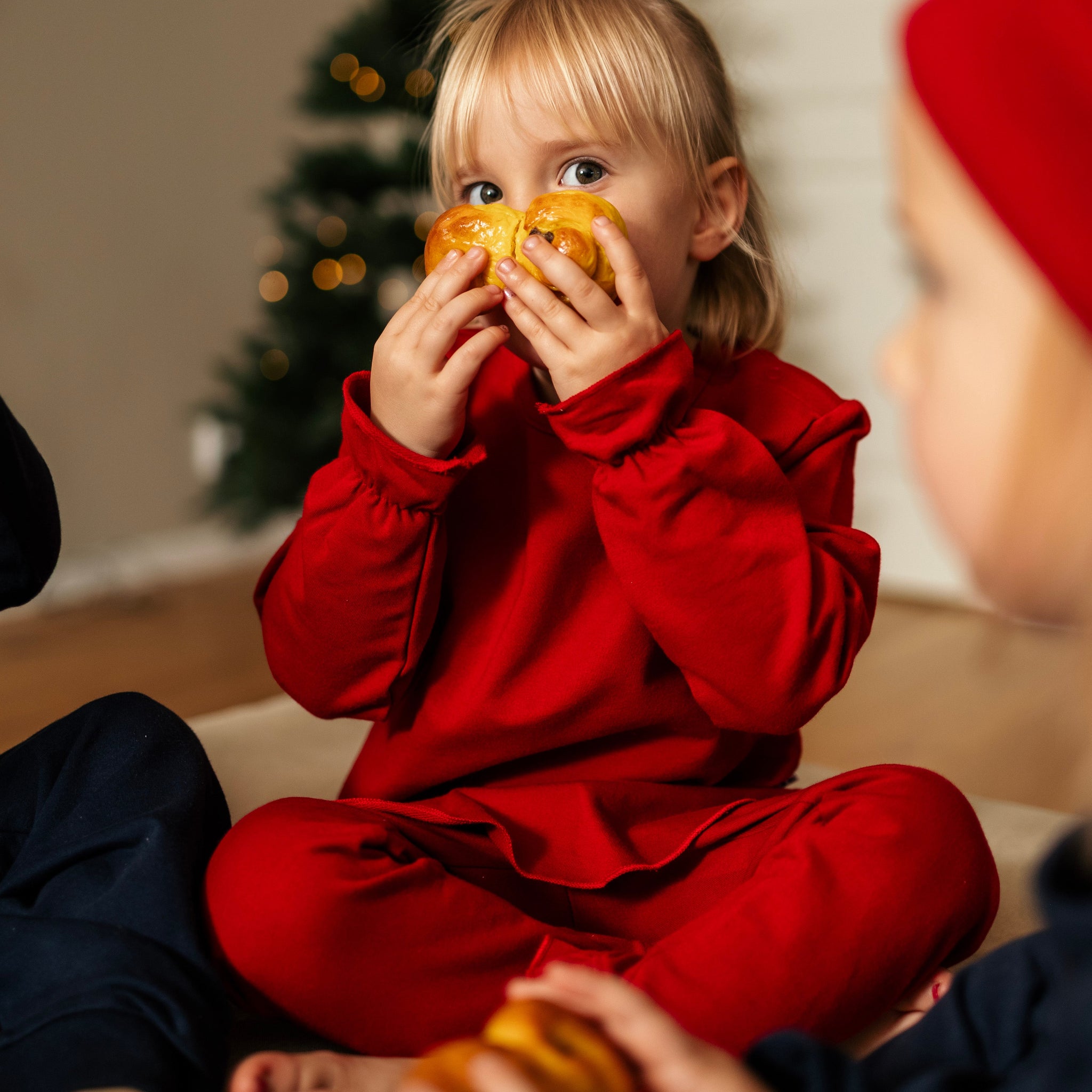 Set mit Pullover und Leggings aus Bio-Baumwolle. Der Pullover hat Volants an den Ärmelenden und am Saum. Leggings mit Volants am Beinabschluss und verstellbarem Lochgummi in der Taille.
