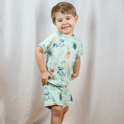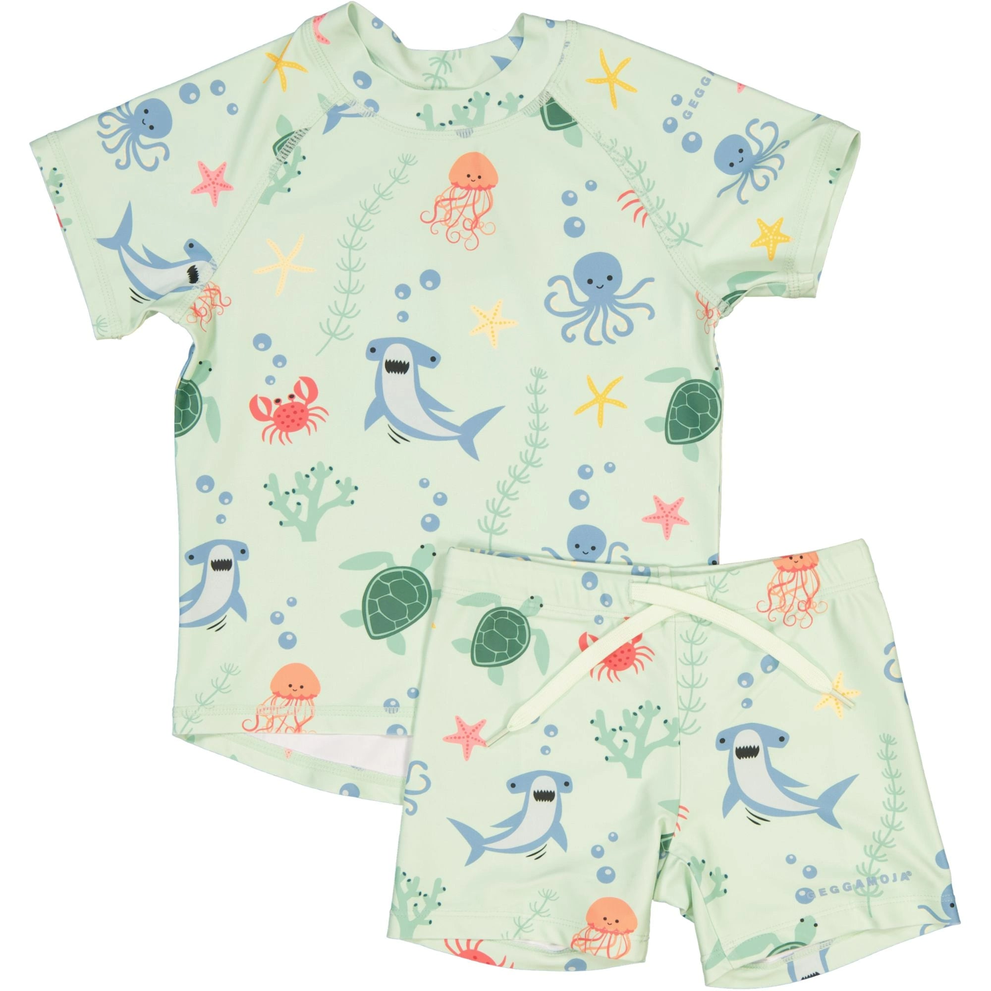 UV-Bad-Set mit kurzärmeligem Shirt und Shorts. Es ist aus schnell trocknendem Material gefertigt, mit UV-50+, das 98 % der schädlichen UVA- und UVB-Strahlen der Sonne blockiert. Ein großer Favorit bei Familien mit Kindern. Mit einem UV-Set schützt du dein Kind vor den starken Sonnenstrahlen.