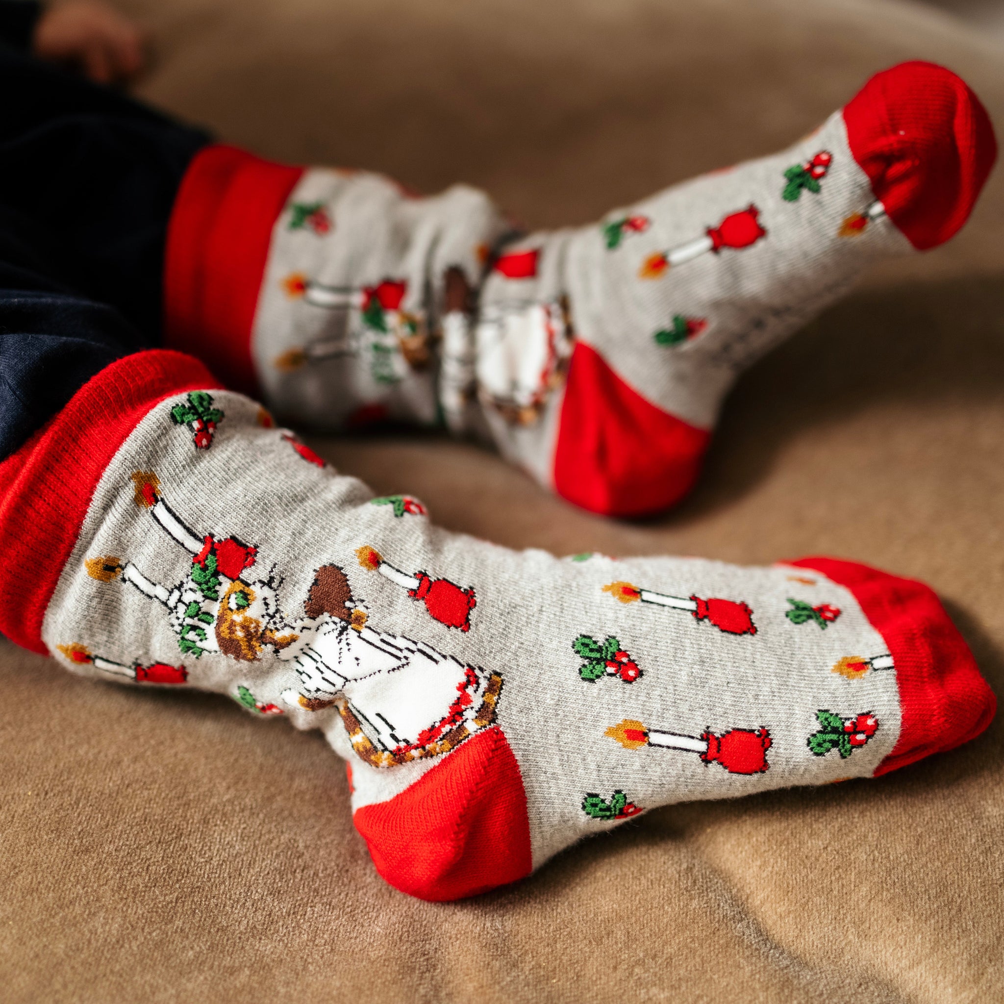 Geben Sie kleinen Füßen sowohl Komfort als auch verspielten Stil mit diesem 2er-Pack Qualitätsstrümpfe mit dem Motiv der frechen Katze Findus mit Weihnachtsmotiv.