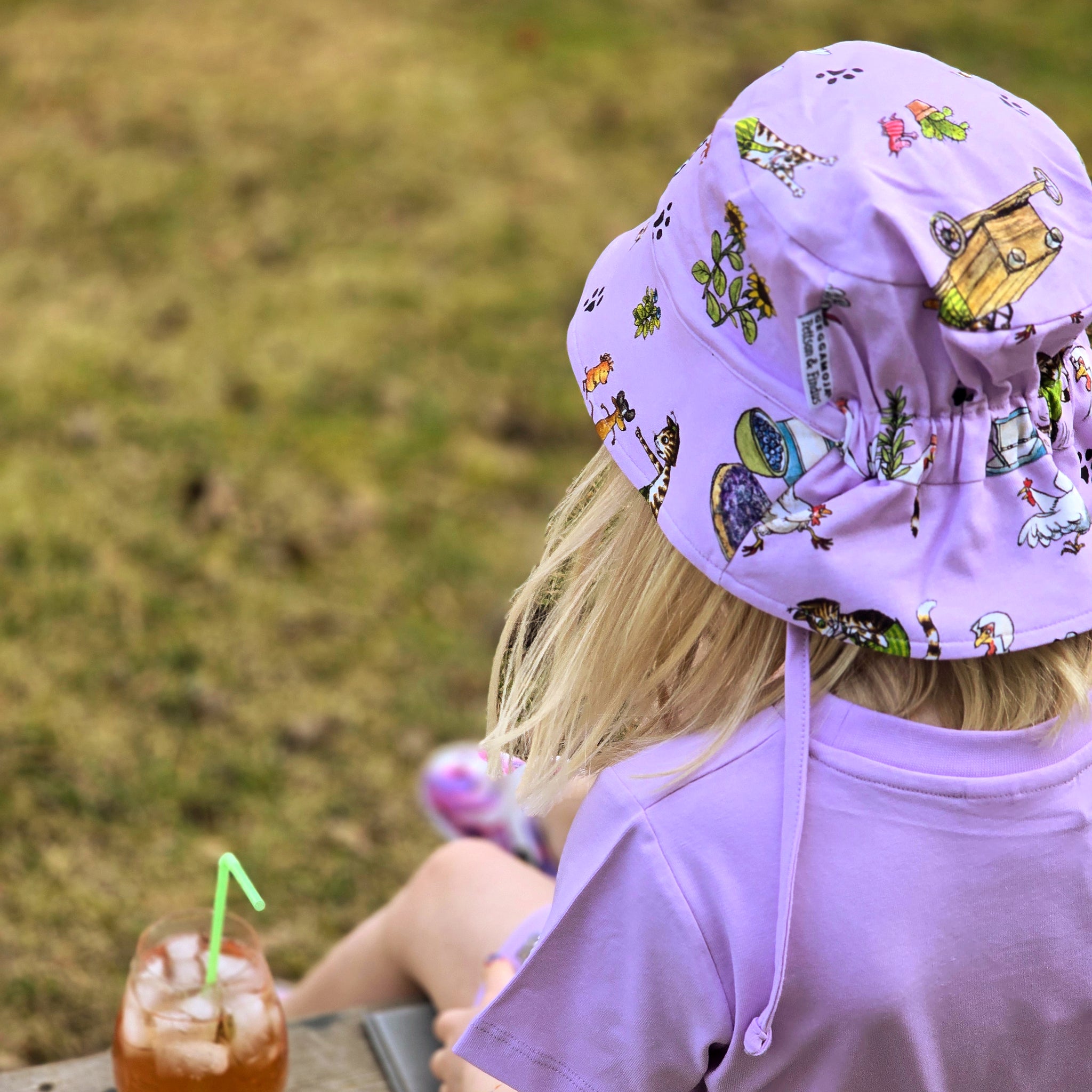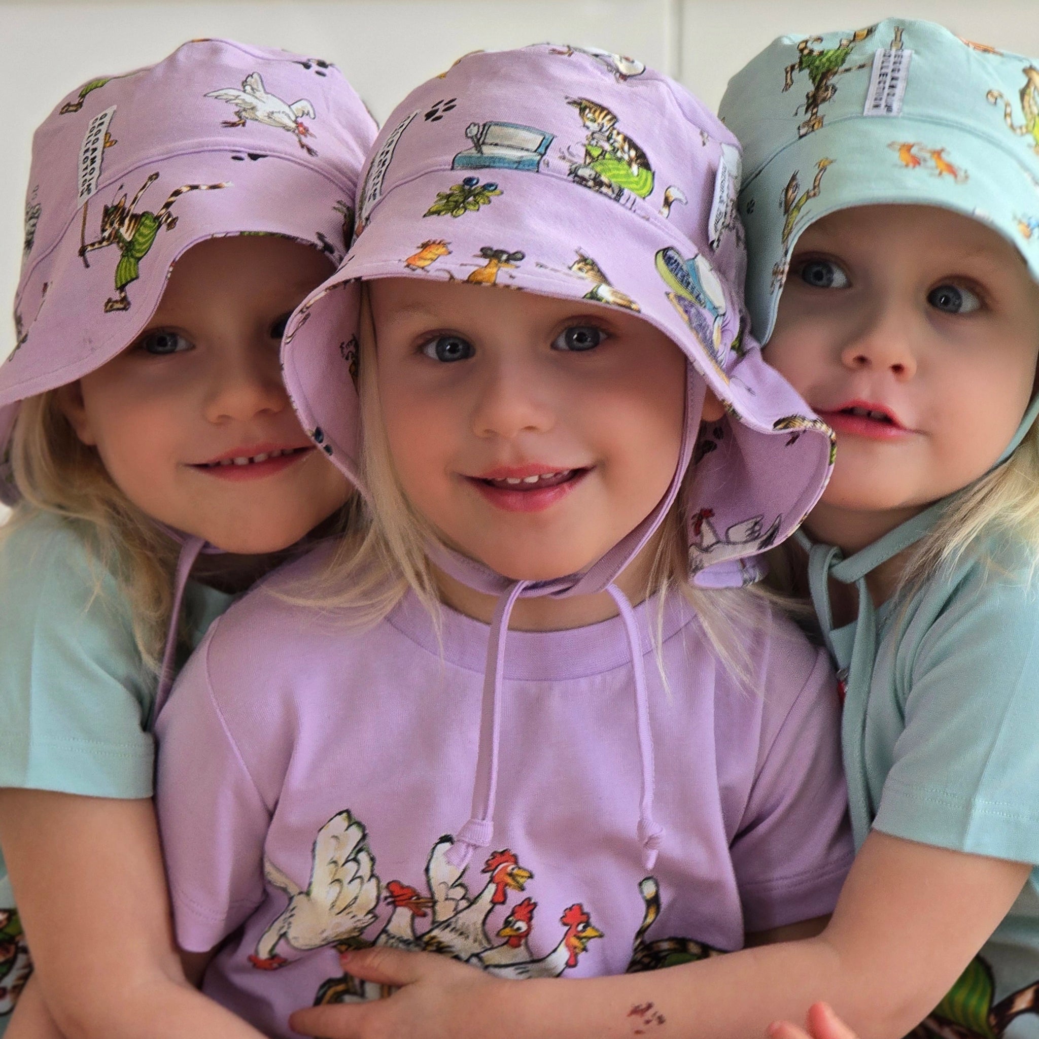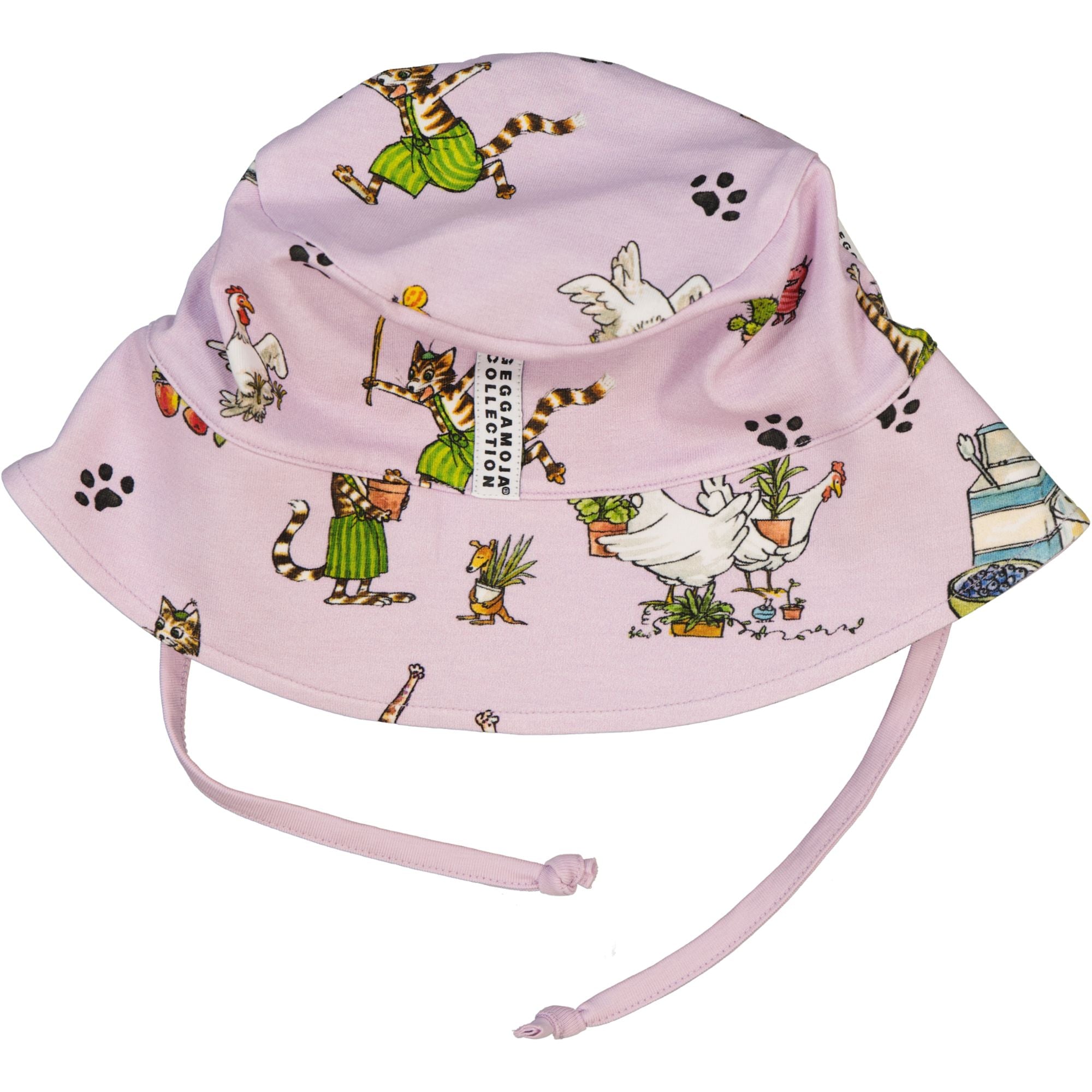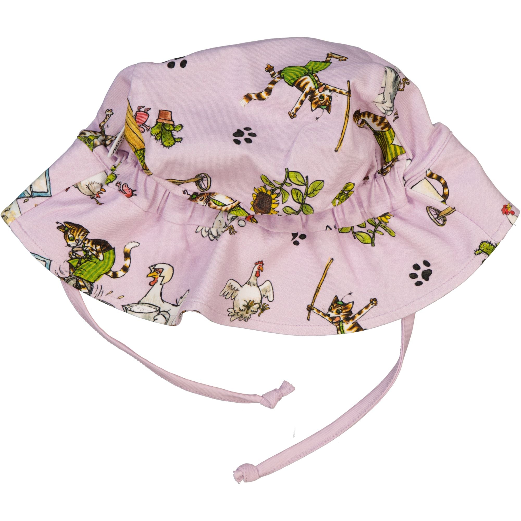 Ein Sonnenhut aus weicher, kühler Baumwolle mit Pettson und Findus. Der Sonnenhut hat Bänder zum Binden unter dem Kinn und einen Gummizug hinten für die beste Passform.