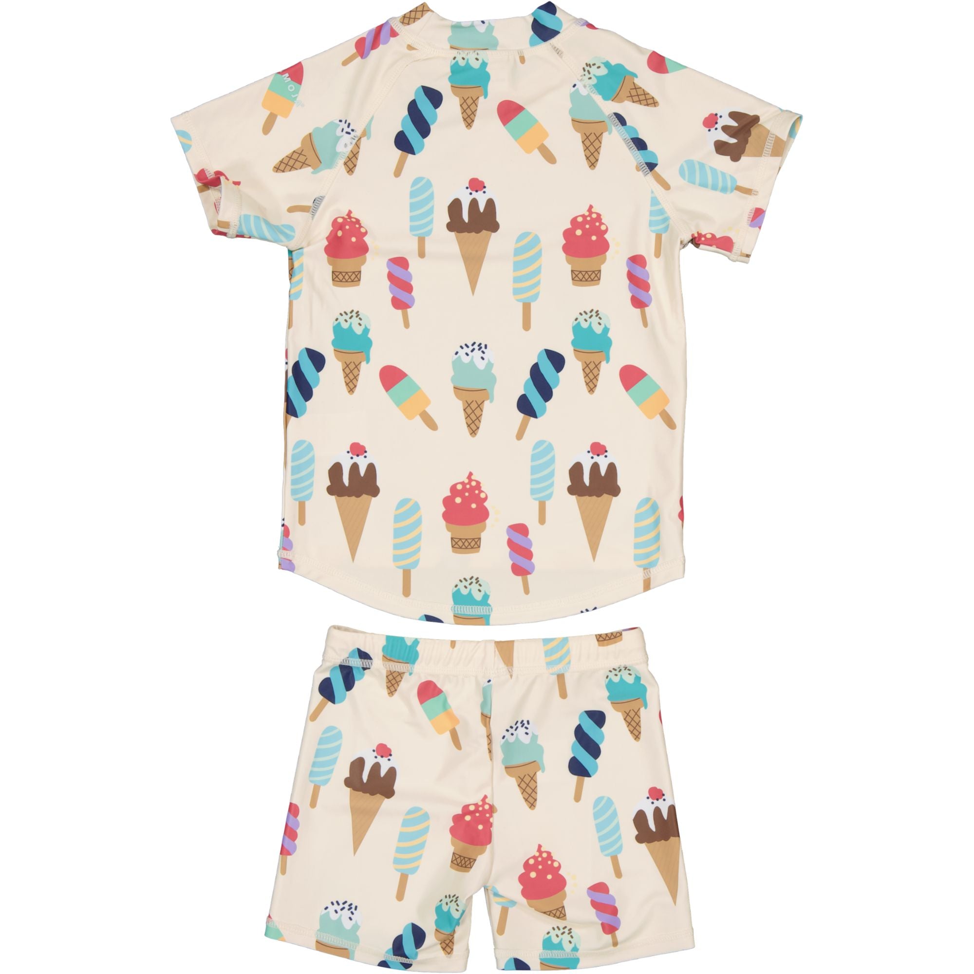 UV set with a short-sleeved shirt and short swim trunks. The trunks have an elastic waistband and a drawstring. The product meets the standard, EN 13758-1