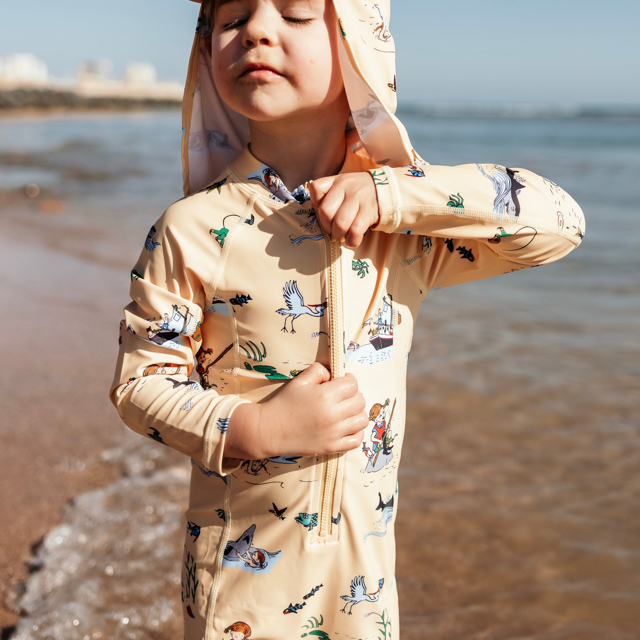 UV suit with Pippi design, featuring short legs and long sleeves to protect your child from the sun's rays. It is practical and useful with a front zipper. A big favorite among families with children due to its simplicity and sun protection. The UV suit is made from a quick-drying material with UV-50+ that blocks 98% of the sun's harmful UVA and UVB rays. The suit has a front zipper for easy dressing and undressing.