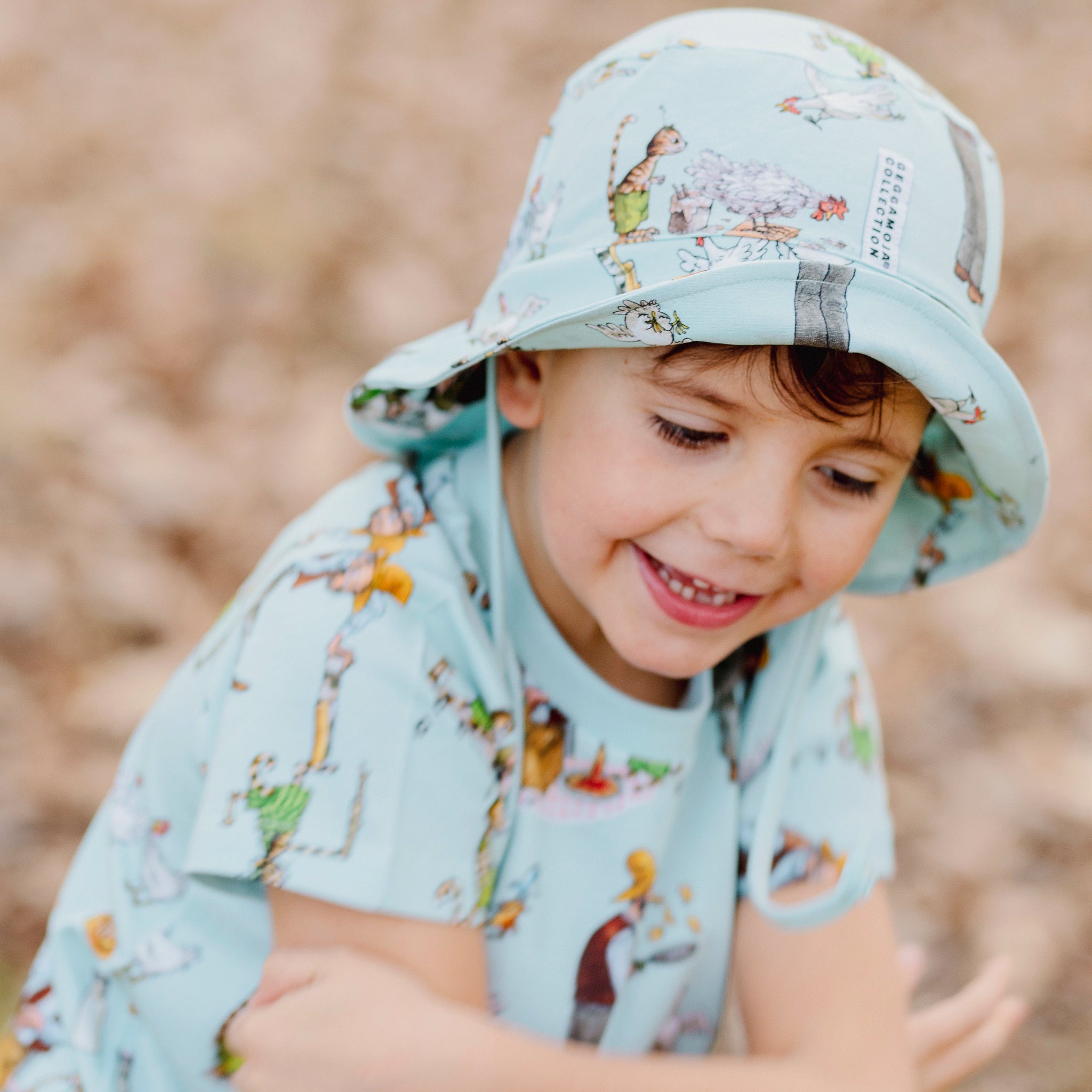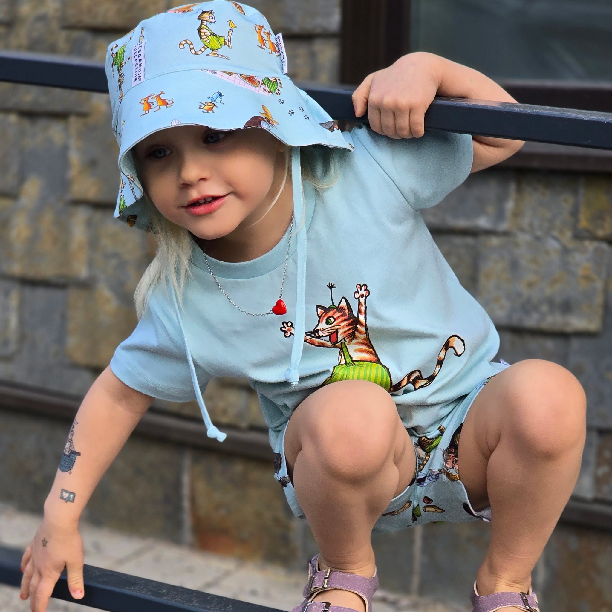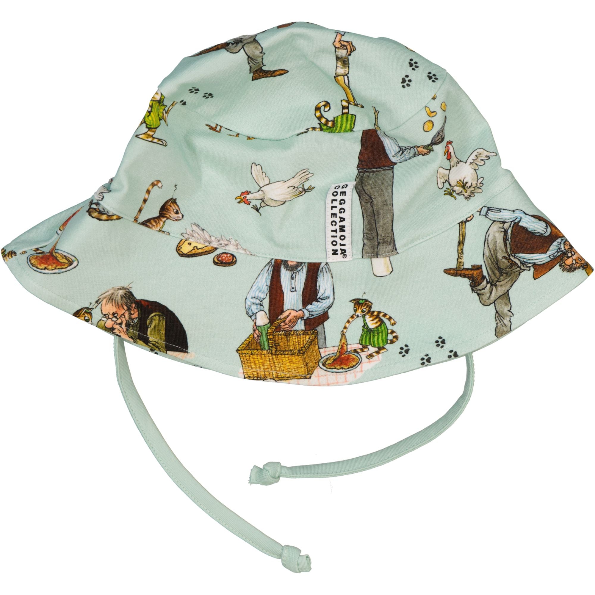 A sun hat in soft, cool cotton by Pettson and Findus. The sun hat has strings to tie under the chin and elastic at the back for the best fit.