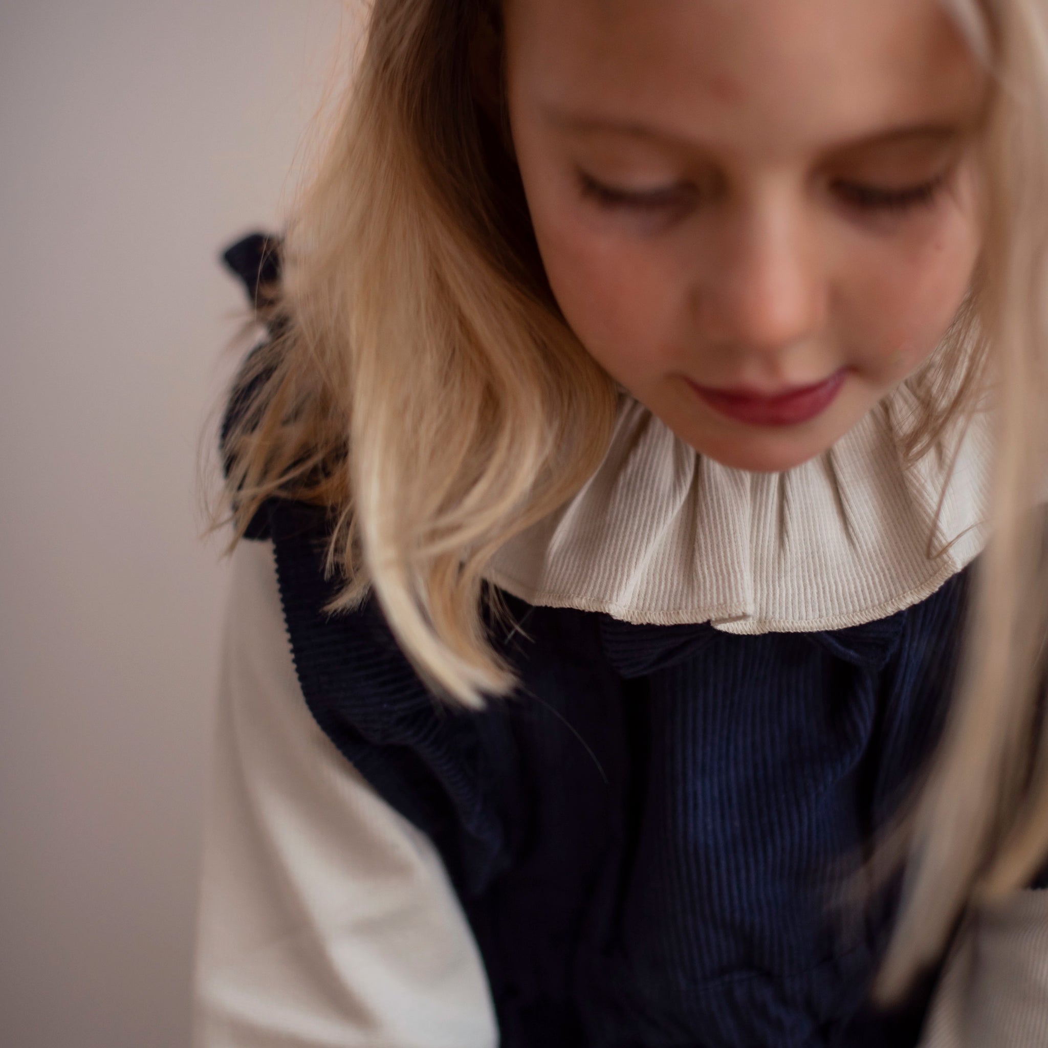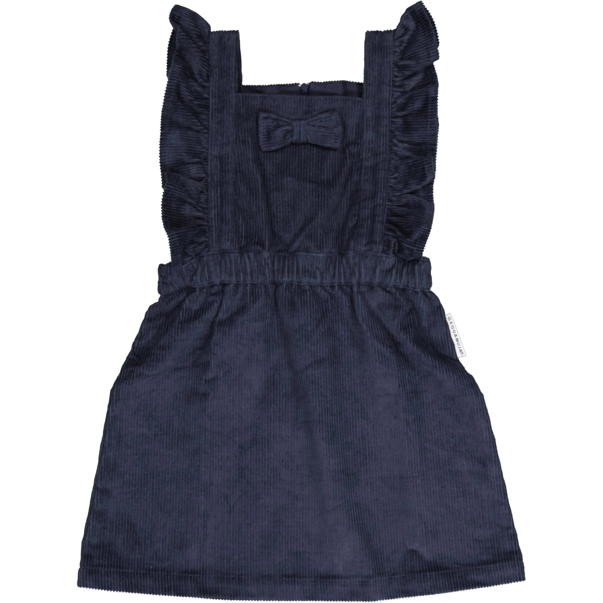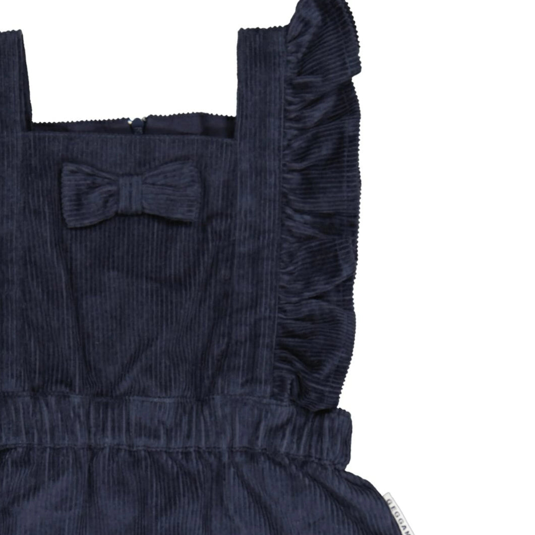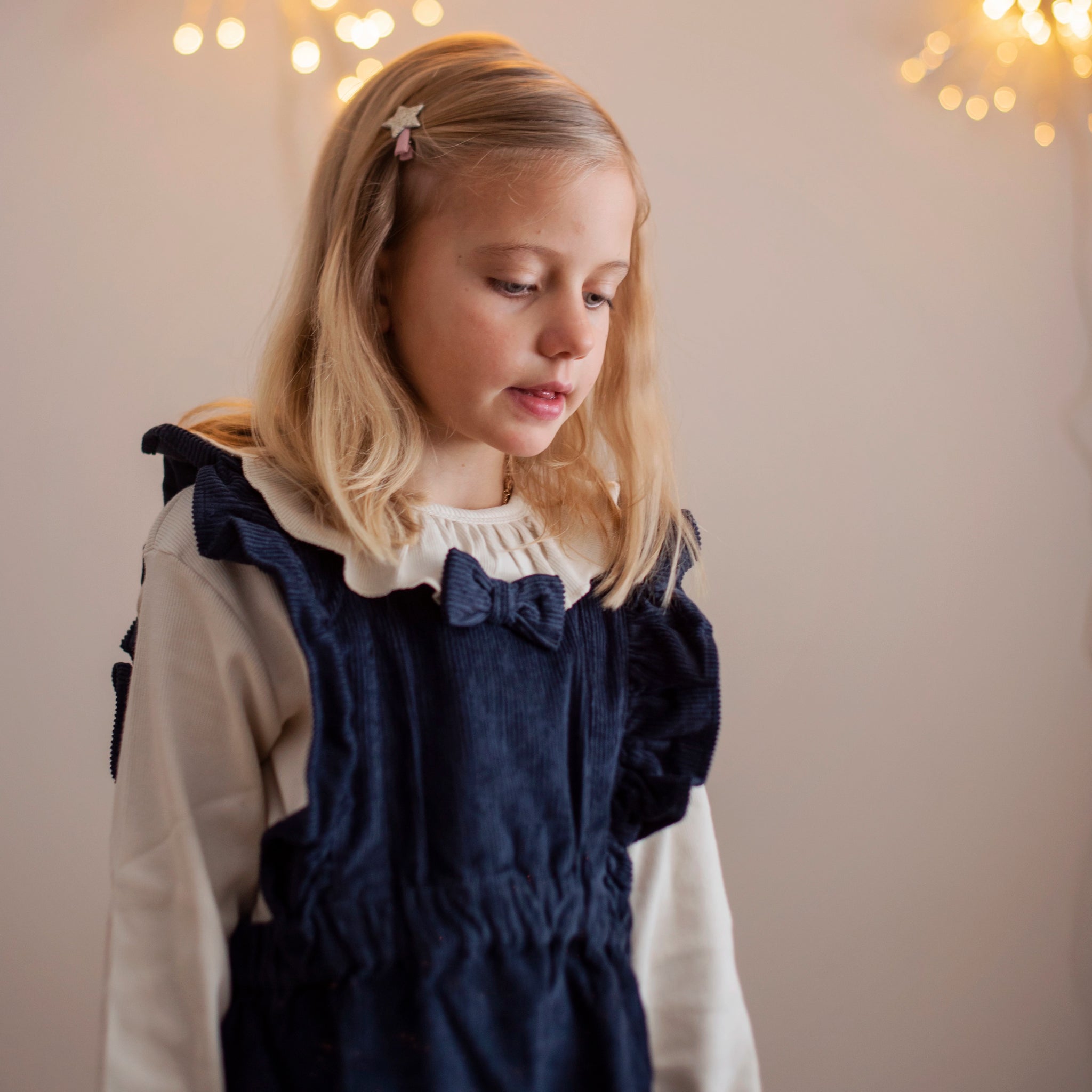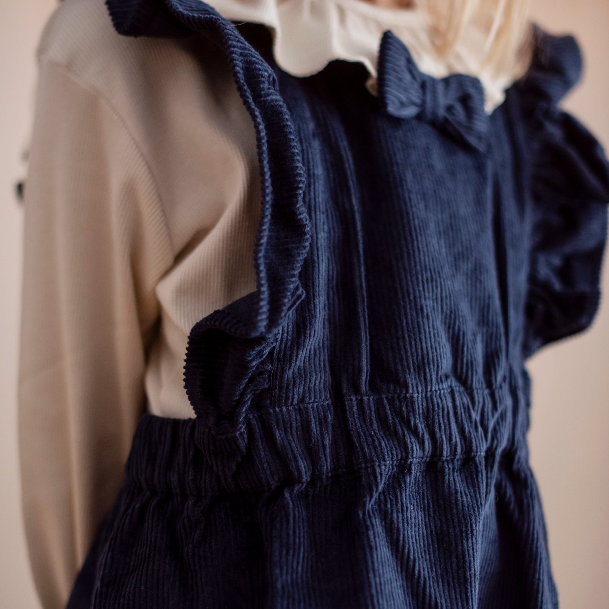 Navy blue suspender dress in organic GOTS cotton. Looks great with a beige ruffled sweater underneath or a white shirt.