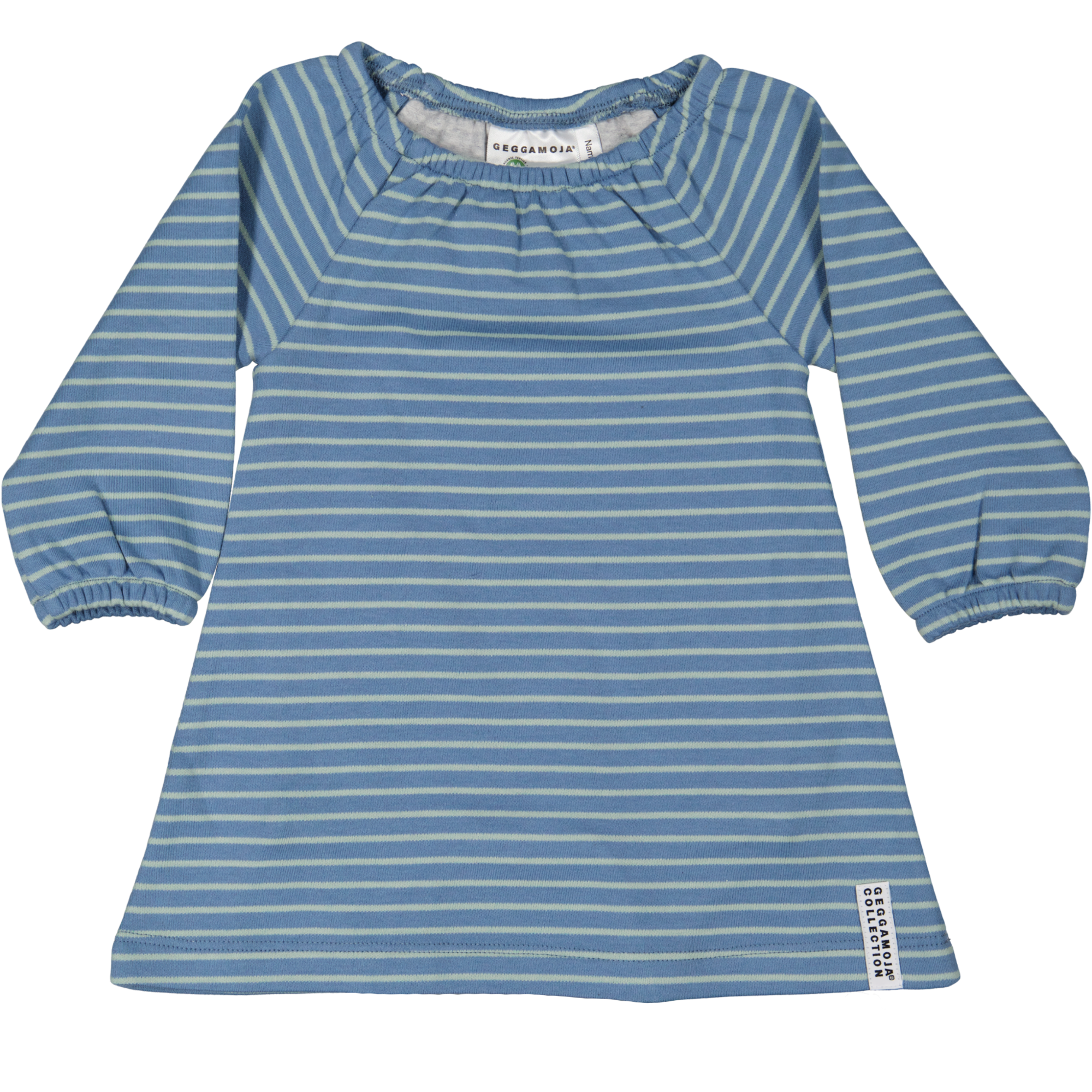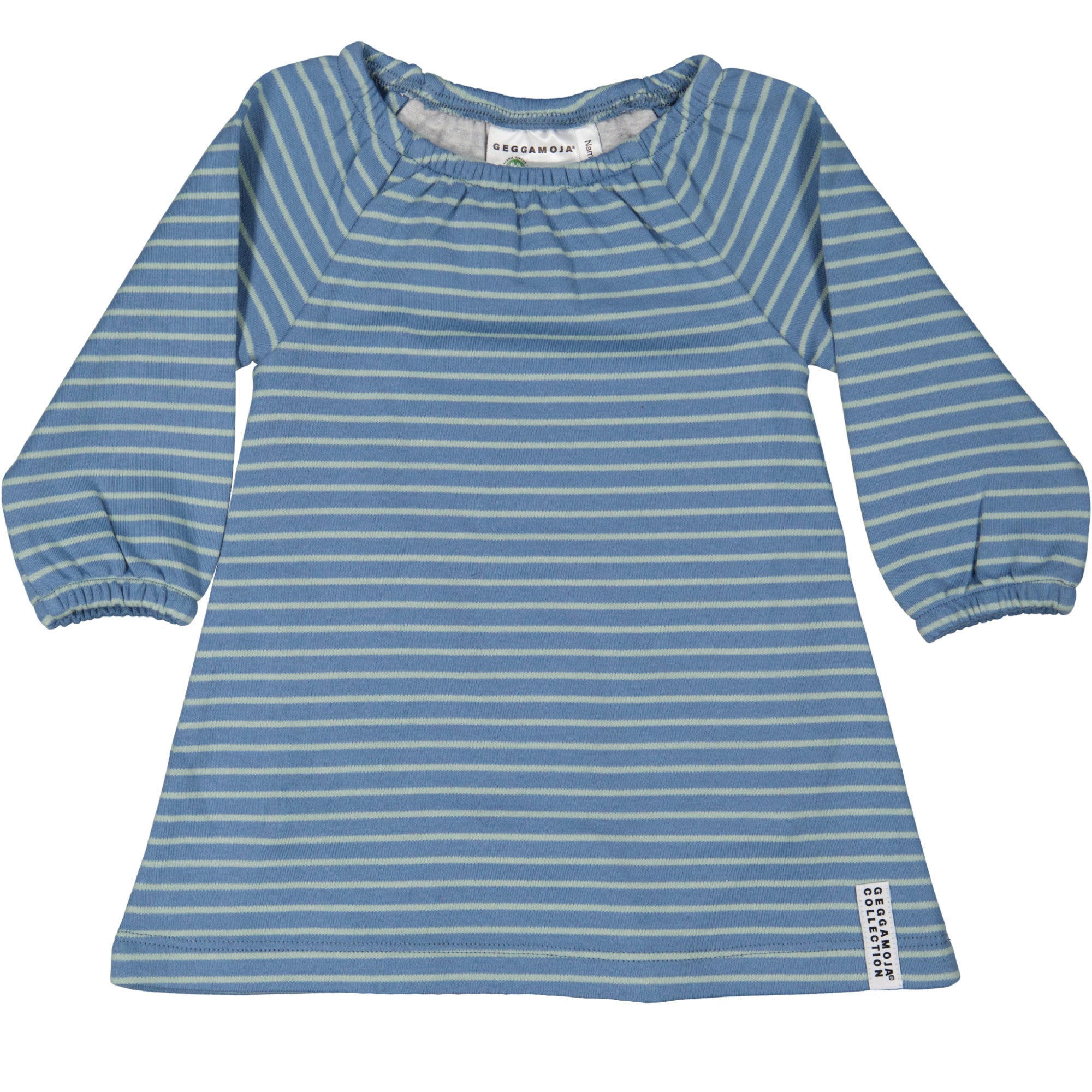 Long-sleeved dress with singoalla sleeves in blue and green striped cotton. A classic wardrobe favorite of many Geggamoja customers. The singoalla dress is practical all year round and has a sewn-in body in sizes 50/56 and 62/68.