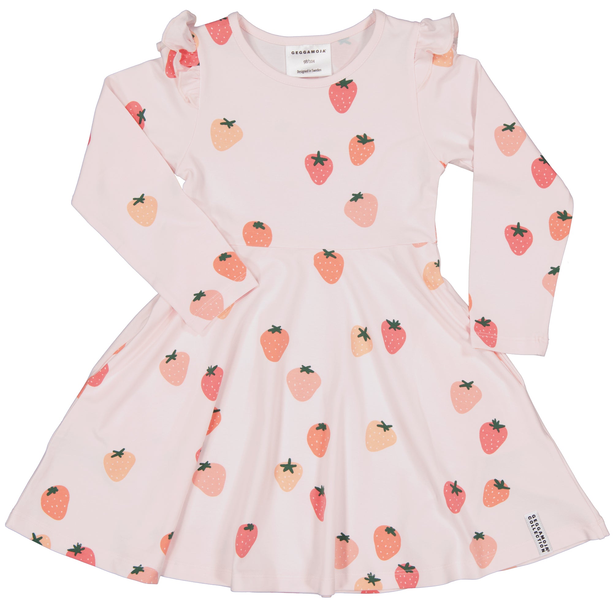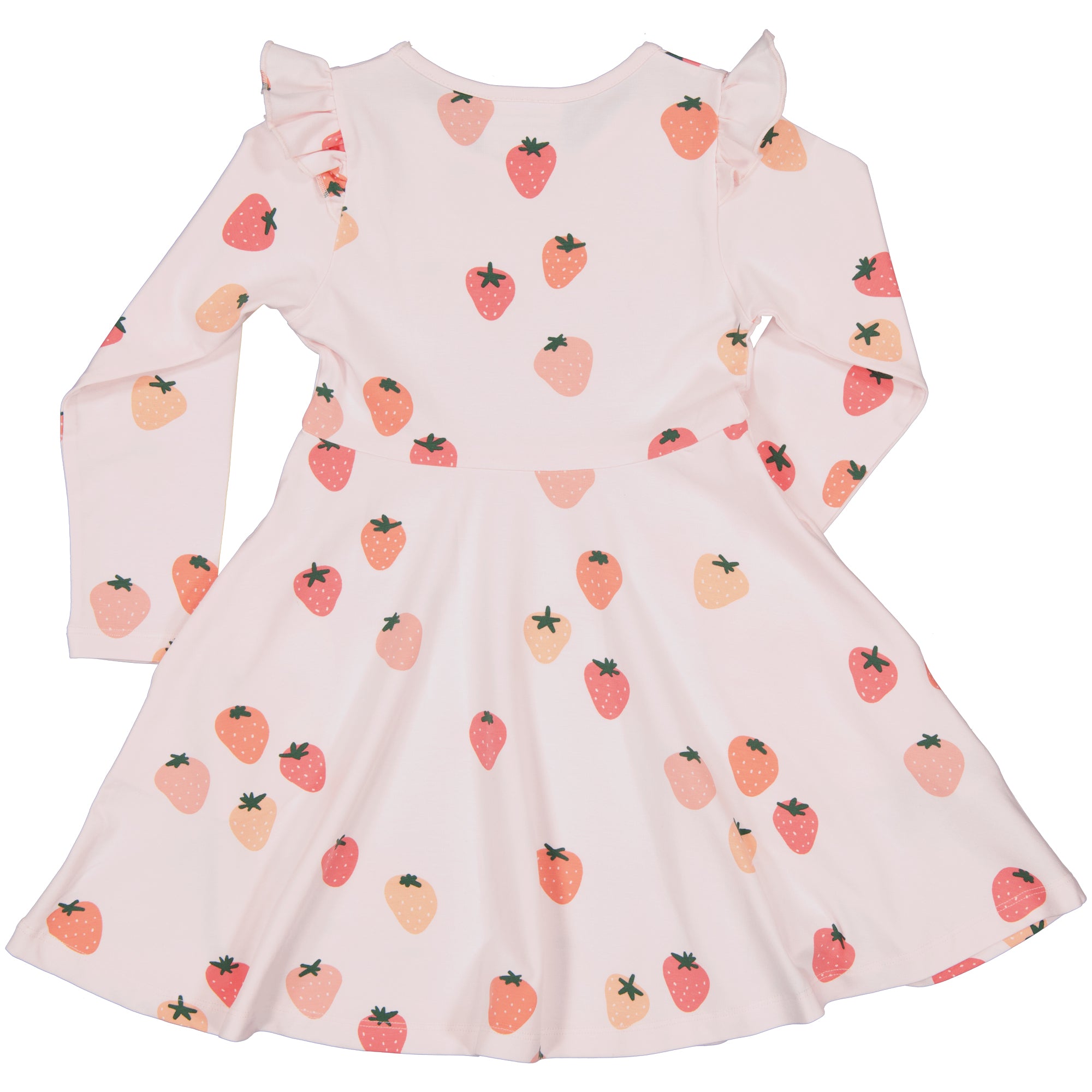 Langermet kjole med vid skjørtedel. Volang på skuldrene.