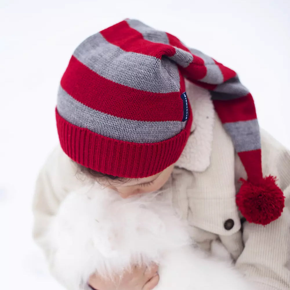 Søteste nisselua i rødt og gråstripet for julens alle små og store nisser. Finnes i alle størrelser så hele familien kan matche hverandre.