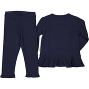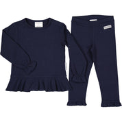 Sett med genser og leggings i økologisk bomull. Genseren har volanger ved ermekant og nederst. Leggings med volanger ved benkant og justerbar hullstrikk i midjen.
